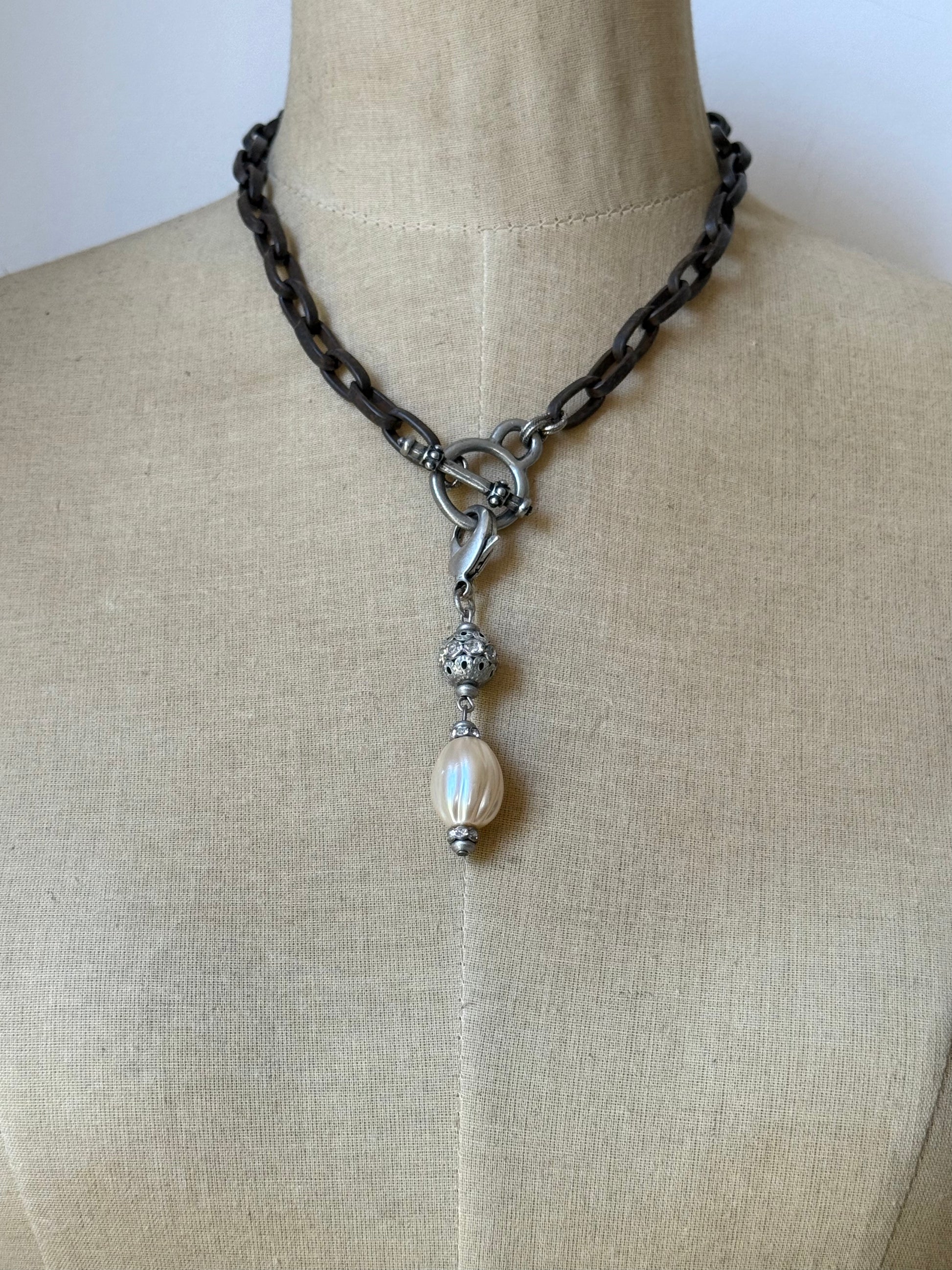 the necklace features a pendant made from a ribbed faux pearl with a slightly aged look, surrounded by sparkling rhinestone rondelle beads. it’s topped with an ornate filigree piece in antique silver, also adorned with tiny rhinestones for a subtle shimmer. the pendant hangs from a chunky, rustic brown chain that gives a warm, earthy contrast to the cooler silver tones. it fastens securely with a large silver-plated lobster clasp connected to an old world toggle clasp in antique silver, adding a touch of timeless charm to the overall design.