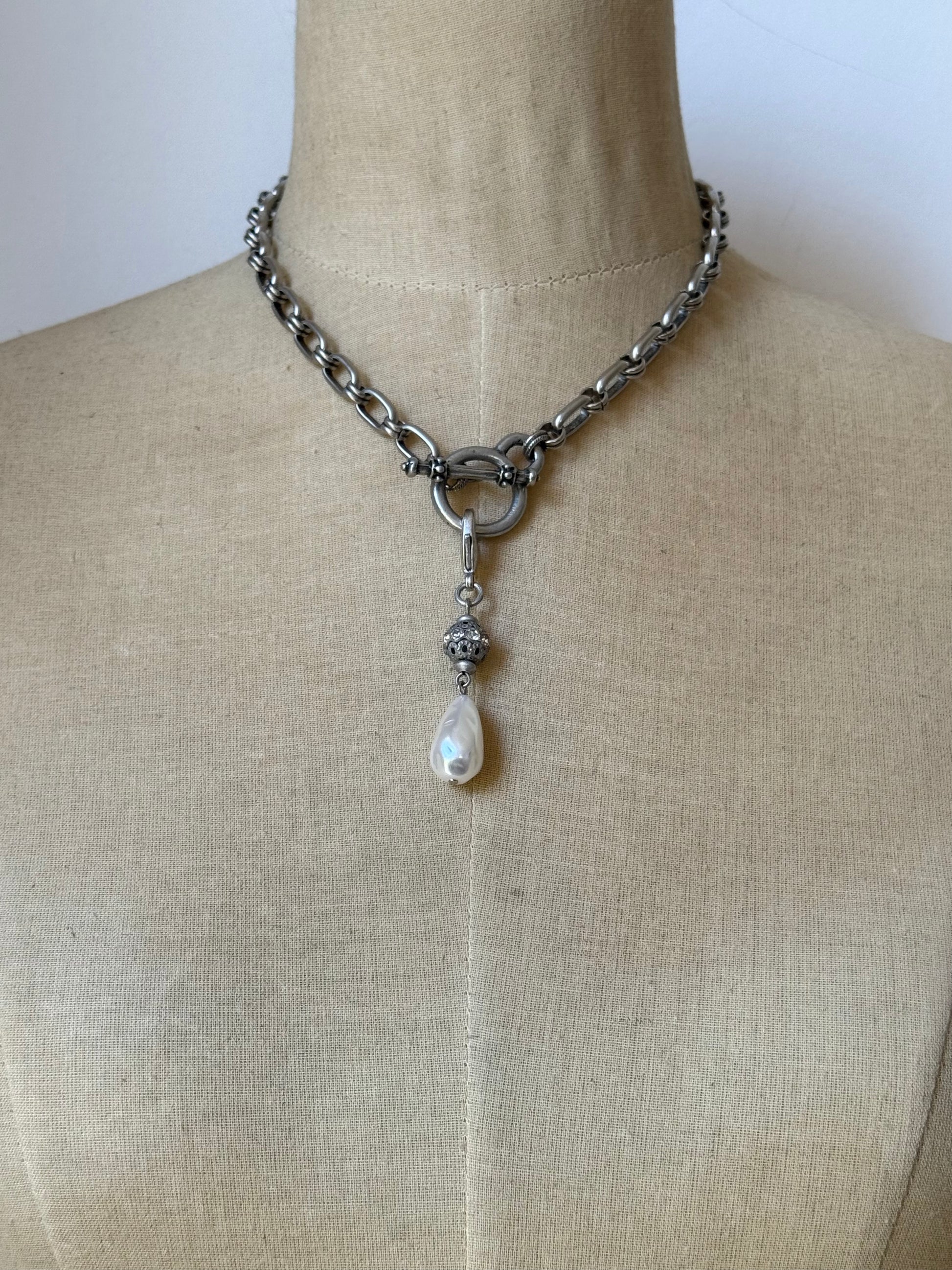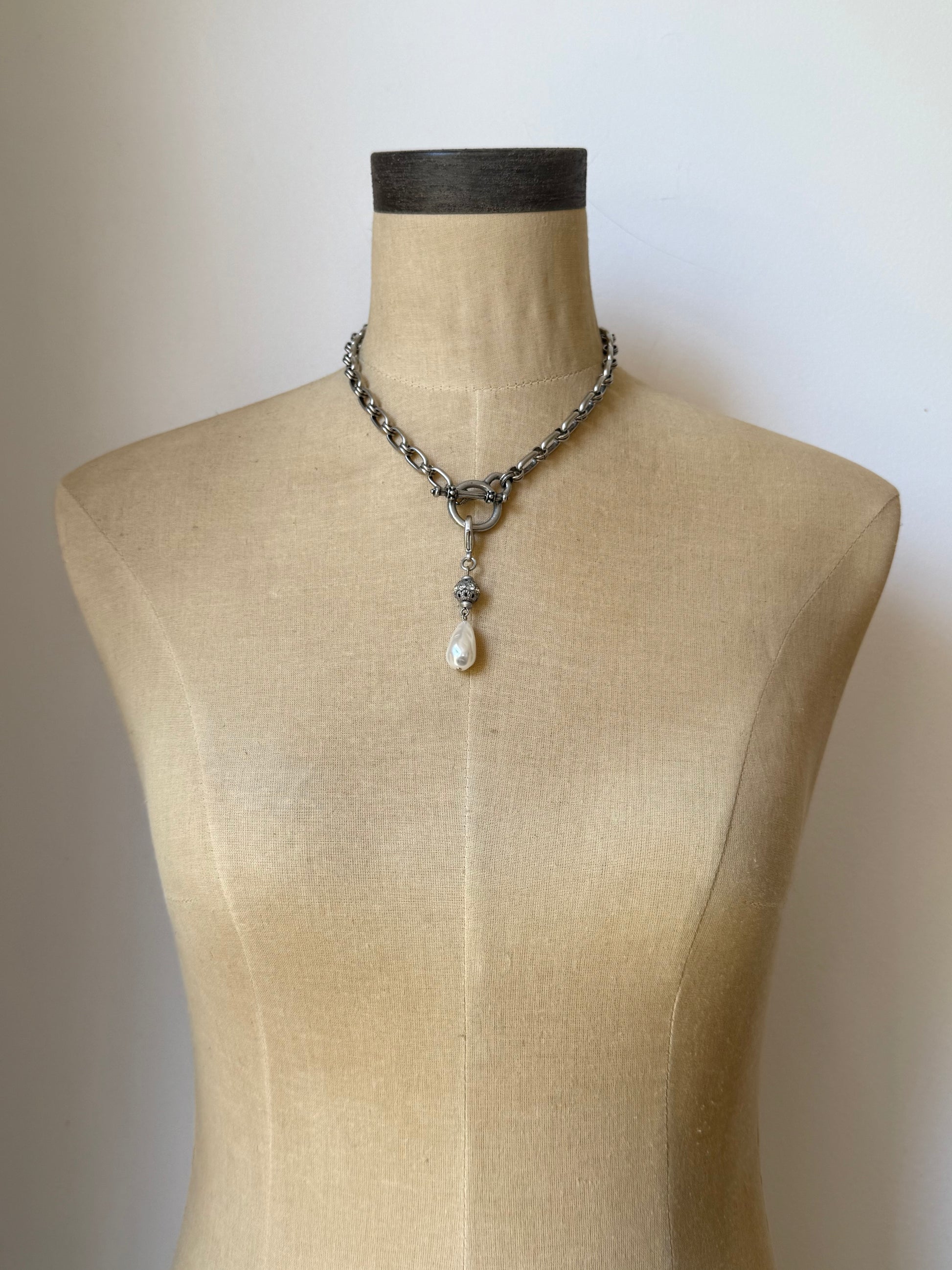 this necklace features a sweet pendant made from a vintage japanese faux teardrop pearl, accented with a small vintage-style antique silver filigree bead set with rhinestones. the pendant is attached by an antique silver-plated lobster claw to an old world-style toggle clasp. an antique silver oval chain with alternating long and short links adds texture and character to the design, giving it a soft, timeless charm.