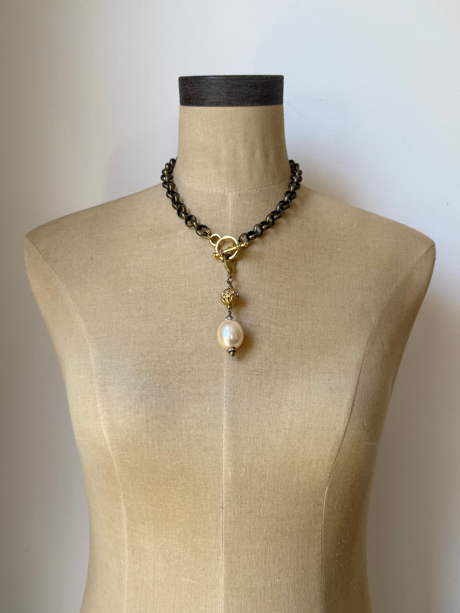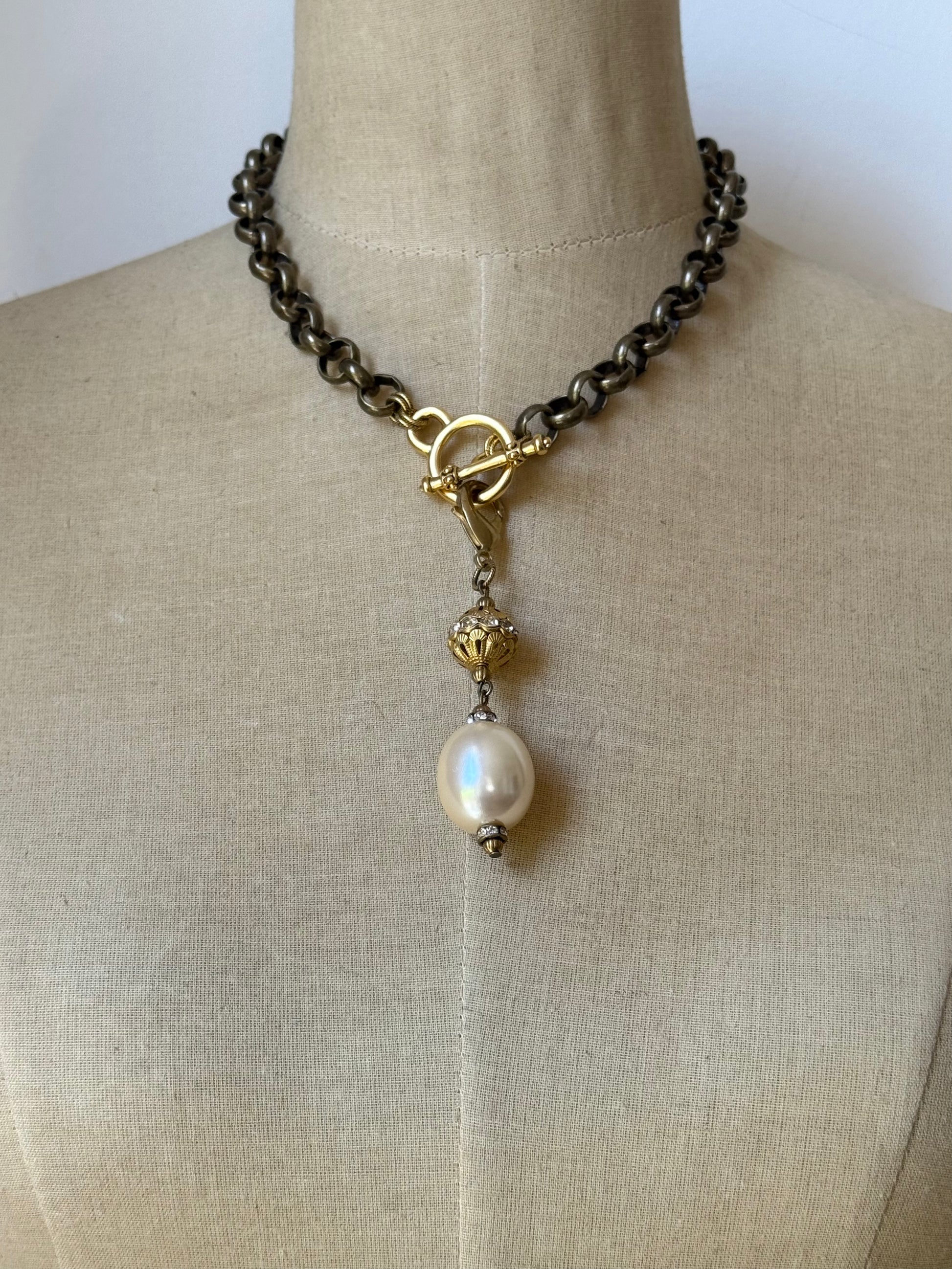 a lovely necklace featuring a large japanese faux pearl, accented by vintage rhinestone rondelle beads and a vintage-style gold rhinestone filigree ball. the piece is completed with an old world style 12-carat gold plated lobster toggle clasp. the chain is a bold, chunky rollo style in antique bronze.