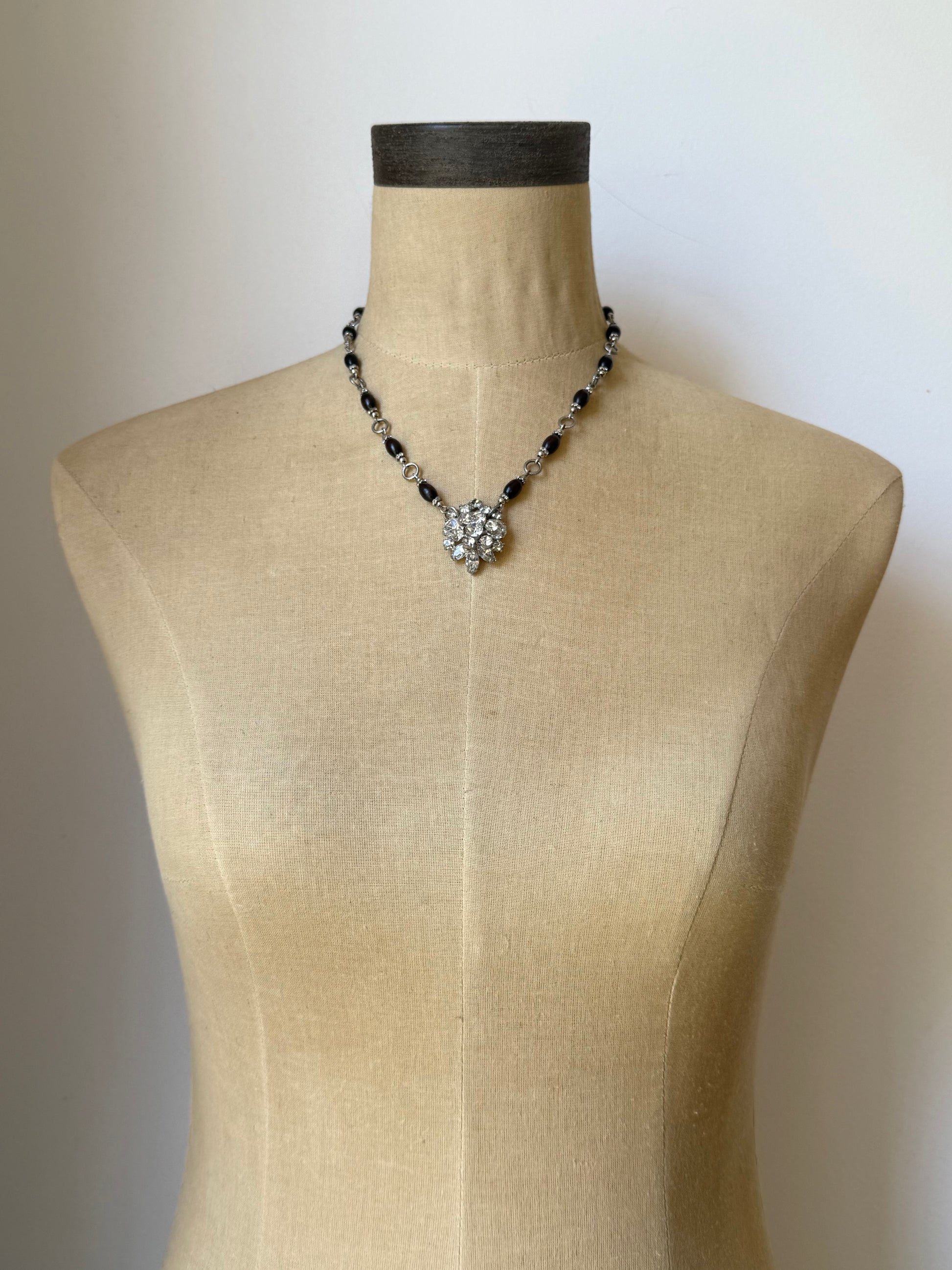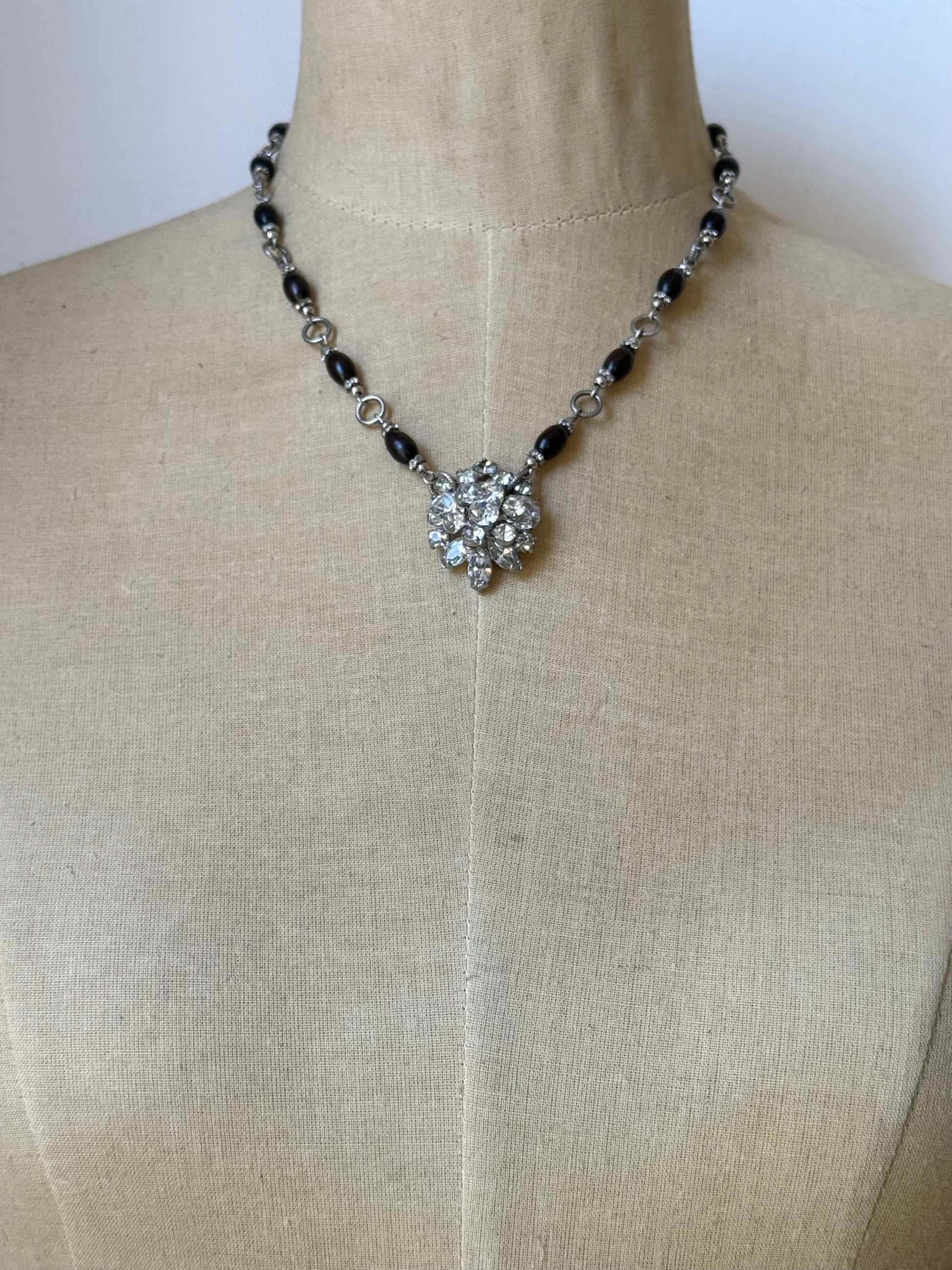 vintage juliana* clear rhinestone repurposed earring attached to handmade chain with vintage French dark wood rosary beads accented with rhinestone rondel beads.