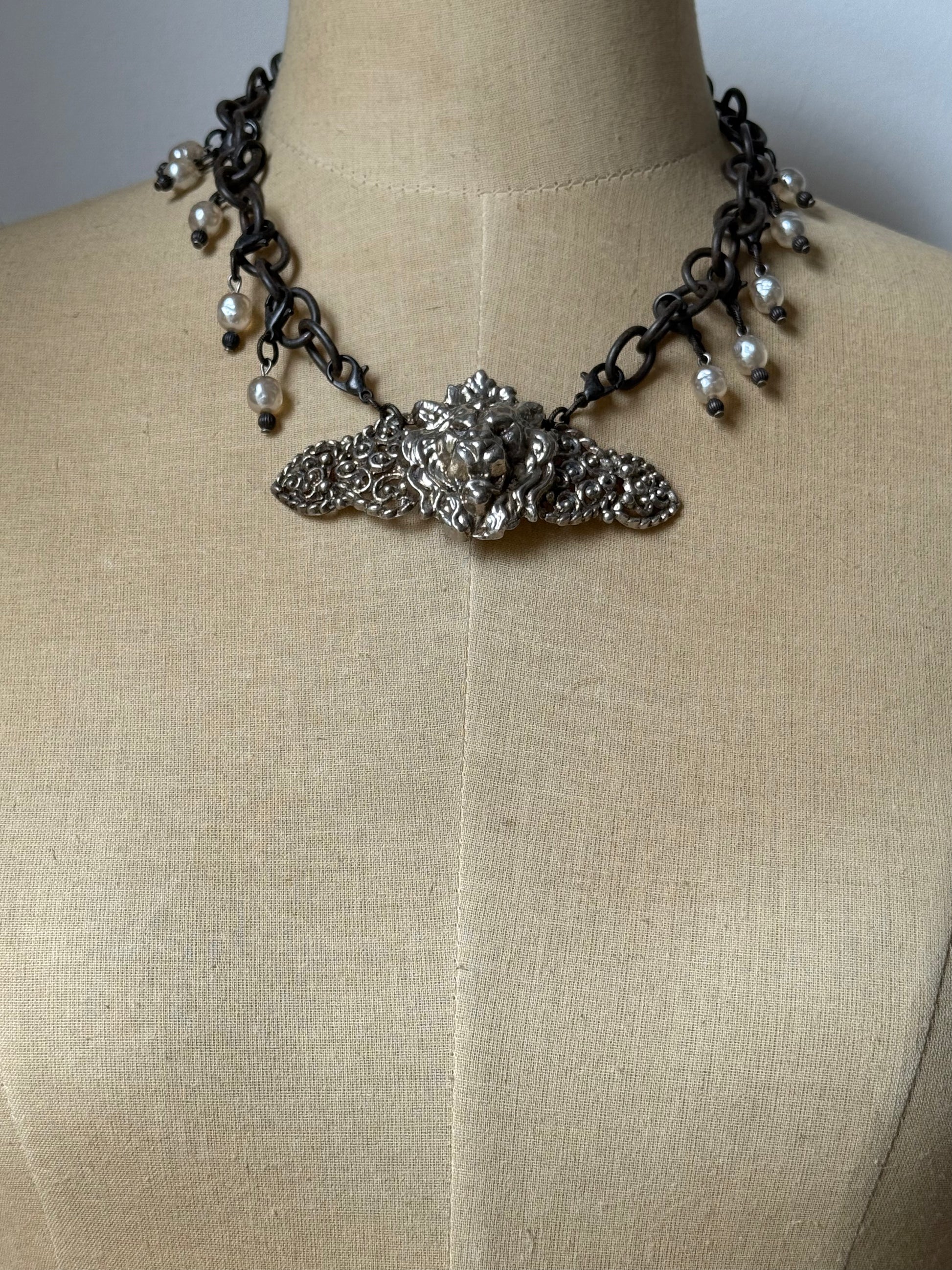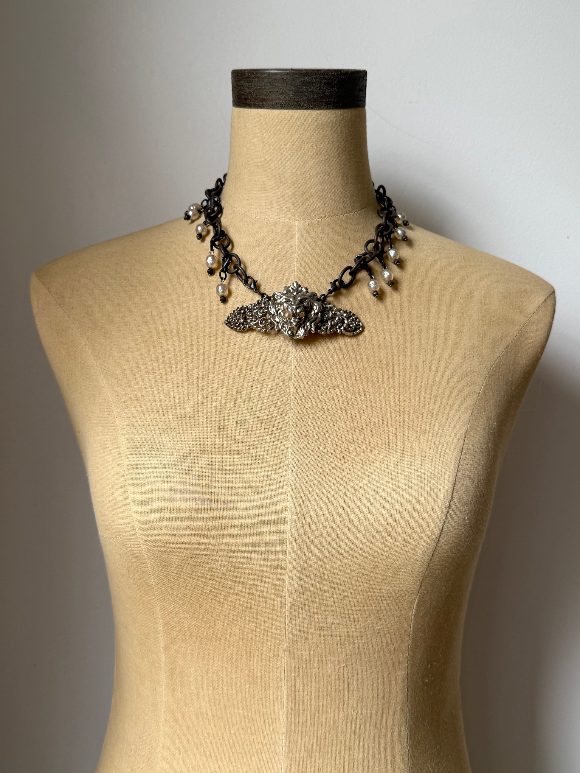 vintage lion barrette attached to rustic brown chain accented with rare vintage miriam haskell* translucent class pearl beads.