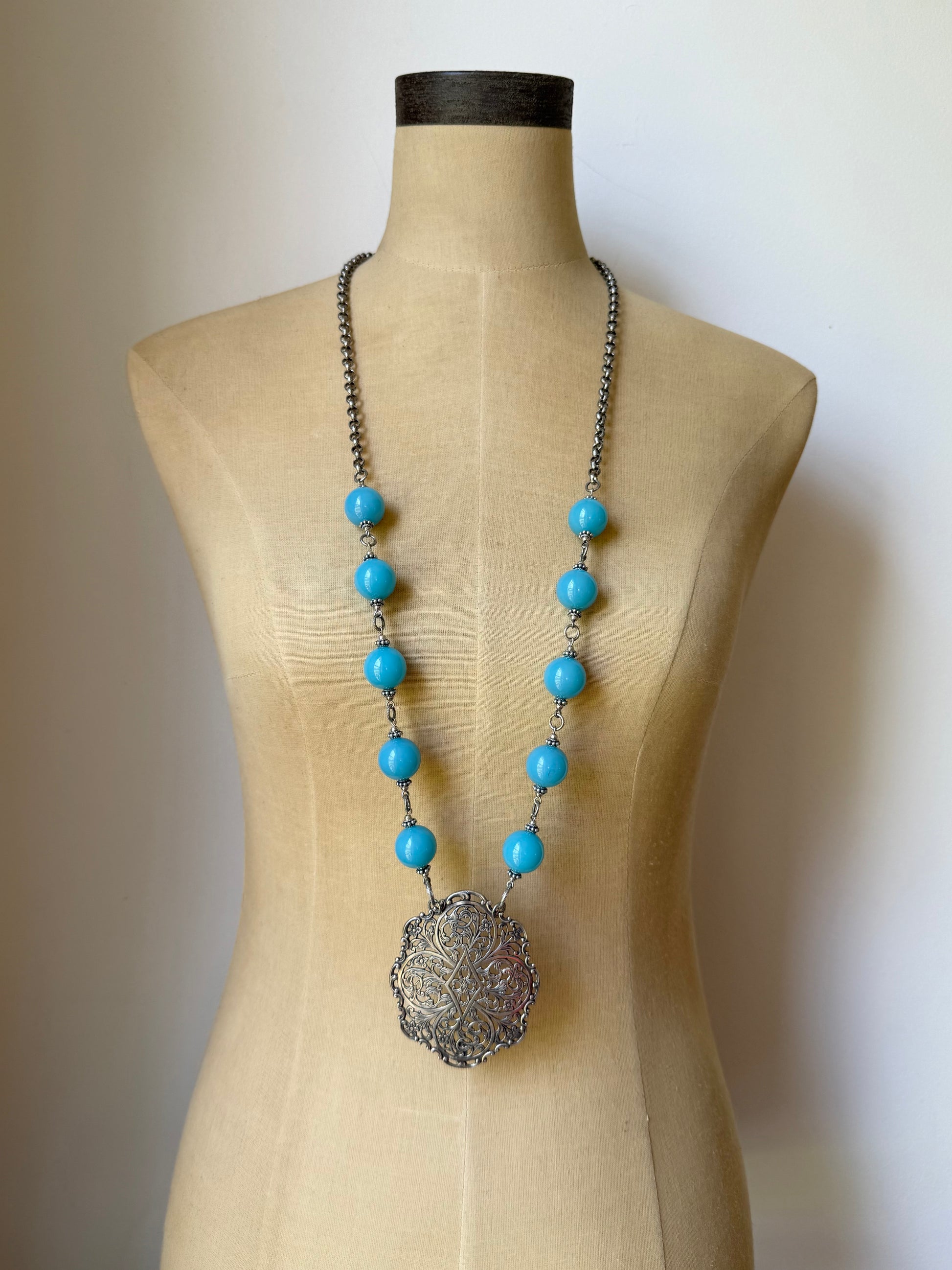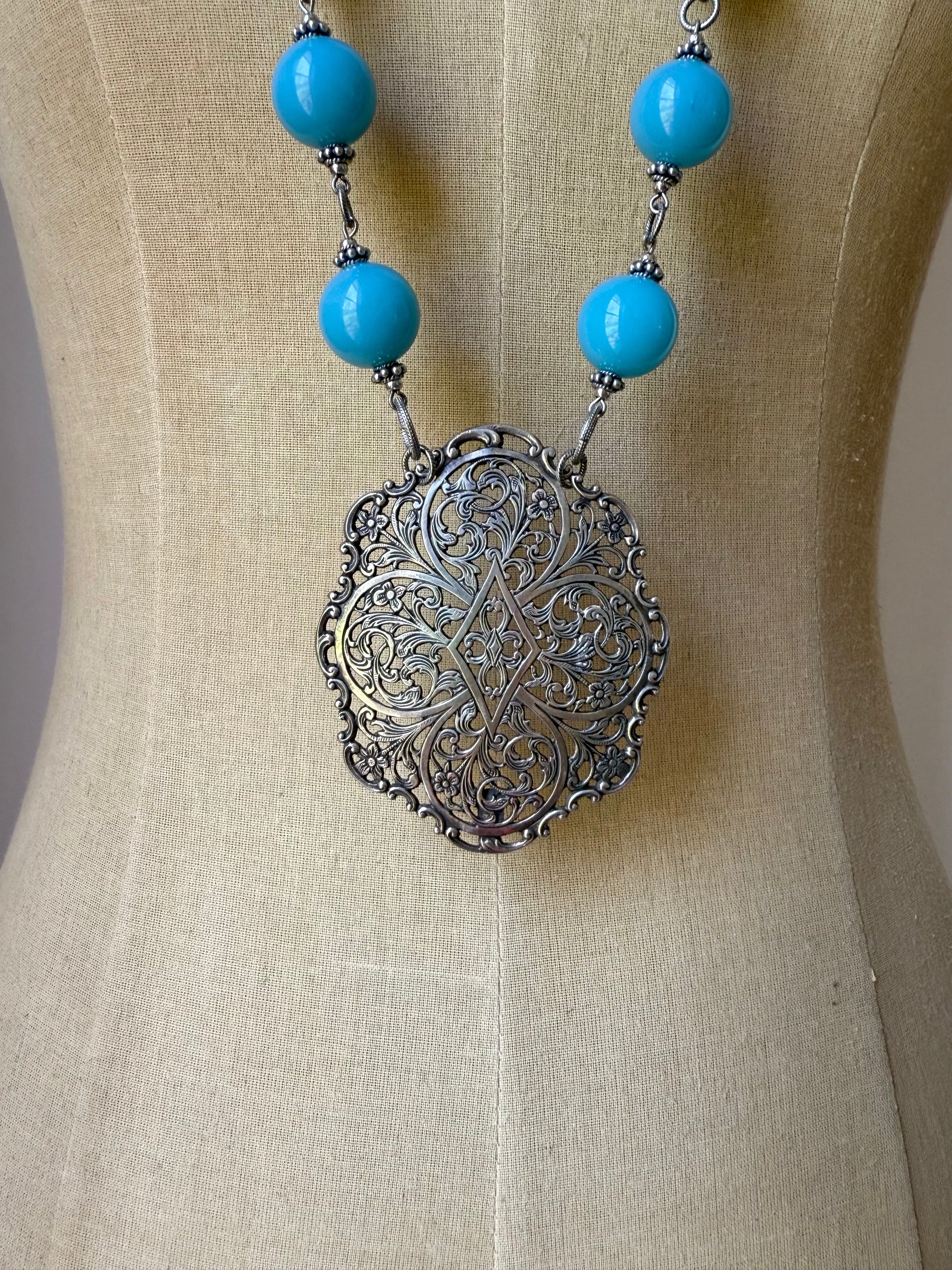 large oversized silver oval brooch from the early 1900s, echoing victorian-era craftsmanship, now transformed into a striking pendant. adorned with intricate floral engravings, the brooch serves as the heart of the piece, marrying the elegance of a bygone era with a modern twist. suspended from a handmade chain crafted with dreamy turquoise-y sky blue lucite beads, each bead is embraced by silver-plated caps that lend a soft shimmer and vintage charm. the necklace is completed with an antique silver-plated textured rolo chain and secured with an old world toggle clasp, evoking a sense of timeless romance. an artful fusion of heirloom beauty and handmade expression. designed for versatility, it can be worn long as a dramatic statement or doubled at the neck for a shorter, choker-style pendant look—shifting effortlessly between bold elegance and refined charm.