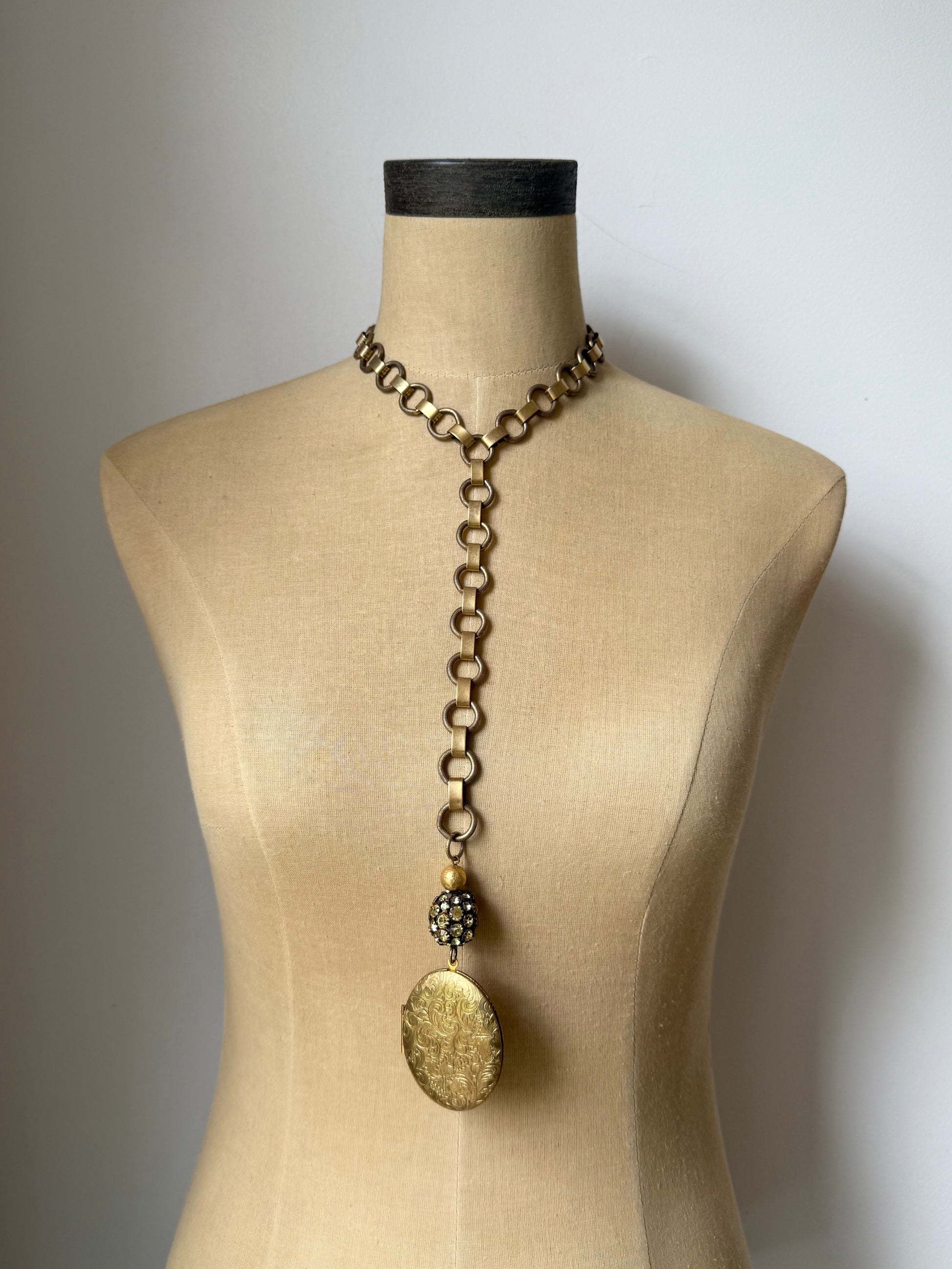 vintage etched oval locket adorned with warmed colored plated rhinestone bead and hammered gold plated bead. attached to antique gold chain