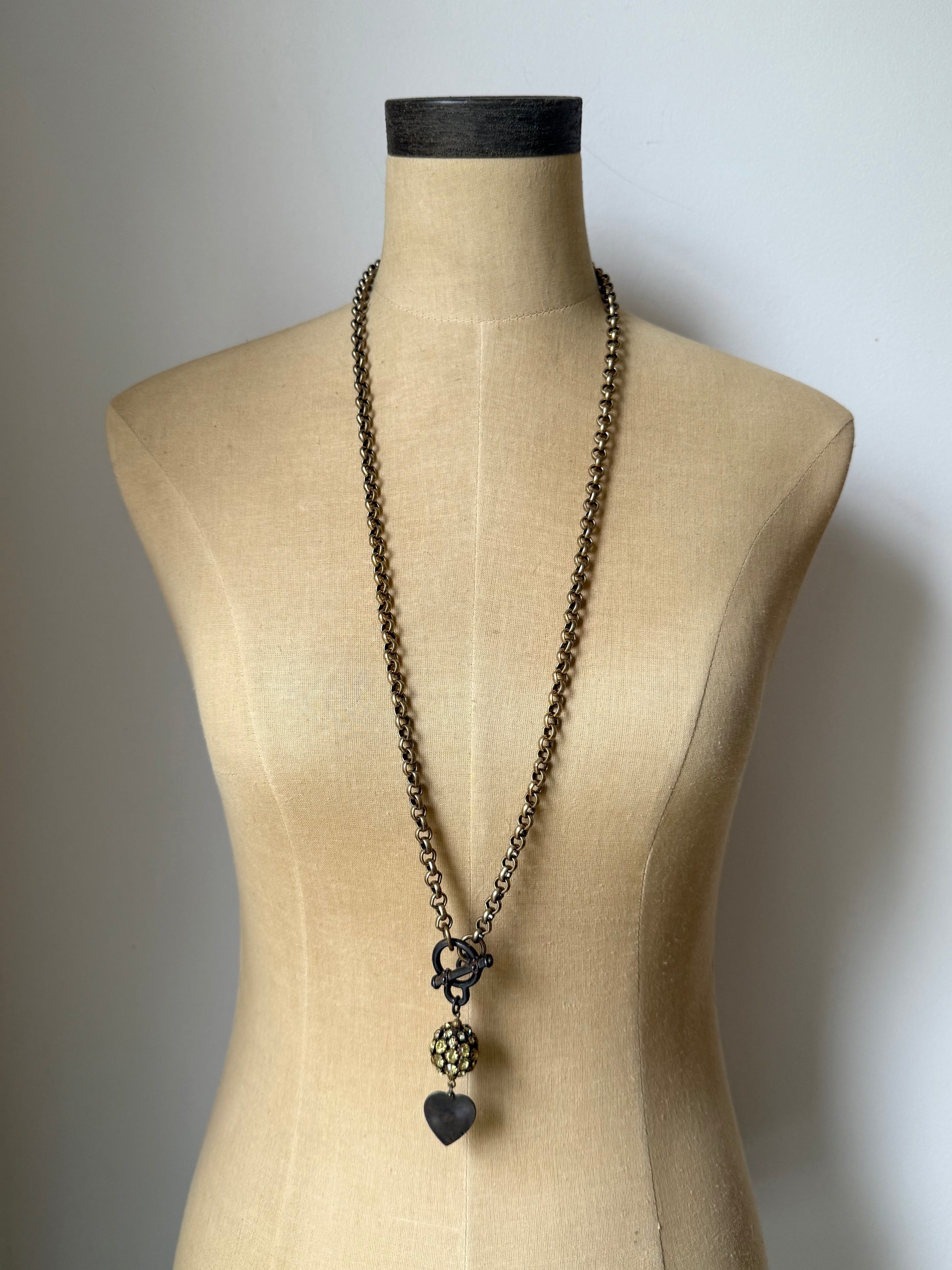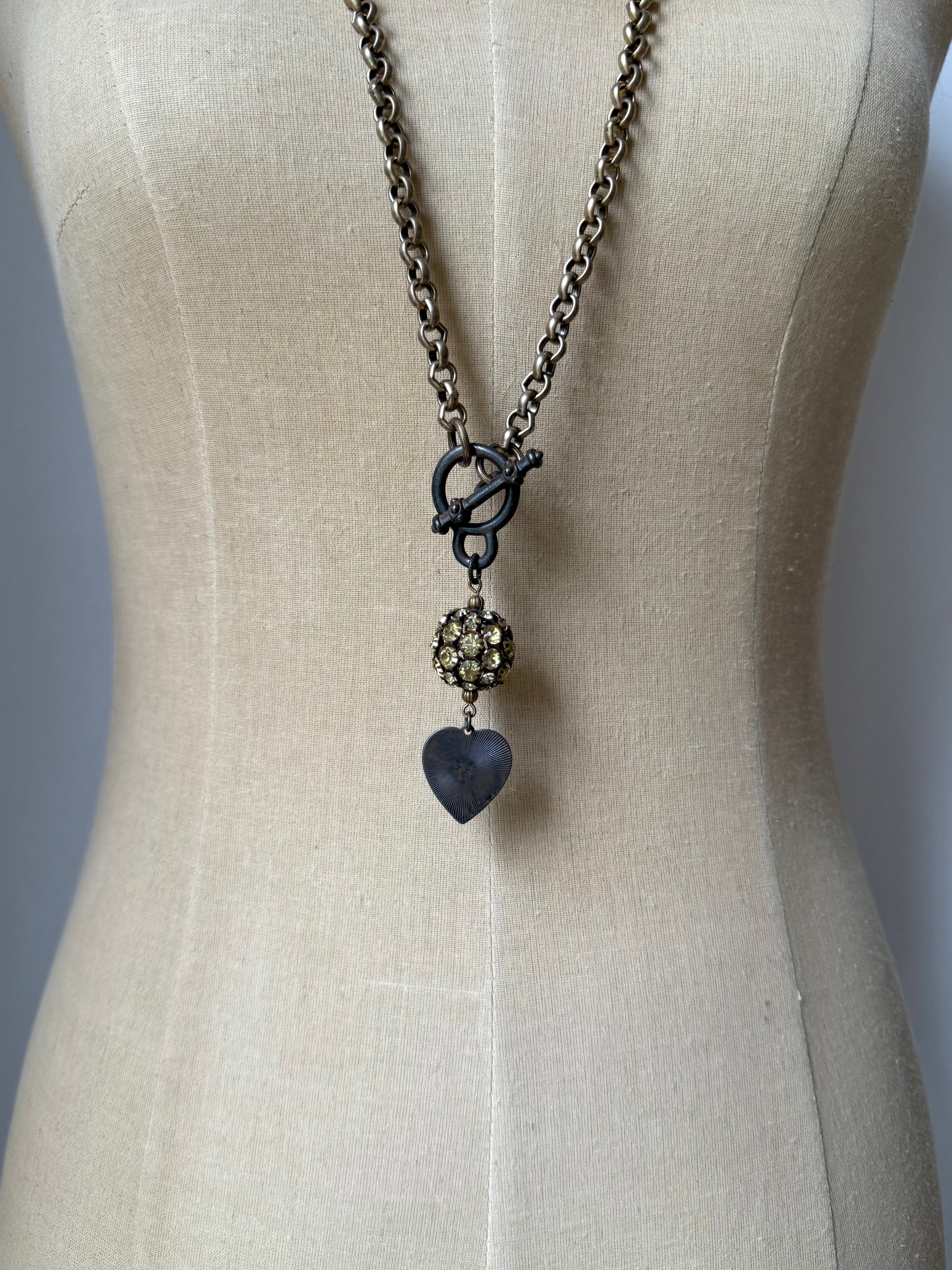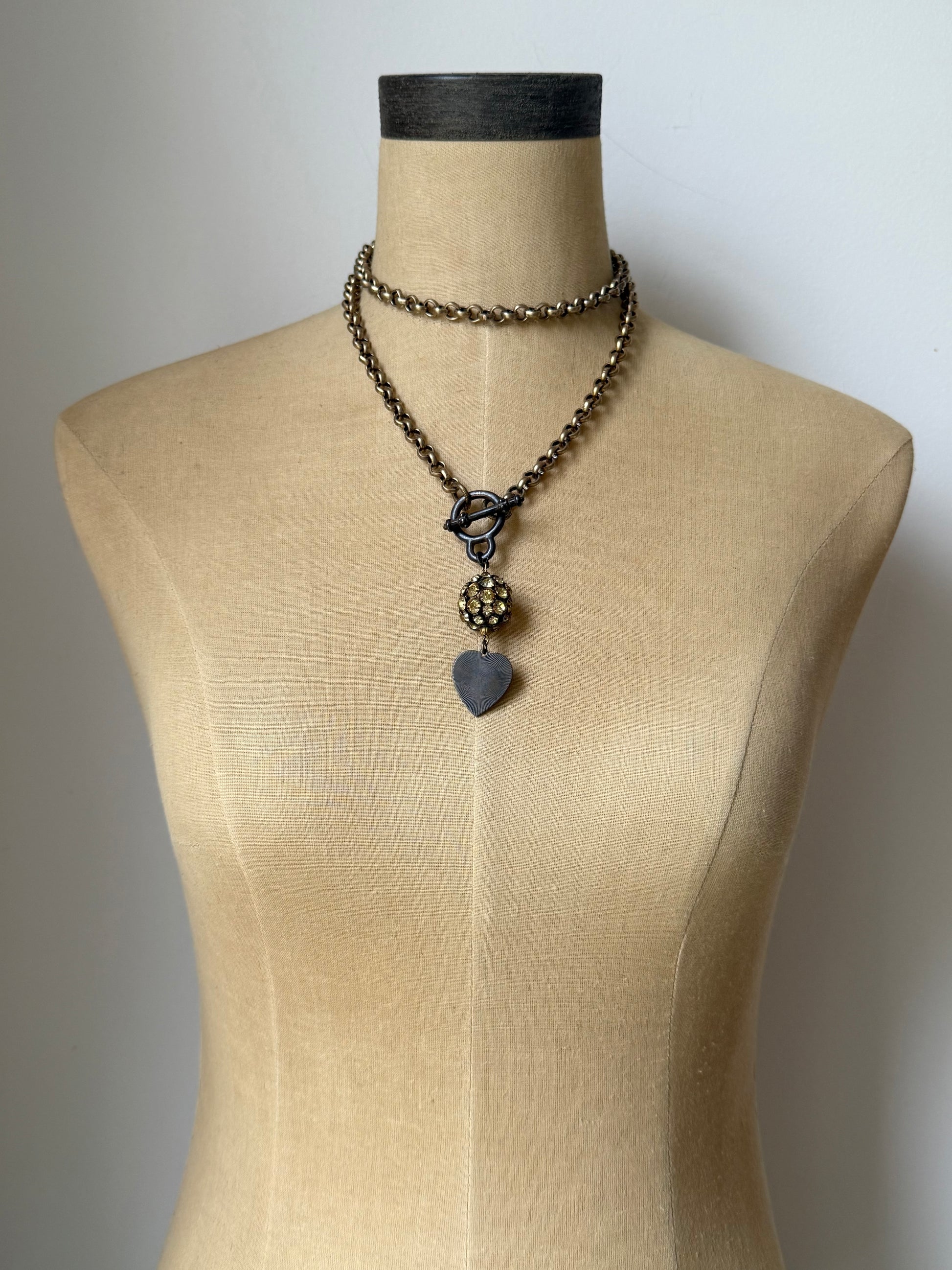 a charming handmade necklace featuring a vintage-inspired design with rich, thoughtful details. the pendant showcases a vintage round ball made entirely of sparkling rhinestones in a warm yellowish tone, casting a gentle, golden shimmer. paired with it is a sweet, rustic brown ribbed heart that adds an earthy, romantic touch. both elements are attached to an old-world style toggle clasp in a weathered brown finish, which connects seamlessly to a long antique brass roller chain. the chain offers styling versatility—worn long for a graceful silhouette or doubled for a layered, intimate look. a delicate balance of vintage sparkle and rustic warmth.