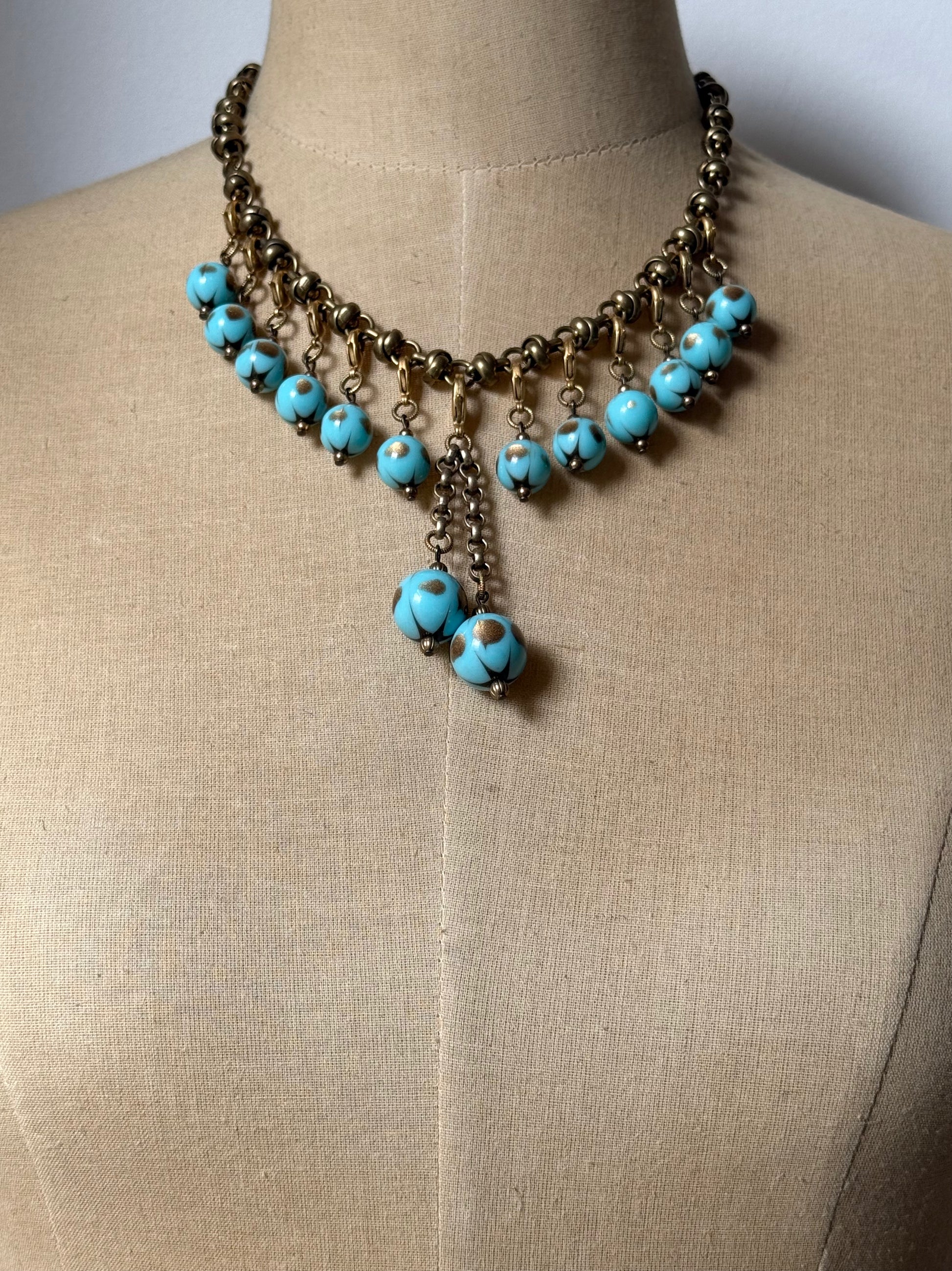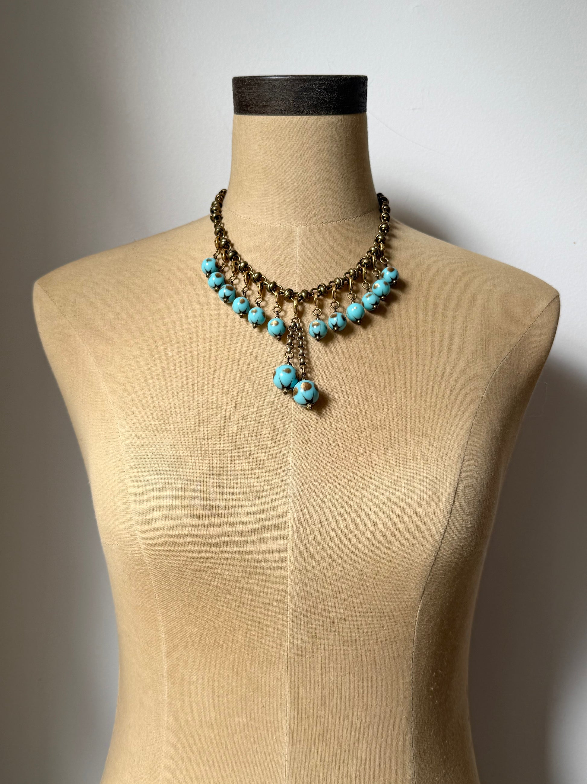 a beautiful handmade necklace crafted with an antique brass patina chain, rich in vintage charm and character. the chain features intricate knots and round links, lending a timeless elegance to the design. a striking long pendant, made from repurposed and re-strung 1950s to 1960s stardust necklace beads, showcases a luminous blend of turquoise and gold hues. the pendant hangs gracefully from a delicate antique brass chain, adding movement and visual interest. along the main chain, smaller turquoise and stardust beads are suspended by tiny antique brass lobster clasps, creating a subtle shimmer with every turn. a harmonious blend of nostalgia and artistry, each element tells a story of transformation and enduring beauty.