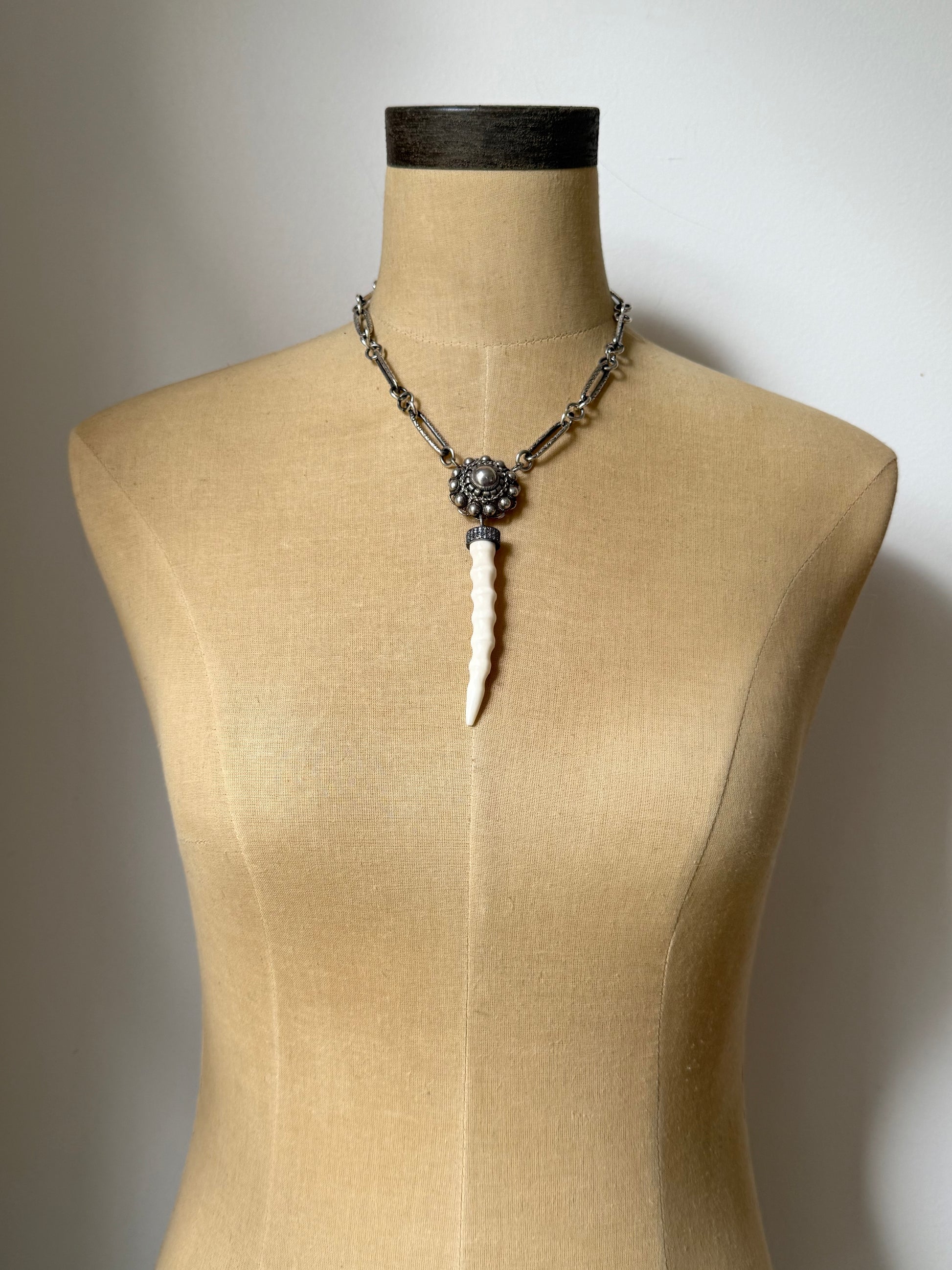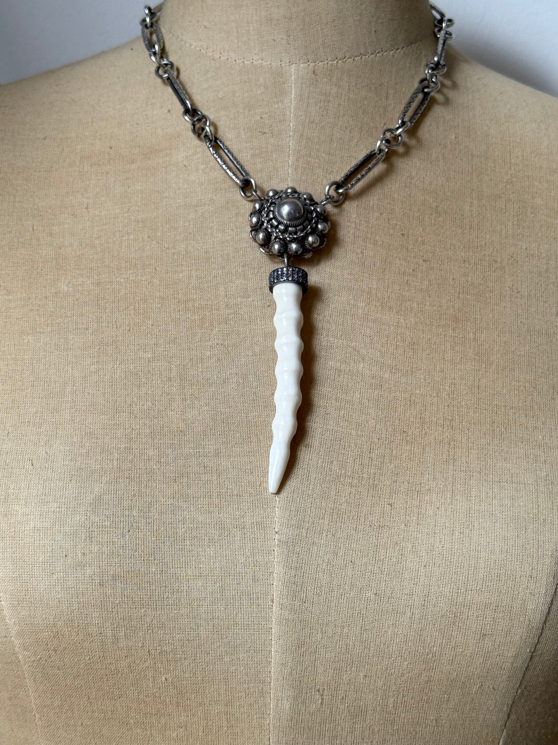a wonderful vintage sterling silver dutch button filigree brooch, crafted in holland with intricate detailing and delicate metalwork. suspended below, a carved bone horn spike capped in pavé diamonds set in oxidized sterling silver, lending a rich, textured contrast. the handmade pendant connects to an oxidized silver anchor chain, adorned with a bold, swirling pattern that echoes the antique charm of the centerpiece. the look is finished with an old world style toggle clasp in antique silver plate, adding an elegant and slightly edgy touch. full of character and timeless flair, this piece brings a little oomph to any ensemble.