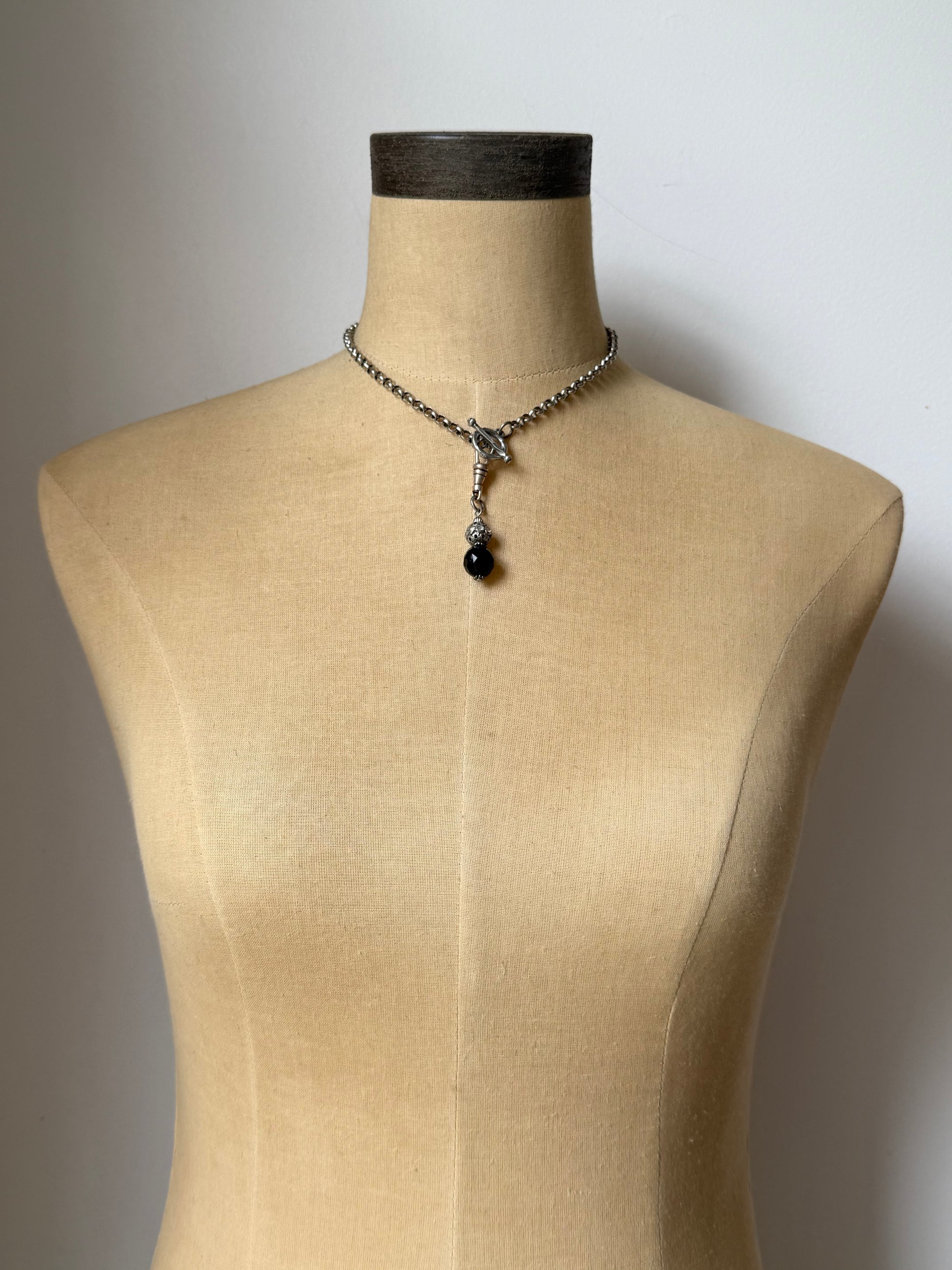 this darling pendant features a vintage faceted czech glass bead, beautifully accented with a vintage-style antique silver patina rhinestone brass bead. the pendant is securely attached to the clasp by a classic vintage antique sterling-plated swivel clasp, adding timeless charm. suspended from an antique silver-plated steel rolo chain, this piece is lead-free for safe, comfortable wear. the necklace fastens with an intricately textured antiqued pewter toggle clasp, completing the design with a touch of vintage elegance.