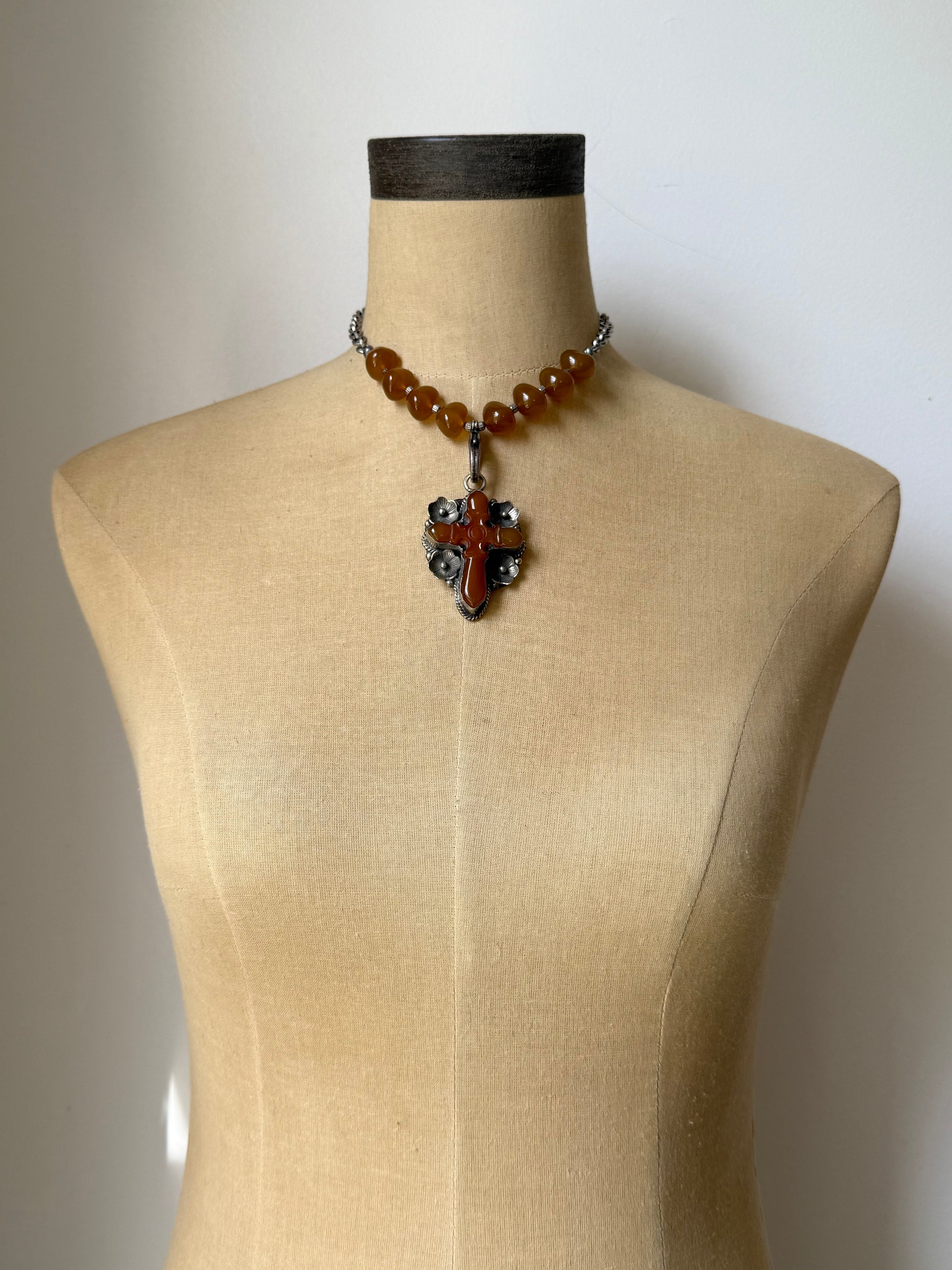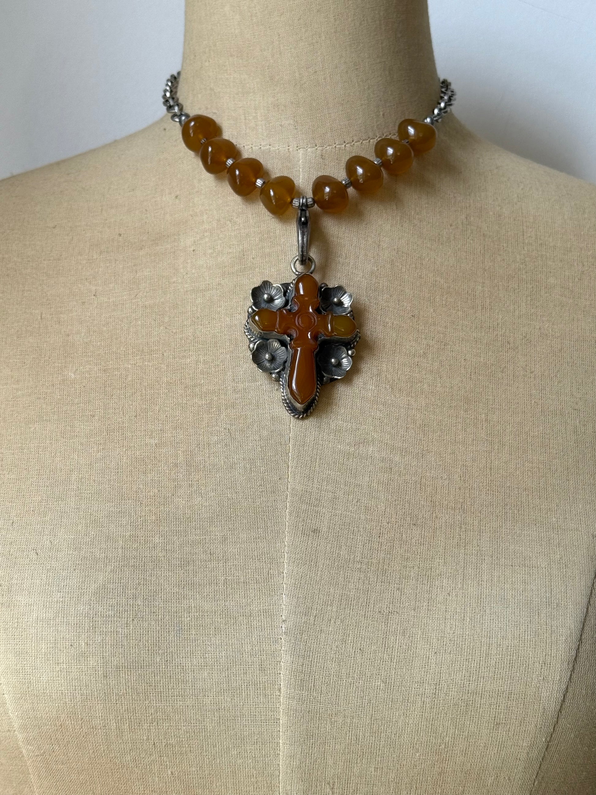 a pendant featuring a warm amber-brown stone, carved in the shape of a cross with a central circular motif, is set against a backing of intricate metalwork. four delicate, silver-toned flowers with detailed petals surround the stone, adding contrast and texture. the combination of the ornate floral setting and the polished stone suggests a handcrafted piece, possibly influenced by southwestern or mexican folk art traditions. the pendant is suspended from a handmade chain composed of beautiful, rare italian amber-colored lucite beads, paired with an antique silver rustic rolo chain. the chain is finished with an old-world style toggle clasp in antique silver. the pendant attaches to the chain via an oversized rustic silver-plated lobster claw clasp, enhancing its vintage charm.