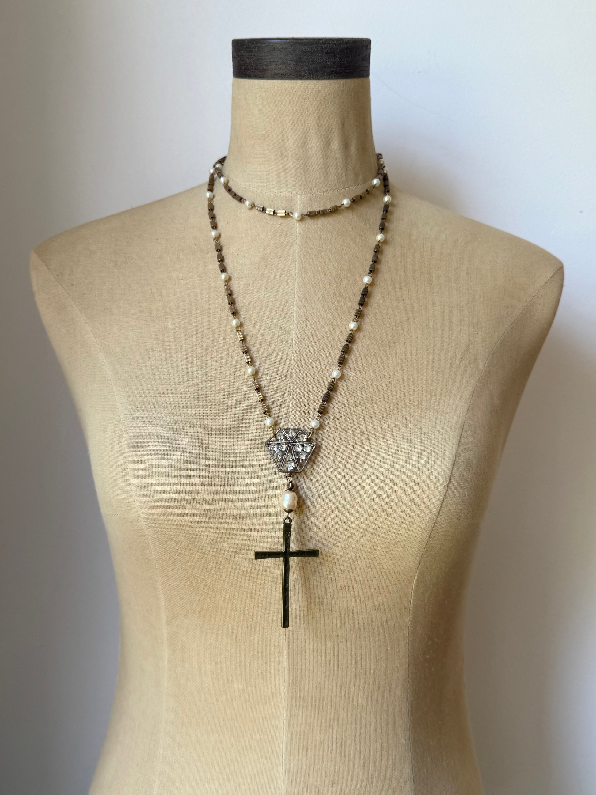 a stunning 1920s rhinestone-encrusted belt buckle serves as the radiant bridge between eras, connecting a large antique bronze cross with a clean, simple design. nestled at the center of the cross is a vintage miriam haskell cream faux baroque bead, glowing softly with timeless elegance. the chain, vintage chain is crafted from vintage antique bronze, which carries a warm, aged patina and features delicate faux pearl connectors that adds a touch of refined charm. designed as a double strand, the chain creates the illusion of two necklaces—one resting gracefully as a choker, the other dropping lower to showcase the pendant in all its glory. a blend of vintage romance and quiet drama, the piece whispers stories of the past with every shimmer.