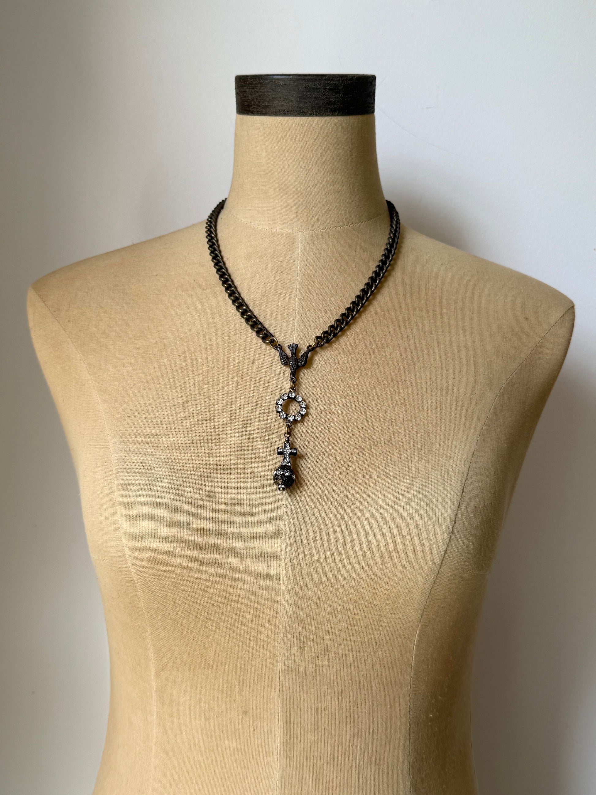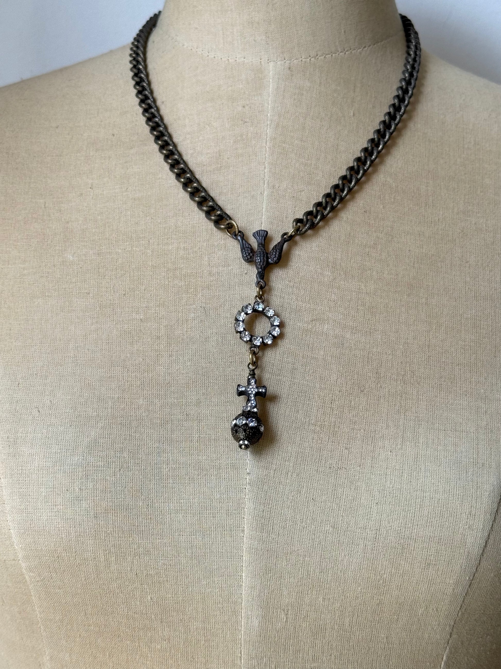 a vintage-style necklace featuring a flea market rhinestone rustic cross, full of character and aged charm. the cross is paired with a rustic brown rhinestone bead in a vintage style, both elements elegantly joined by a round rhinestone connector that adds a subtle touch of sparkle. these focal points are connected to the chain by a rustic brown rosary-style connector, adorned with a dove motif—symbolizing peace and spiritual grace. the chain is composed of heavy, etched antique bronze links, offering a rich, textured appearance that evokes timeless strength. finishing the piece is a unique antique bronze-plated wood grain toggle clasp, lending an organic, earthy feel that perfectly complements the overall design. a harmonious blend of vintage elegance and rustic soul.