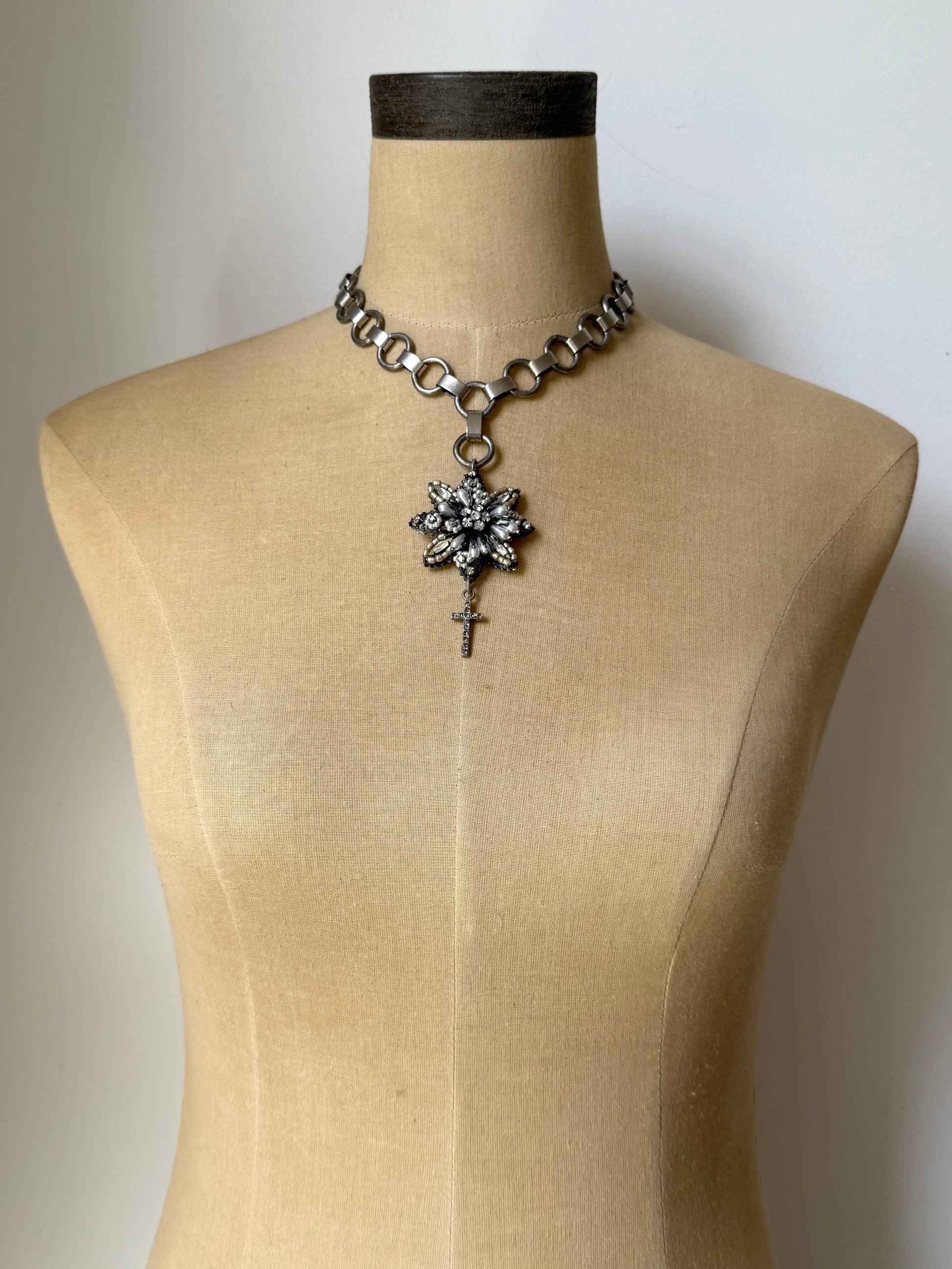 a stunning and texturally rich statement piece, this necklace begins with an exquisite vintage brooch—an original by robert—lavishly adorned with faux pearls and clear rhinestones set into antique silver metal. the brooch serves as a regal focal point, from which a striking antique silver-toned cross pendant elegantly drops. this cross dazzles with smoky black diamond crystal rhinestones, adding dramatic depth and old-world charm. the entire piece is anchored by a bold, chunky antique silver chain and finished with a timeless toggle clasp, echoing the romantic grandeur of vintage design.