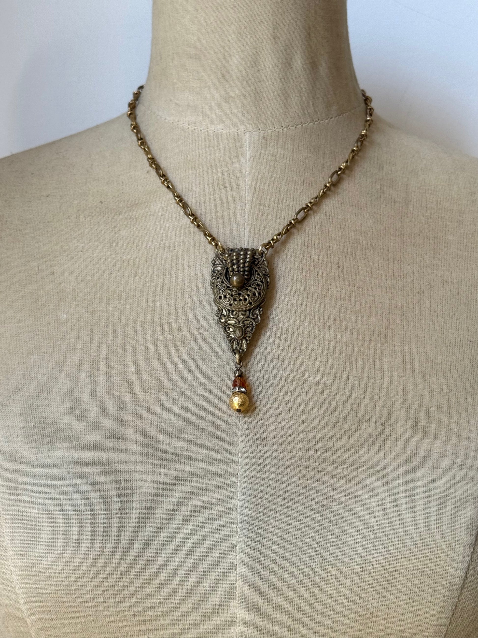 vintage brass art deco mid 1920’s ornate shoe clip adorned with hammered 22k gold plated copper bead accented with rhinestone rondelle beads caps and czech faceted topaz bead.