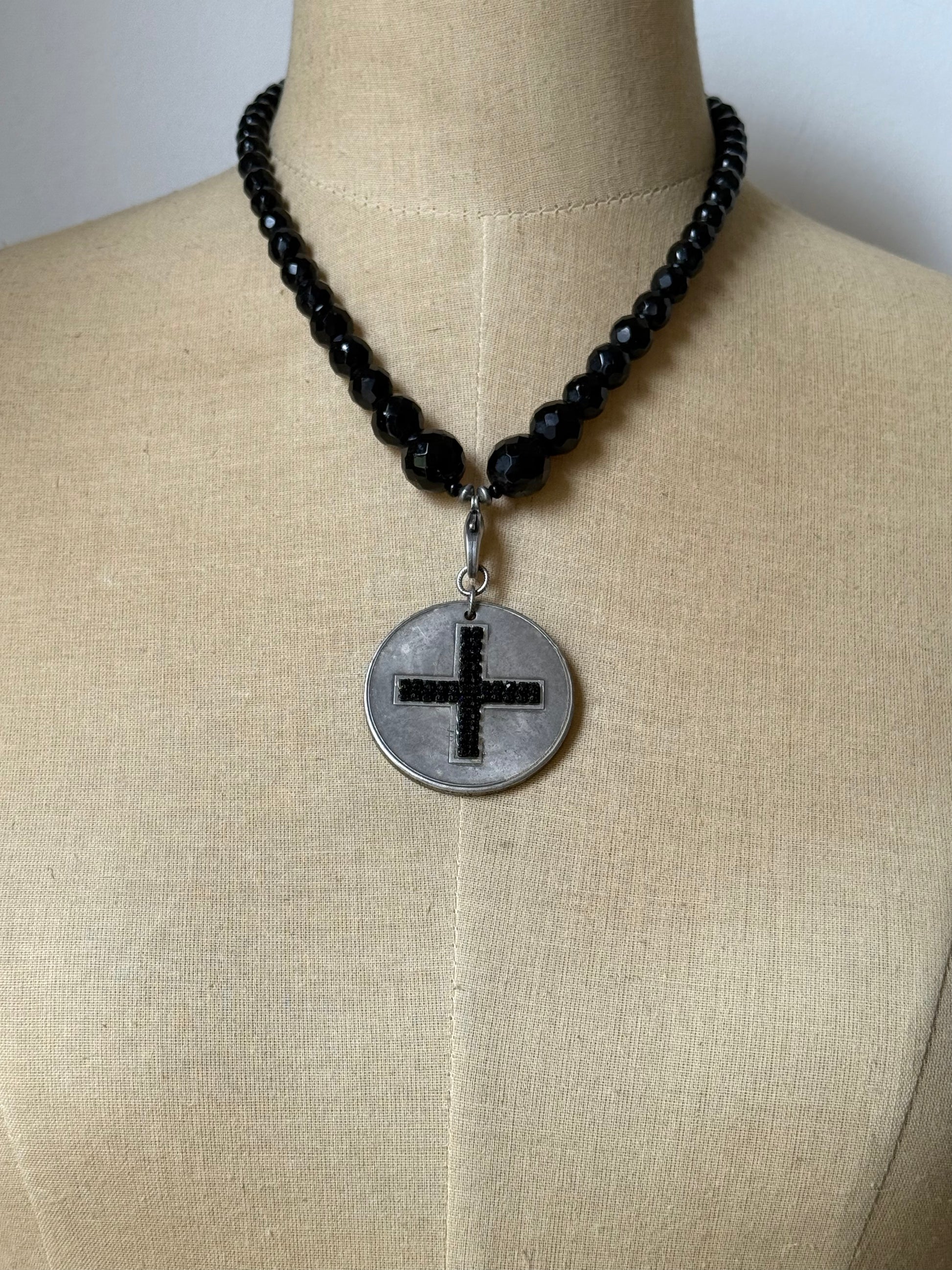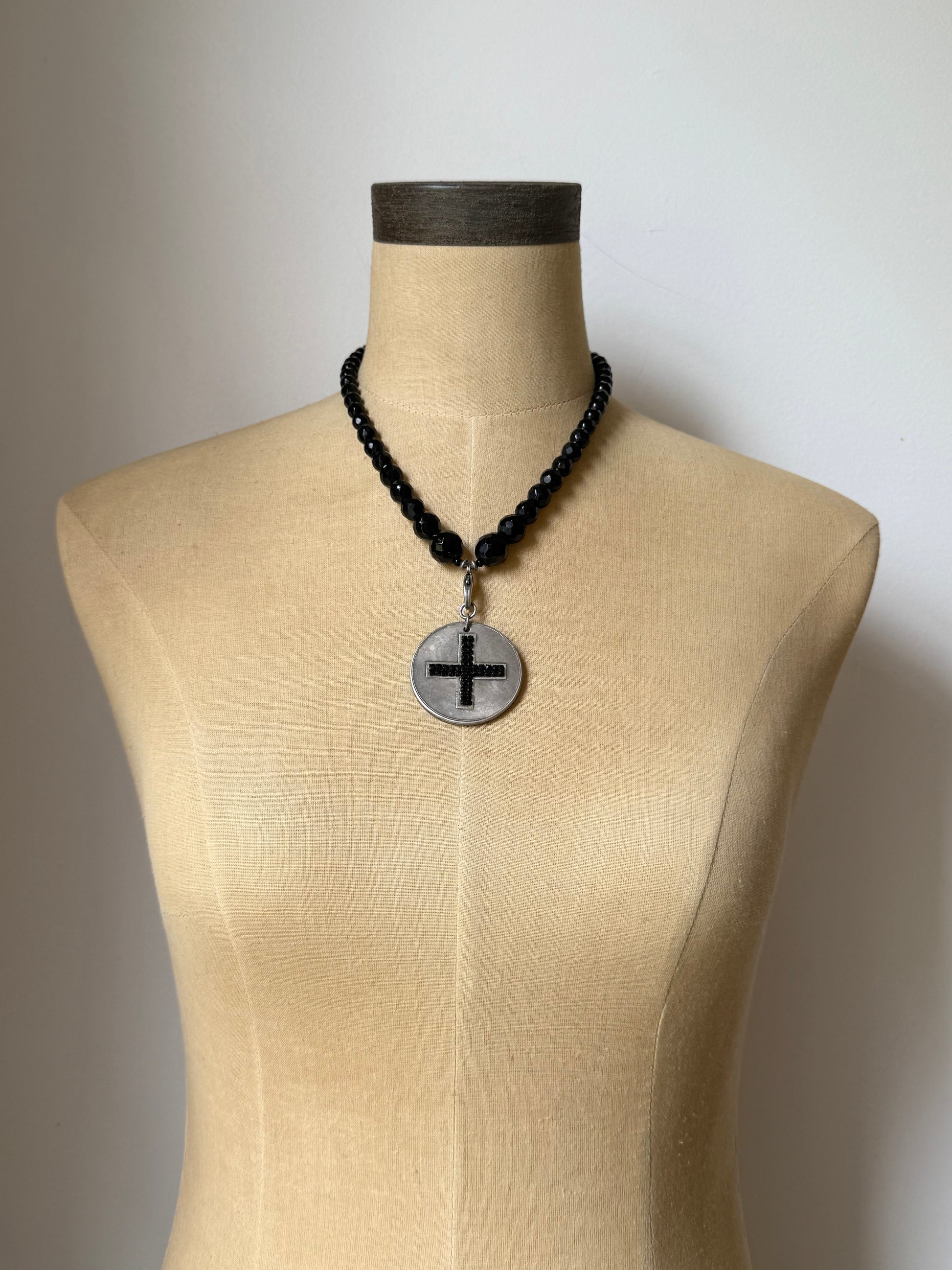 chunky and bold, this statement necklace centers around a textured replica coin cross pendant, featuring black rhinestones arranged in the form of a cross. the coin, with its antique silver plating and substantial 45 millimeter size, brings a striking, timeworn elegance. the pendant hangs from a reimagined vintage czech black beaded chain, hand-strung and originally part of a past-era necklace, now given new life with purpose and edge. the chain’s deep luster and faceted sparkle provide a rich contrast to the rugged patina of the cross. the piece is finished with an old world style antique silver plated pewter toggle clasp, offering both beauty and durability. a distinctive blend of gothic flair and vintage craftsmanship. pairs beautifully with “ruth”.