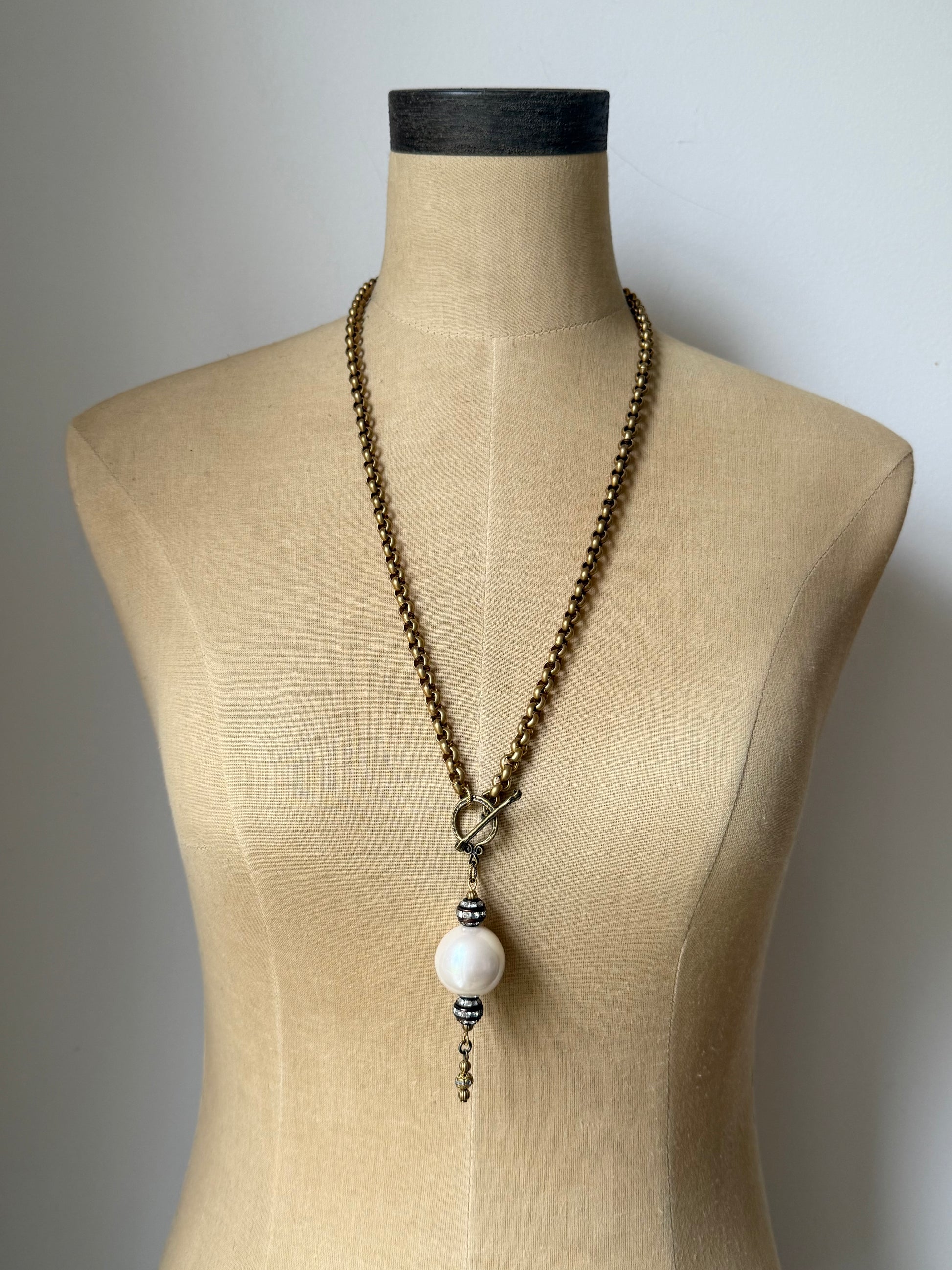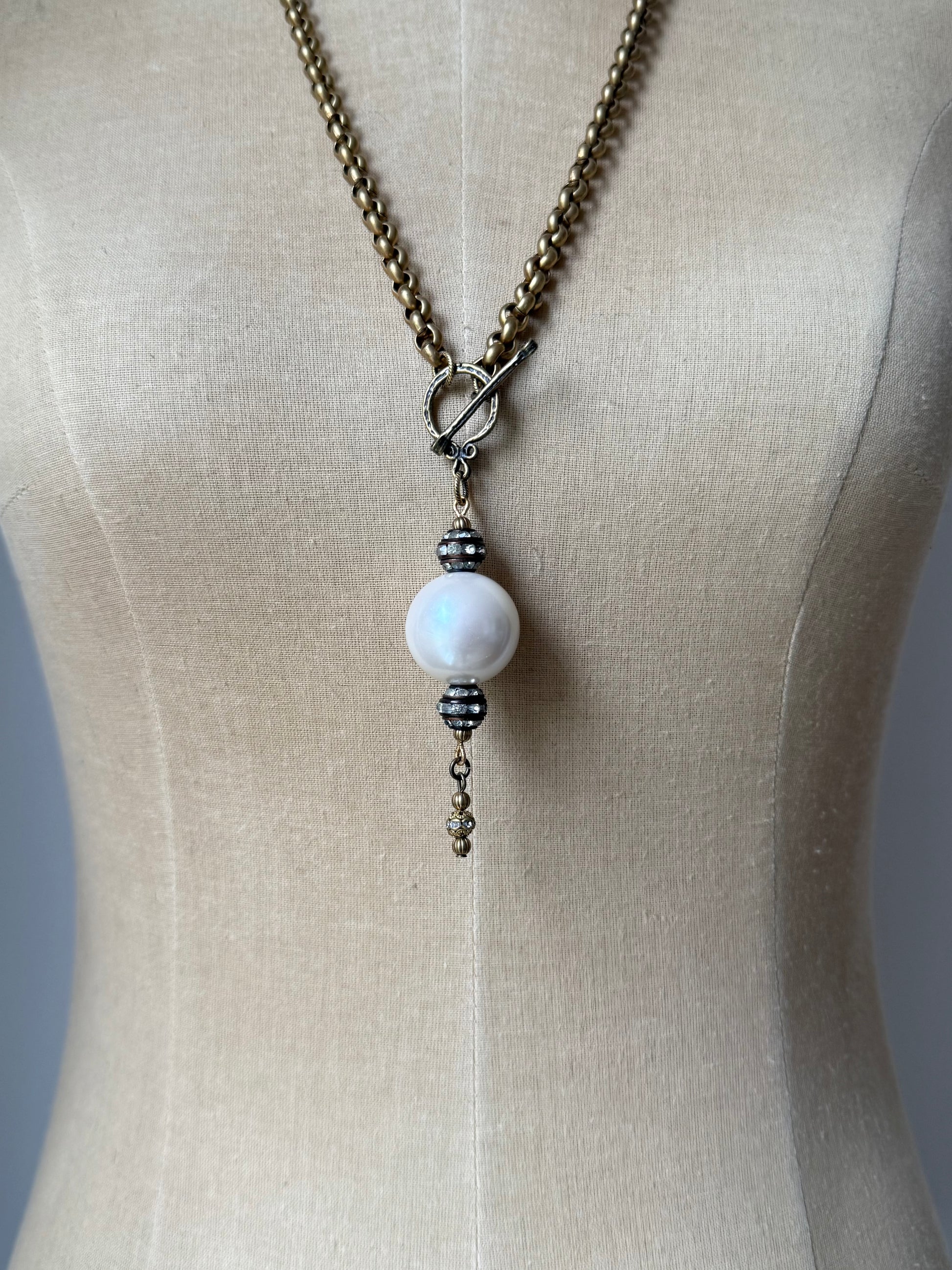 this necklace features a large vintage japanese glass pearl as the centerpiece, accented by vintage rhinestone beads and oxidized metal for an aged, elegant touch. it's topped with small vintage brass beads that add warmth and detail. a sweet charm dangles from the pendant, crafted from vintage-style rhinestone beads, giving it a delicate, romantic feel. the piece is finished with a vintage heavy solid brass chain and a beautifully ornate bronze-plated toggle clasp, tying the whole design together with timeless charm.