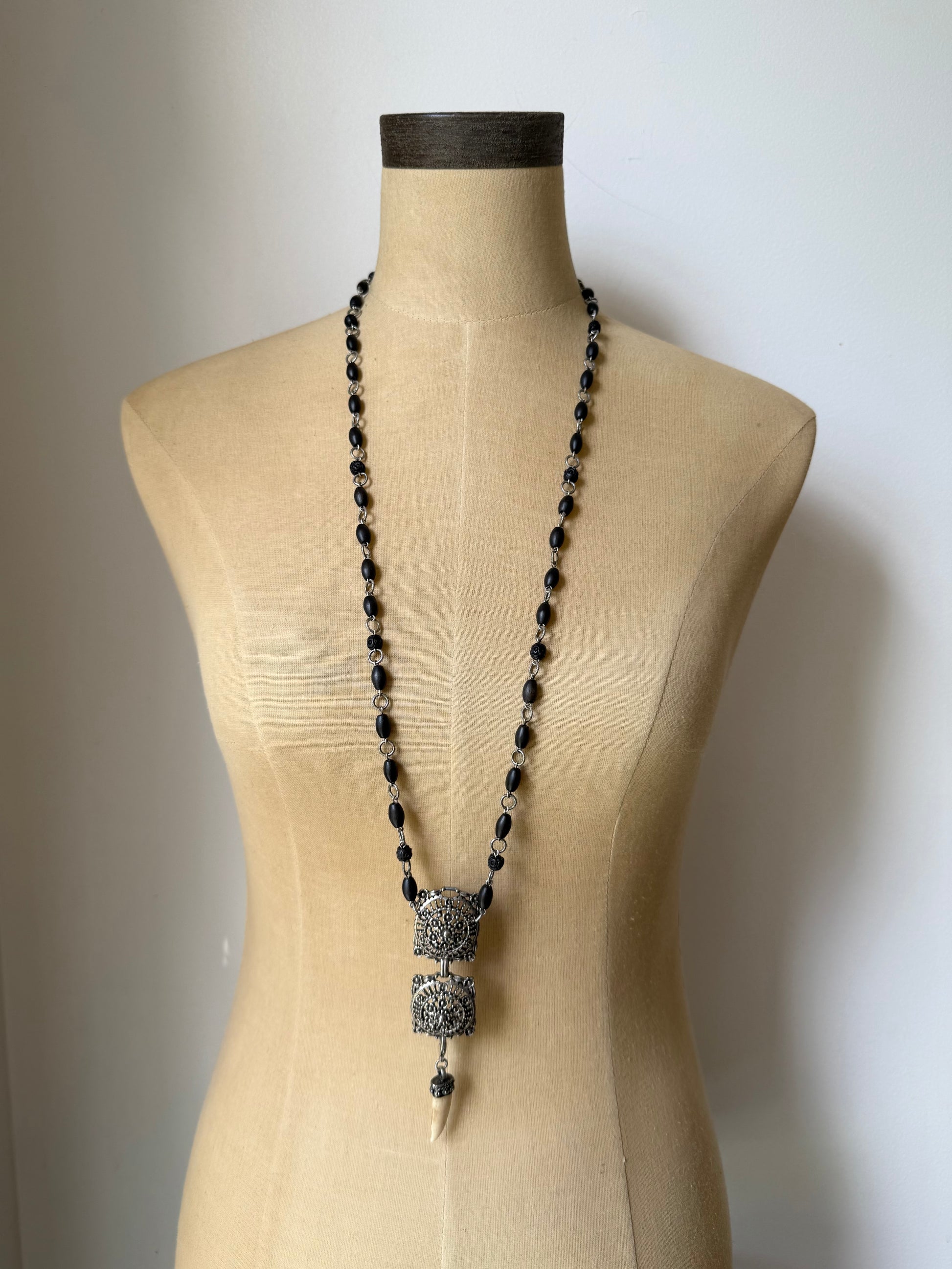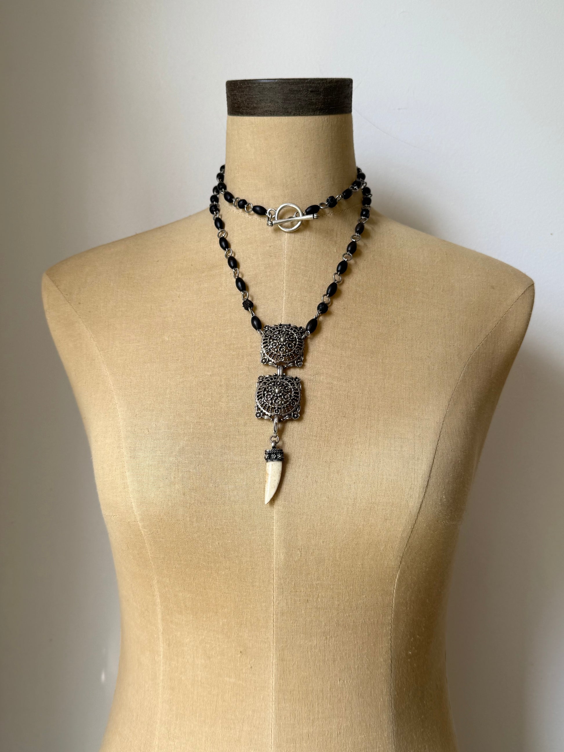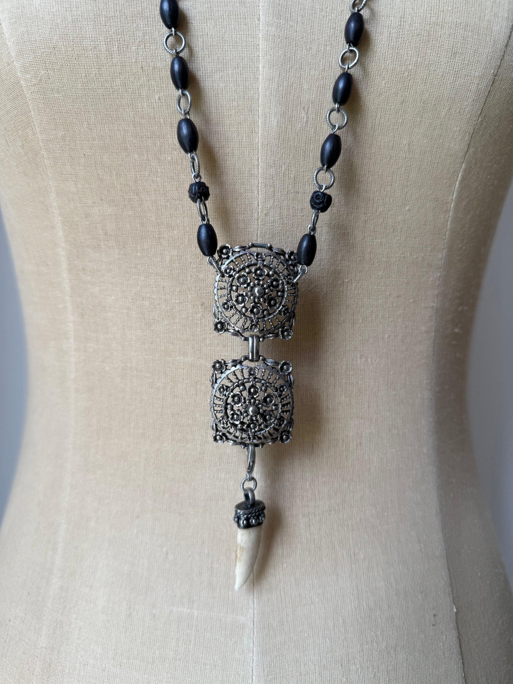 vintage 1950s white pot metal link bracelet reimagined into a striking pendant. each domed link features delicate raised floral designs and retains a beautifully aged silver-toned patina. suspended from the pendant by an antique silver lobster claw clasp is a small ethically sourced buffalo bone tooth pendant, finished with an engraved antique silver cap that adds a subtle primitive charm. the chain is handcrafted from vintage dark brown wooden rosary beads, lending warmth and organic texture. secured with an antique silver plated toggle clasp with intricate detailing. a versatile piece that can be worn long or doubled to create a layered choker-style effect.