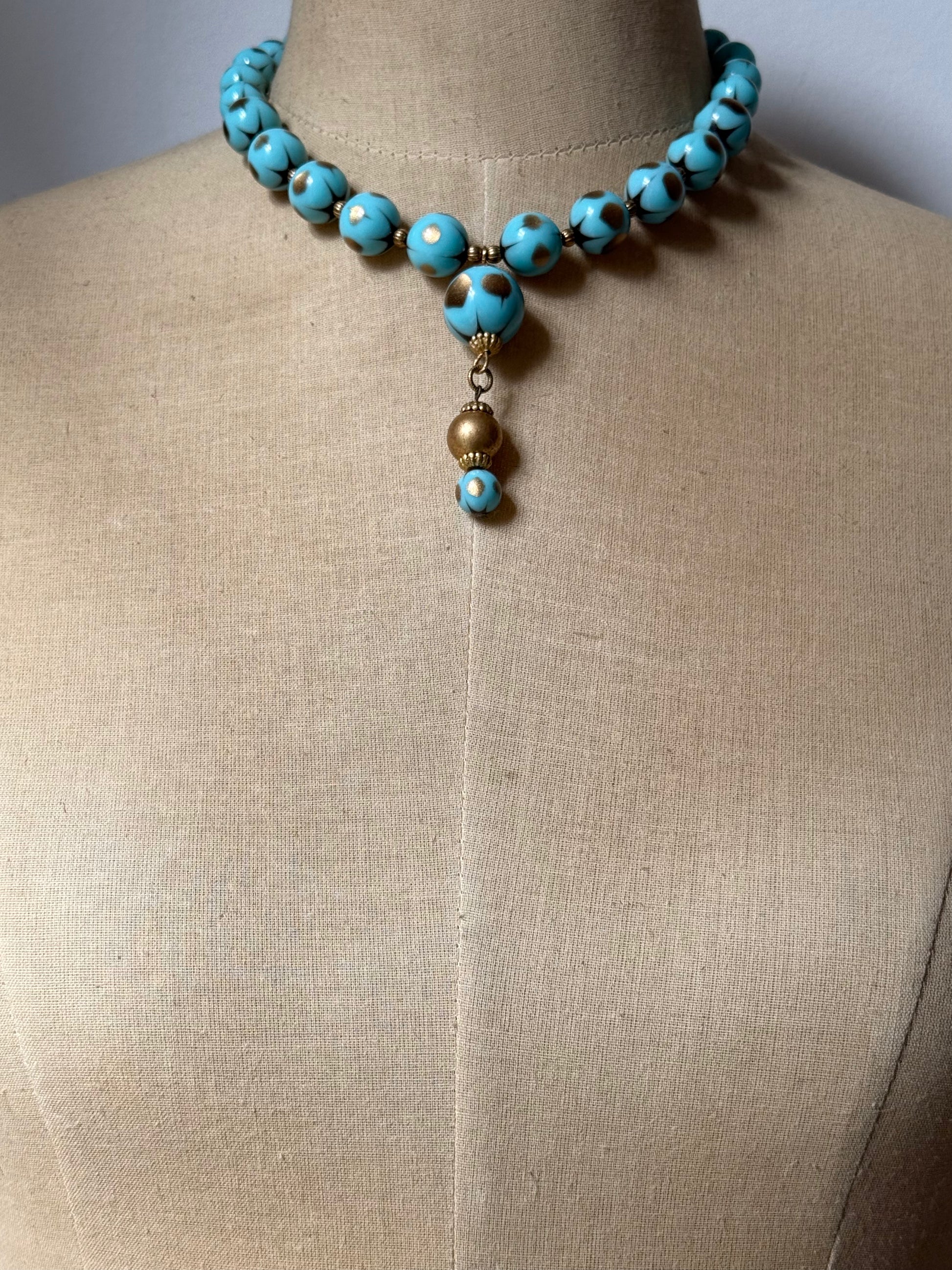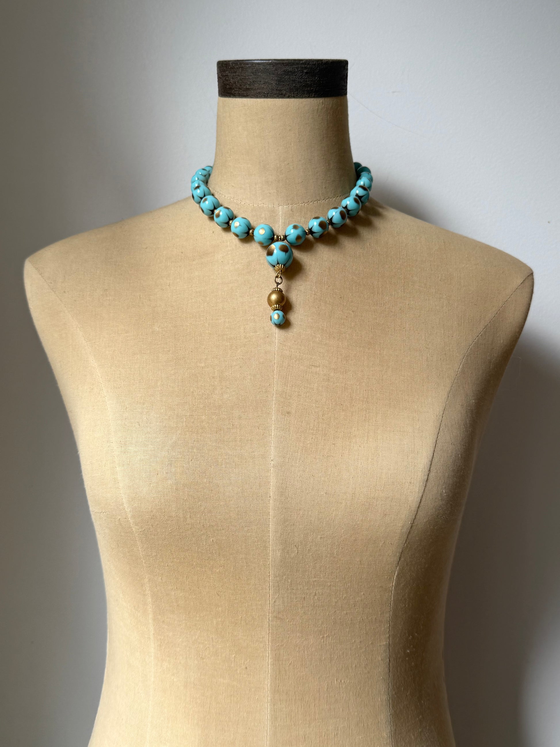 a beautifully restrung 1950s/1960s stardust necklace featuring a shimmering combination of turquoise and gold beads, thoughtfully paired with vintage ribbed brass accents. the design highlights a graceful drop created from original components, including rare brass-covered lucite beads, elegantly finished with ornate 1950s brass bead caps. each element speaks to mid-century charm, blending nostalgia with artisan craftsmanship in a one-of-a-kind statement piece.