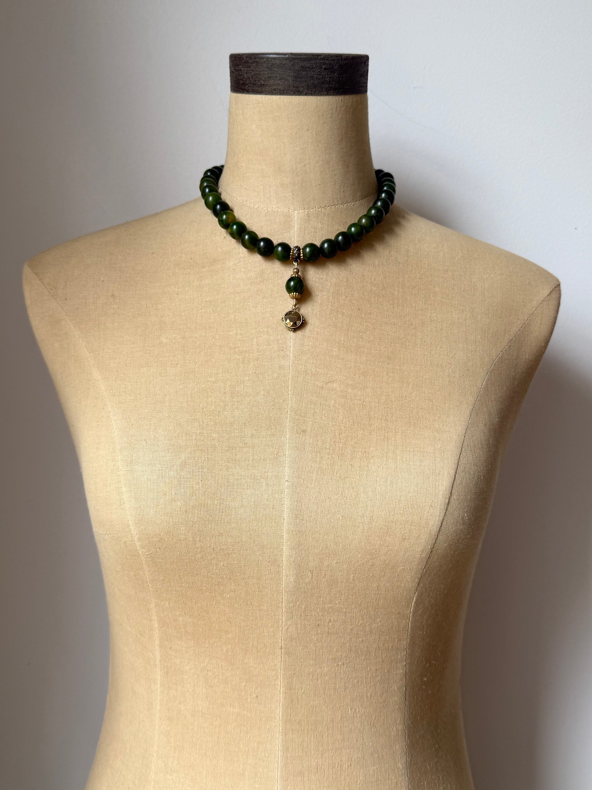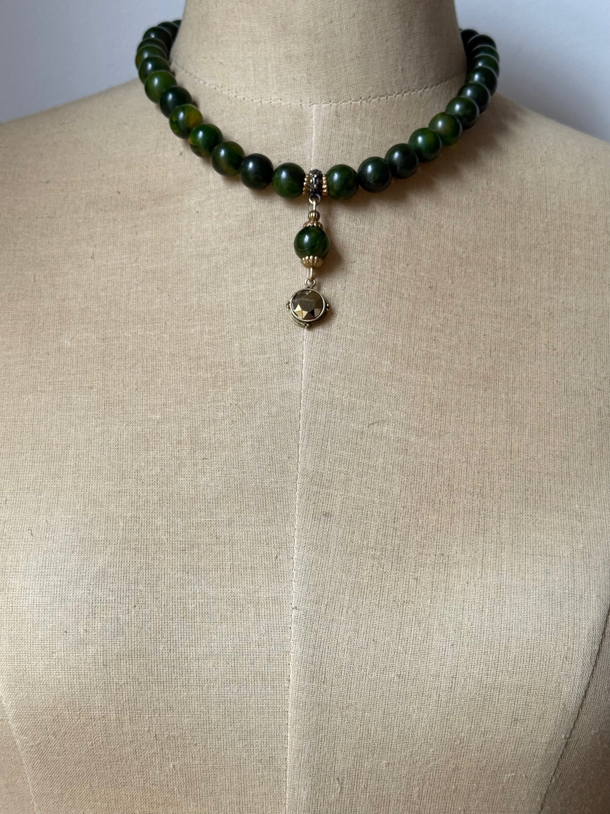 hand strung vintage bakelite beads in a rich green and mustard swirl offer a bold yet nostalgic palette. the pendant is crafted from one of the bakelite beads itself, elegantly adorned with two vintage 1950s scalloped brass bead caps. suspended from this focal bead is a warm bronze glass stone set in a beautifully aged oxidized brass setting. finished with an antique gold plated toggle clasp, this piece is a “well-strung” harmony of retro flair and golden-age charm.