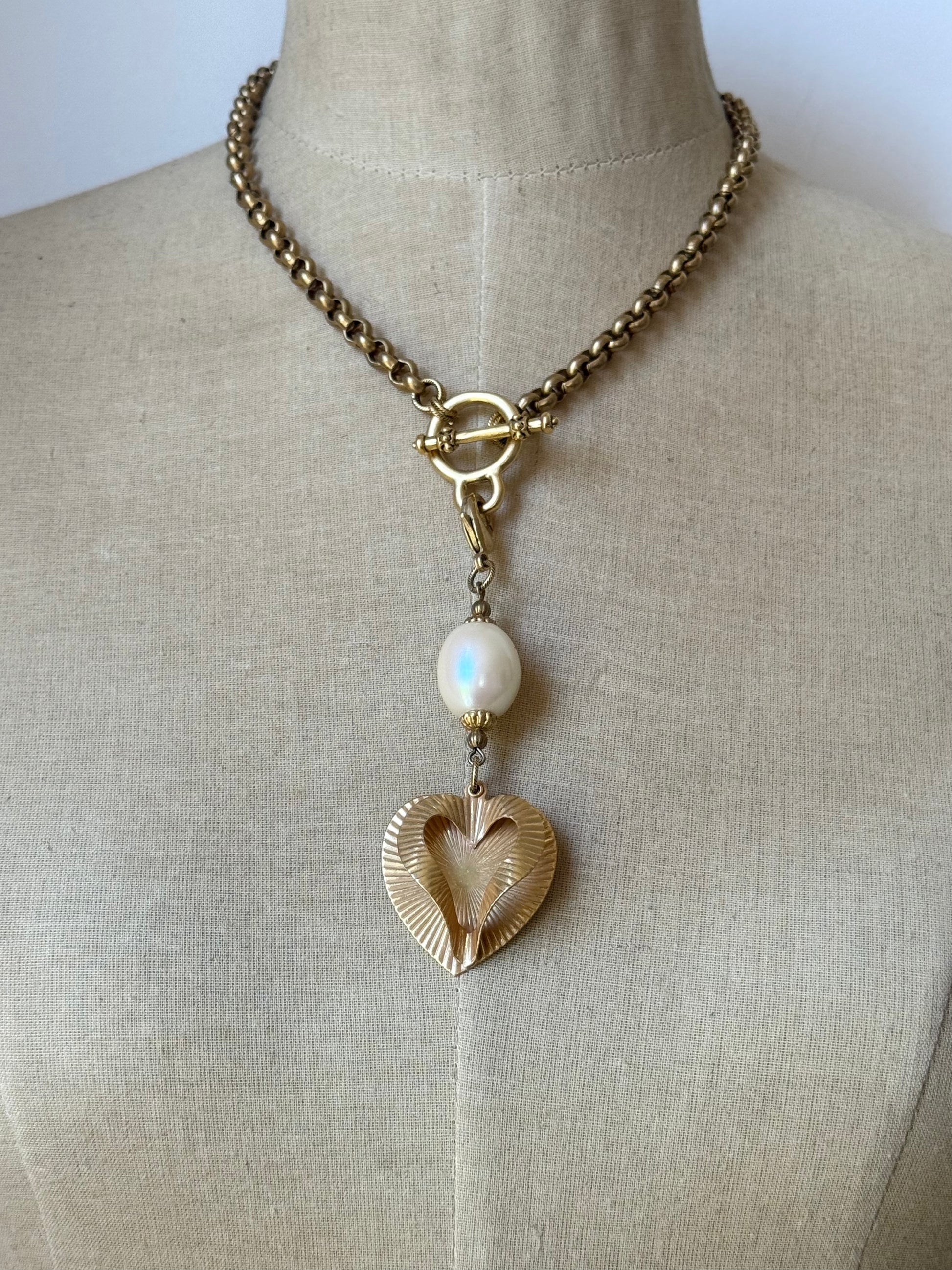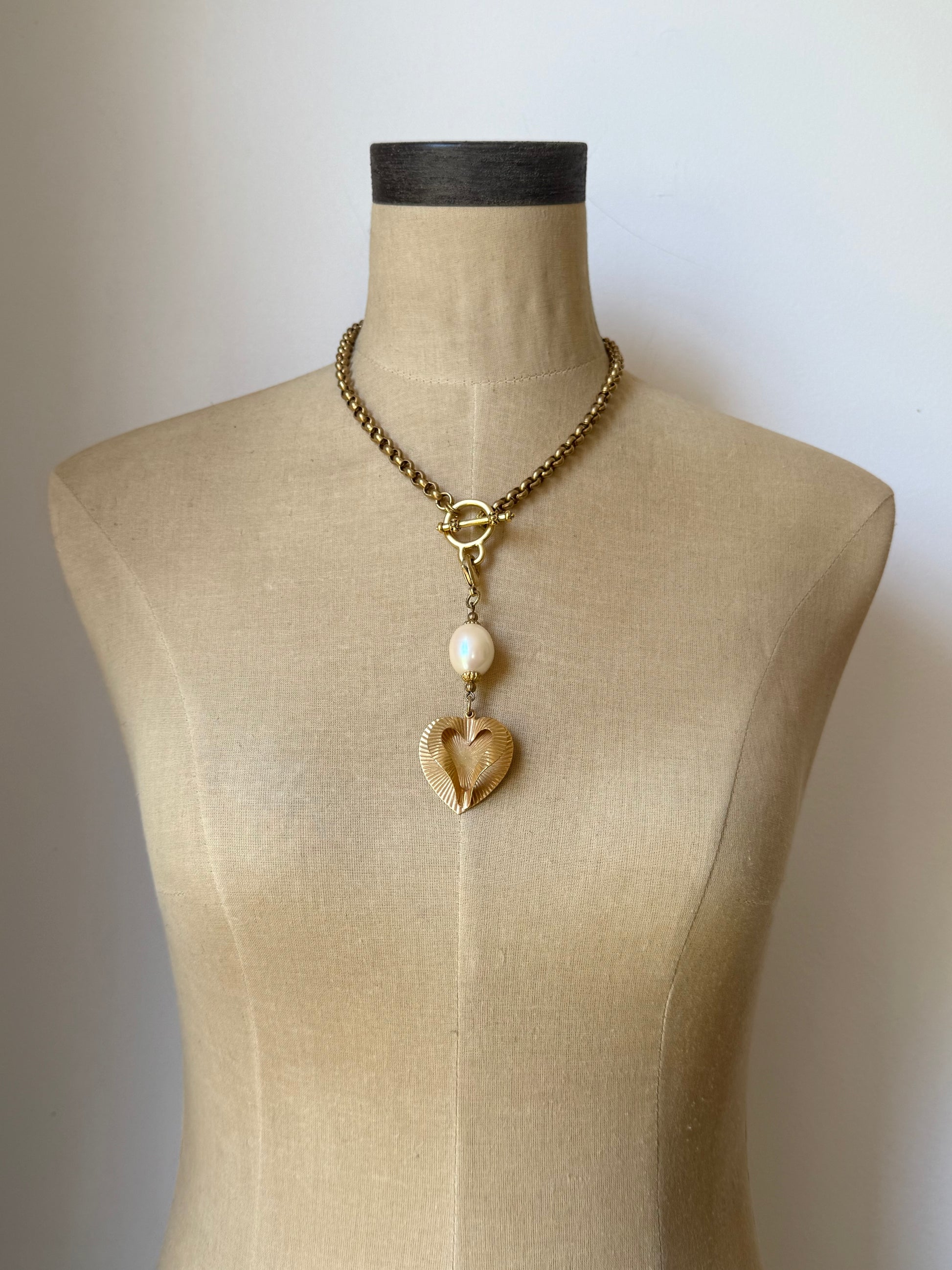 fabulous rare gold-plated miriam haskell three-dimensional ribbed heart pendant steals the spotlight with its sculptural charm and timeless allure. suspended beneath a luminous oversized vintage faux pearl, the heart is flanked by 1950s ribbed bead caps and two small vintage ribbed brass beads, echoing its textured elegance. the pendant connects to an old world style gold-plated toggle clasp via a classic brass lobster clasp, adding a hint of vintage romance. the chain is a striking, weighty vintage brass rolo, rich with patina and history.