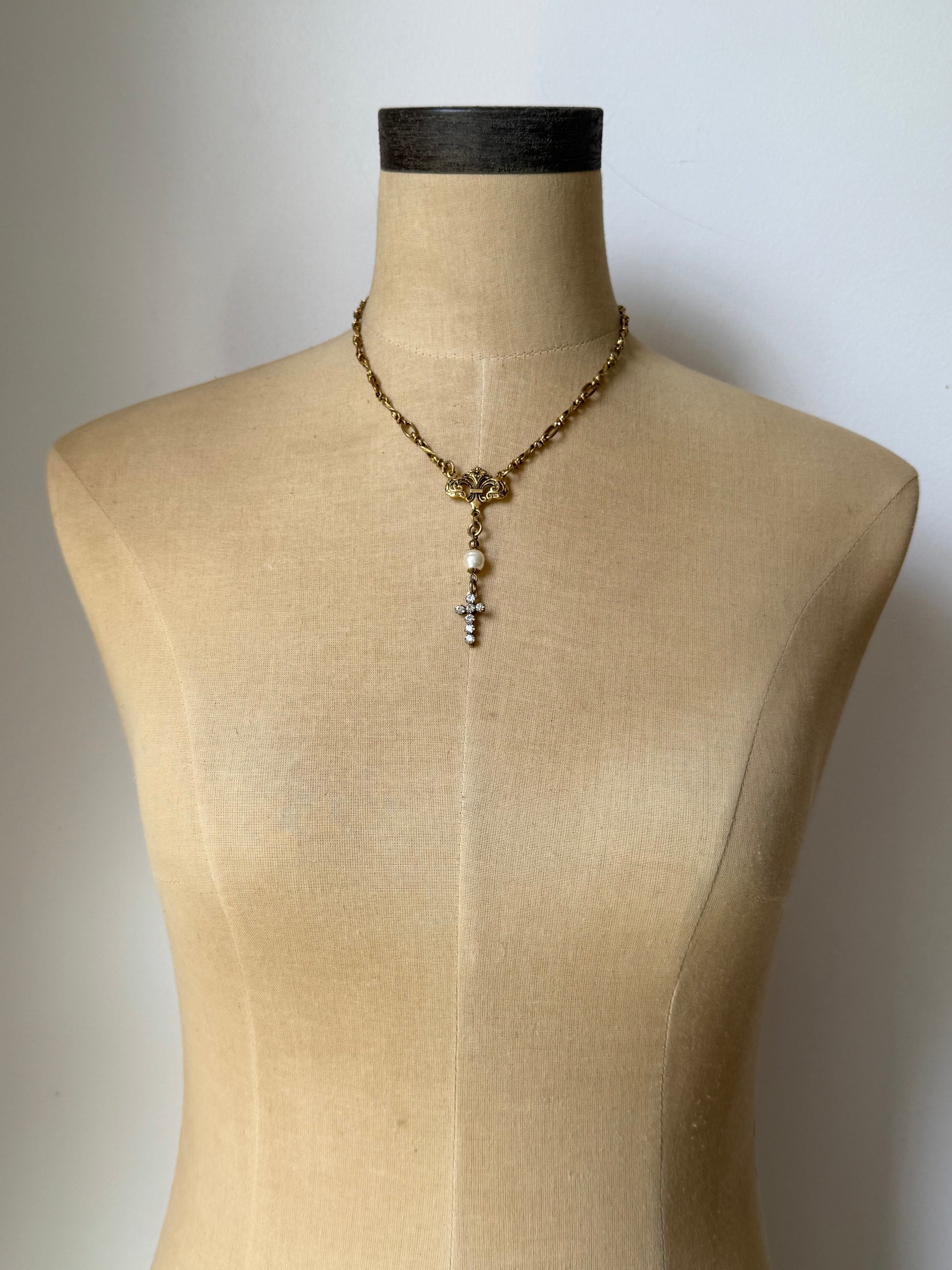 a 1900s antique paste cross adorned with sparkling clear stones pairs elegantly with a vintage glass miriam haskell baroque pearl, creating a pendant that drapes gracefully from a floral antique gold plated rosary connector. all of this charm is suspended from a 16” length of vintage brass standish chain, tying old-world romance with a touch of gilded.