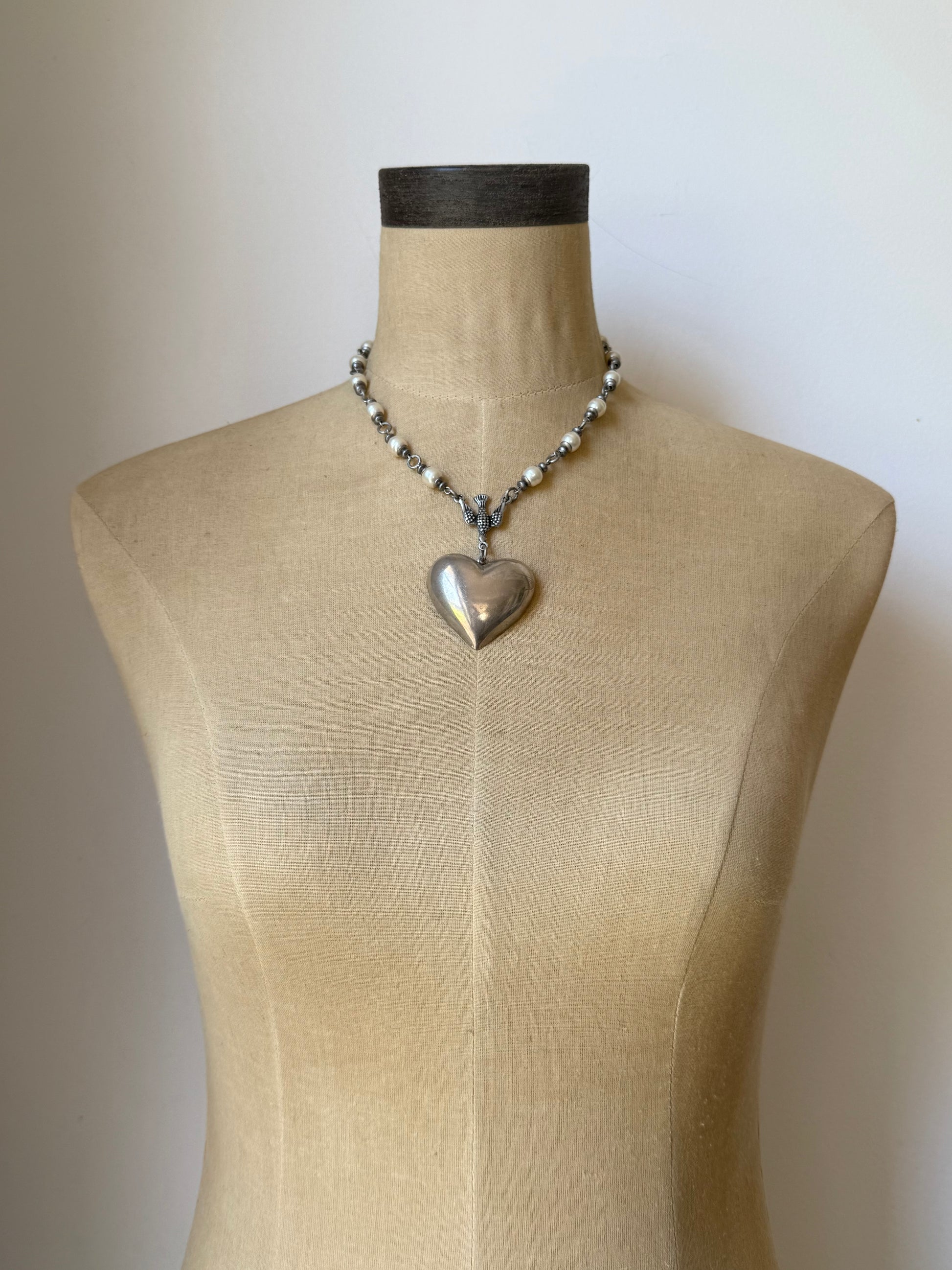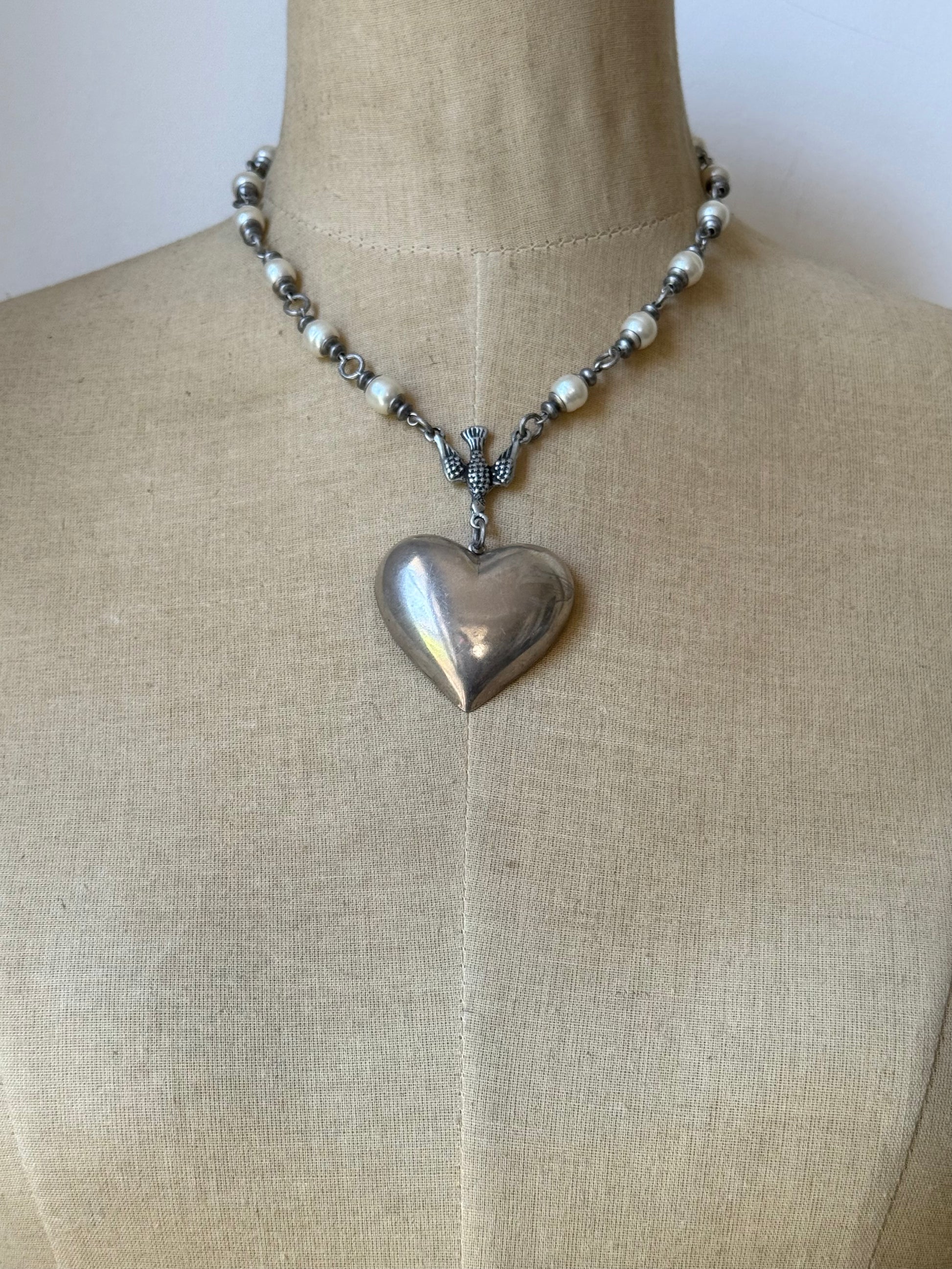 vintage silver heart pendant hangs gracefully from a handmade chain adorned with miriam haskell baroque glass pearls, paired with plated antique silver b caps and matching spacers. the pendant is suspended by an antique silver plated pewter dove rosary connector, which is lead and cadmium free, adding a gentle, symbolic touch. the piece is finished with a textured silver plated toggle clasp, which is lead free, bringing an old-world charm to this heartfelt design.