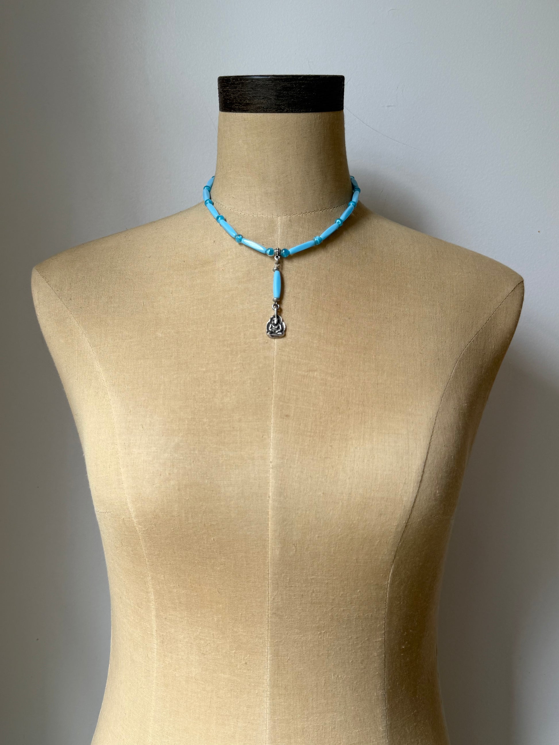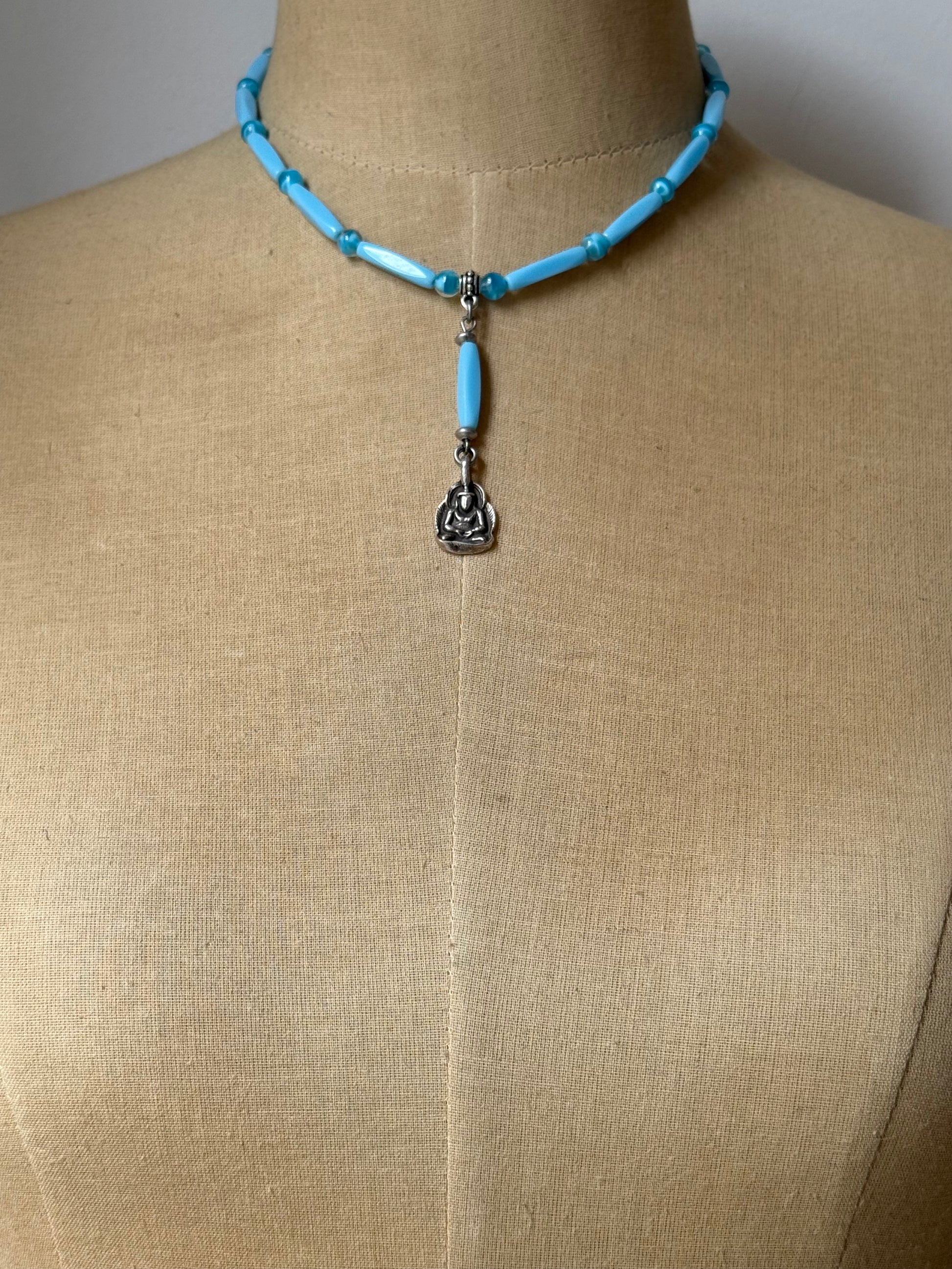 this unique, handcrafted necklace features a striking handmade chain composed of vintage blue lucite rectangle beads, each radiating a cool, retro charm. Interspersed along the chain are small, marbled vintage glass beads in varying shades of blue, adding texture and depth with their subtle swirls of color. the focal point of the necklace is a serene dhyana buddha pendant, beautifully adorned in antiqued silver plating. the peaceful figure, symbolizing meditation and inner balance, complements the calming hues of the beads and adds a meaningful, spiritual touch. the overall design blends vintage elegance with mindful artistry, making this piece a wearable meditation and a conversation starter.