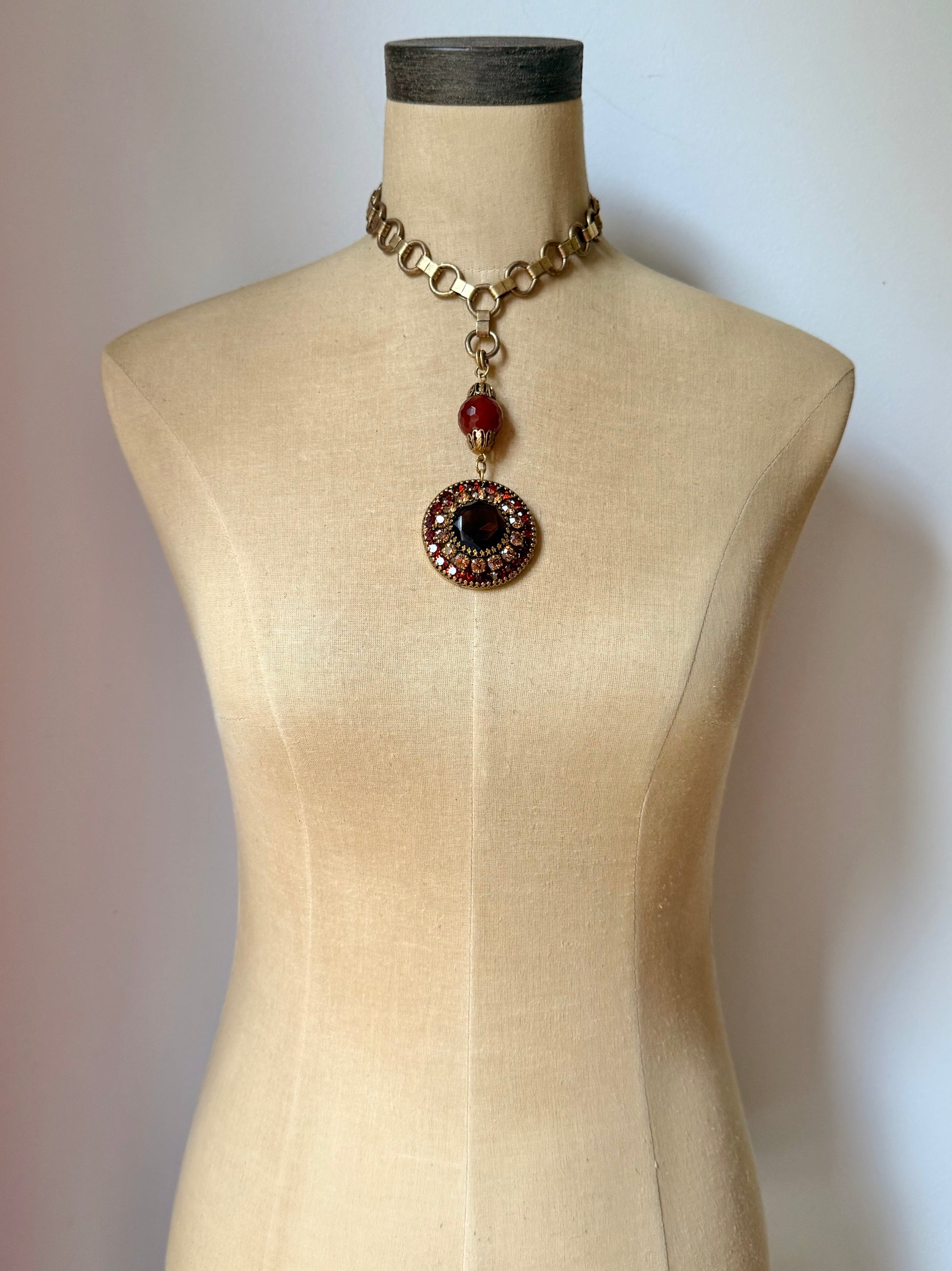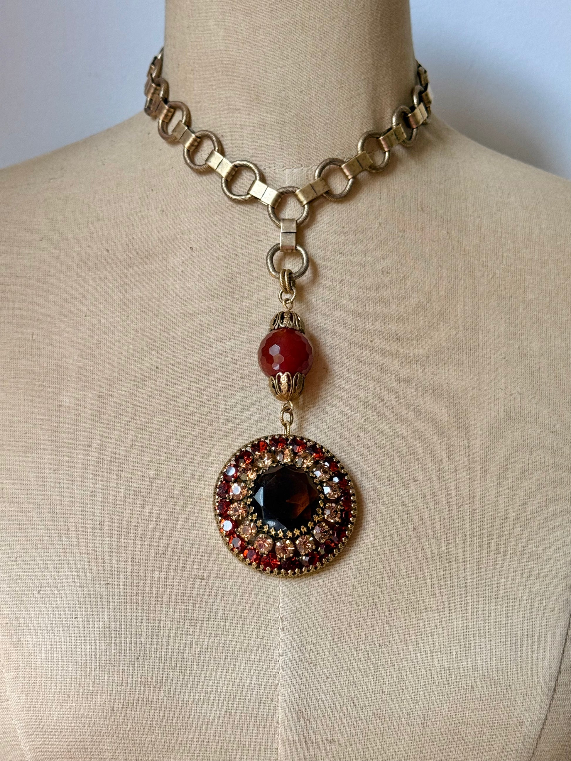 fabulous vintage large weiss smoky topaz glass rhinestone gold-plated brooch, turned pendant, takes center stage as the dramatic focal point. this heirloom-worthy piece is accented by a vintage brass ornate bead caps that crown a large faceted crystal cut carnelian glass bead, adding a deep warm richness and a subtle fire like a late autumn embers glow. the chain is composed of large antique gold textured links, substantial in weight, old world in attitude, and finished off with a 12-carat antique gold-plated pewter toggle clasp, lead and cadmium free.