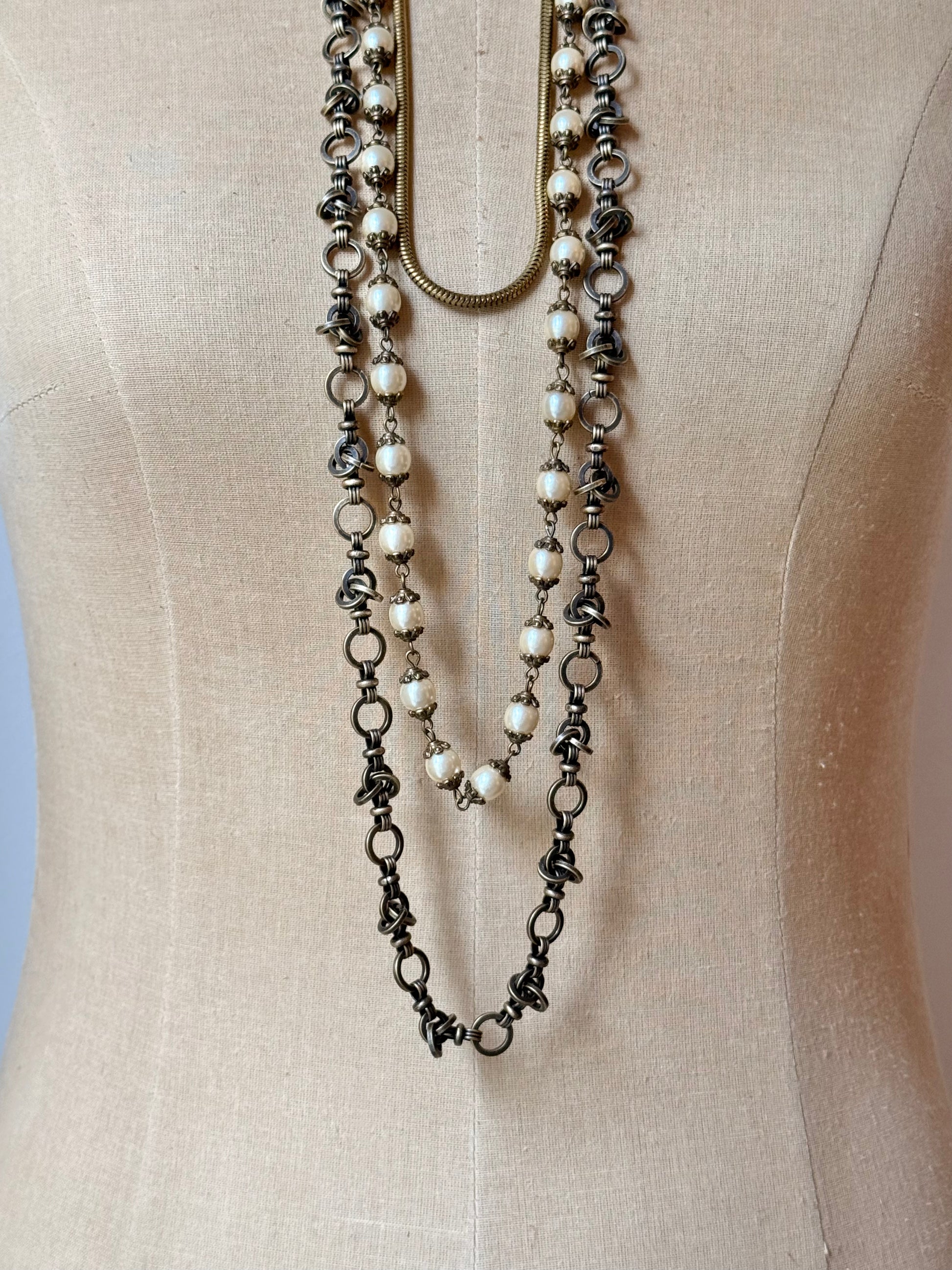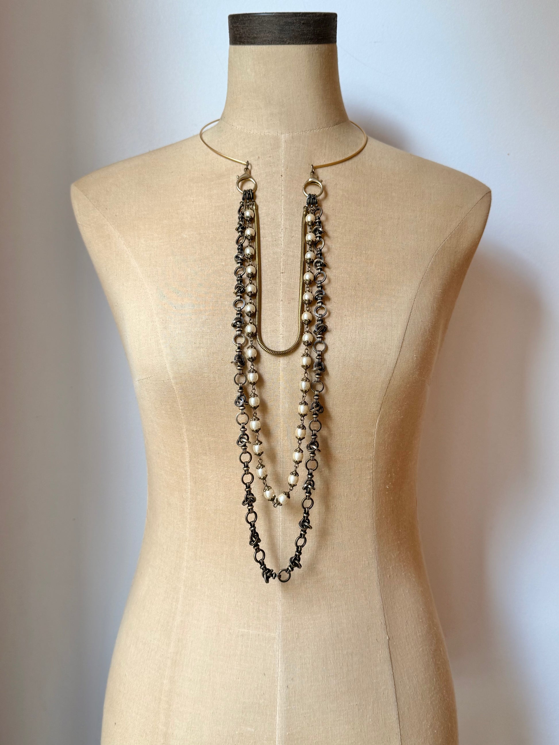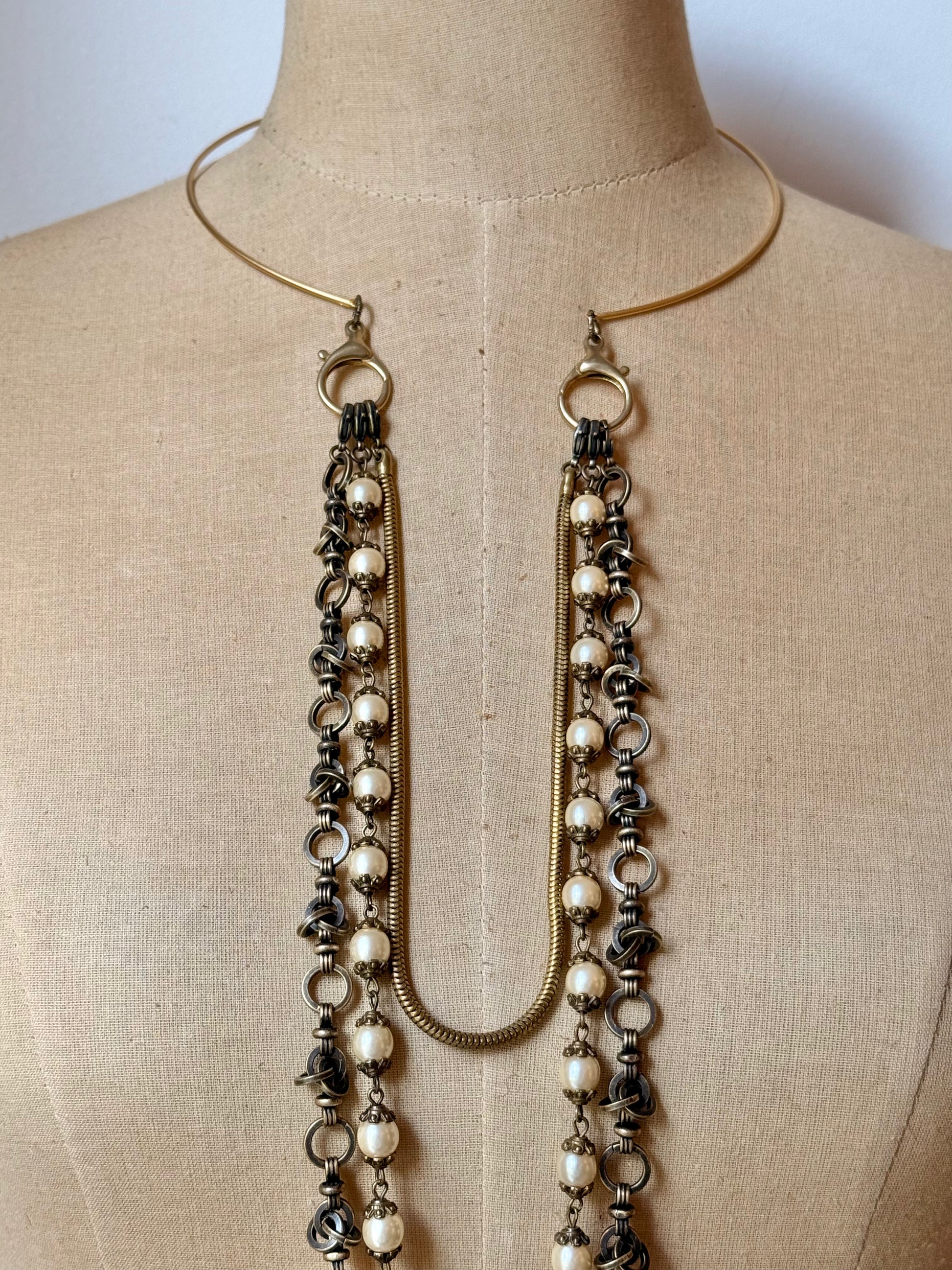 gold-plated wire choker forms a sleek, sculptural collar that sets the stage for a dramatic trio of hanging chains, each one anchored to a large vintage chunky brass lobster clasp by tiny antique bronze lobster clasps for an intentionally layered, mixed-metal look. the longest drop falls at thirteen inches, showcasing an antique bronze oxidized triple-circle chain with a soft, timeworn finish, fully lead and nickel-free. the second tier descends at nine inches with a handmade strand of champagne-colored glass faux pearls, each one topped with textured bead caps that bring a subtle shimmer and old-world refinement. the shortest drop sits at five inches, offering a vintage brass snake chain with a warm, natural patina that adds depth and character. the interplay of lengths, finishes, and textures gives the piece a bold, sculptural presence—striking, dimensional, and effortlessly statement-making.