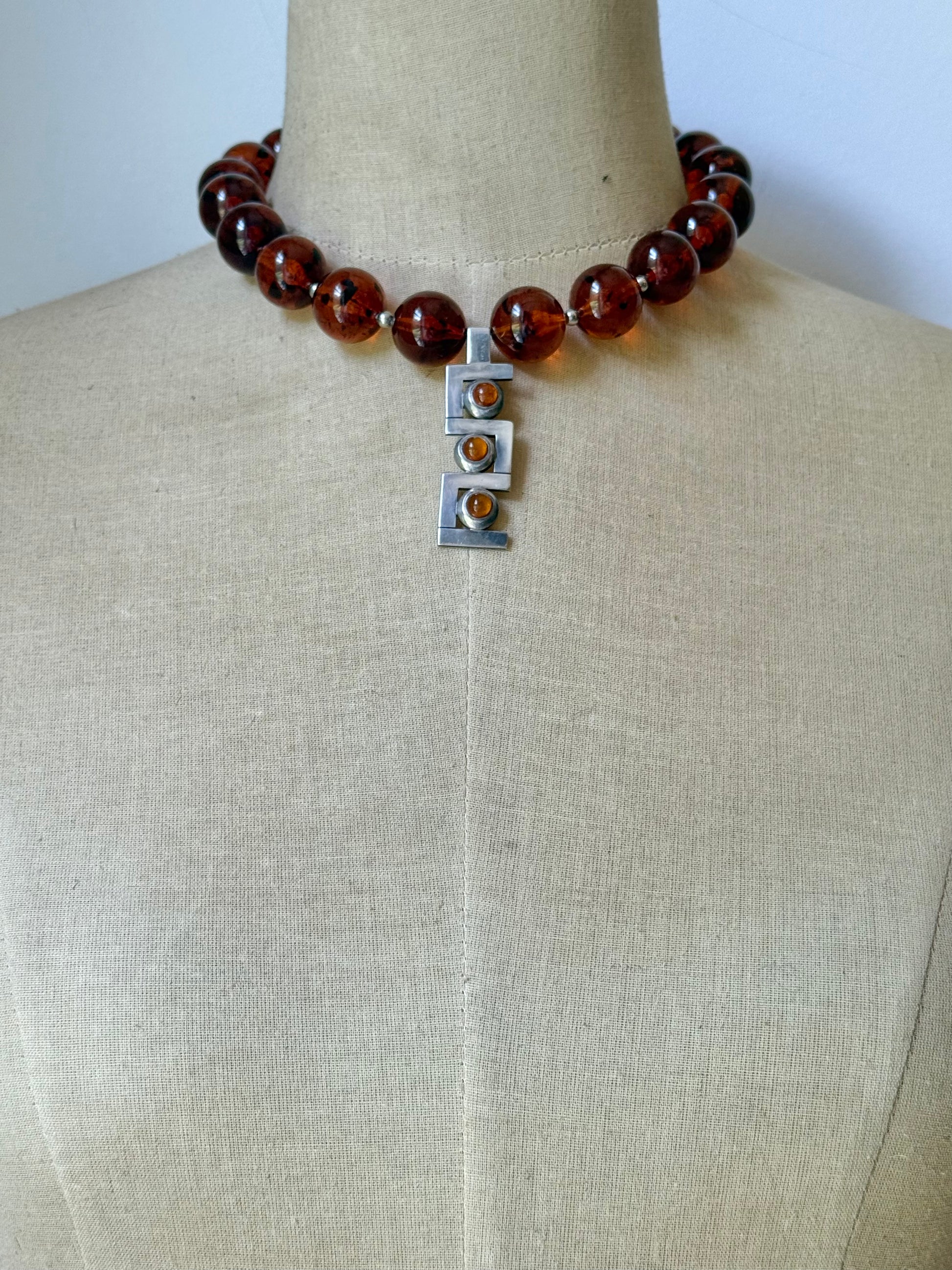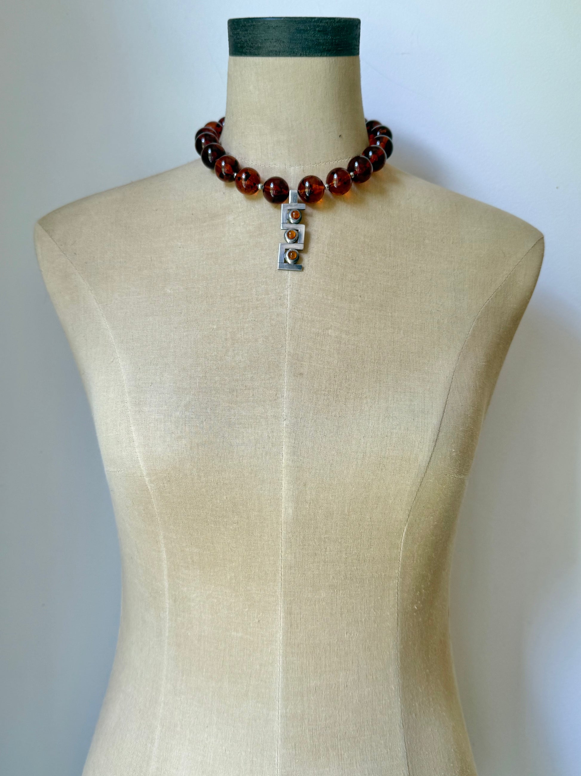a striking blend of warm tones and mid-century charm, this necklace features rare vintage 14mm tortoiseshell lucite beads—each one glowing with swirls of golden honey and dark chestnut, reminiscent of sunlight filtering through aged glass. spaced with petite silver beads for a subtle glint of contrast, the strand leads to a bold focal point: a vintage modernist sterling silver pendant set with amber glass beads. the pendant, likely danish and mid-century in origin, brings a sculptural elegance with its fluid, abstract lines and warm amber glow—like wearable art from a bygone gallery.