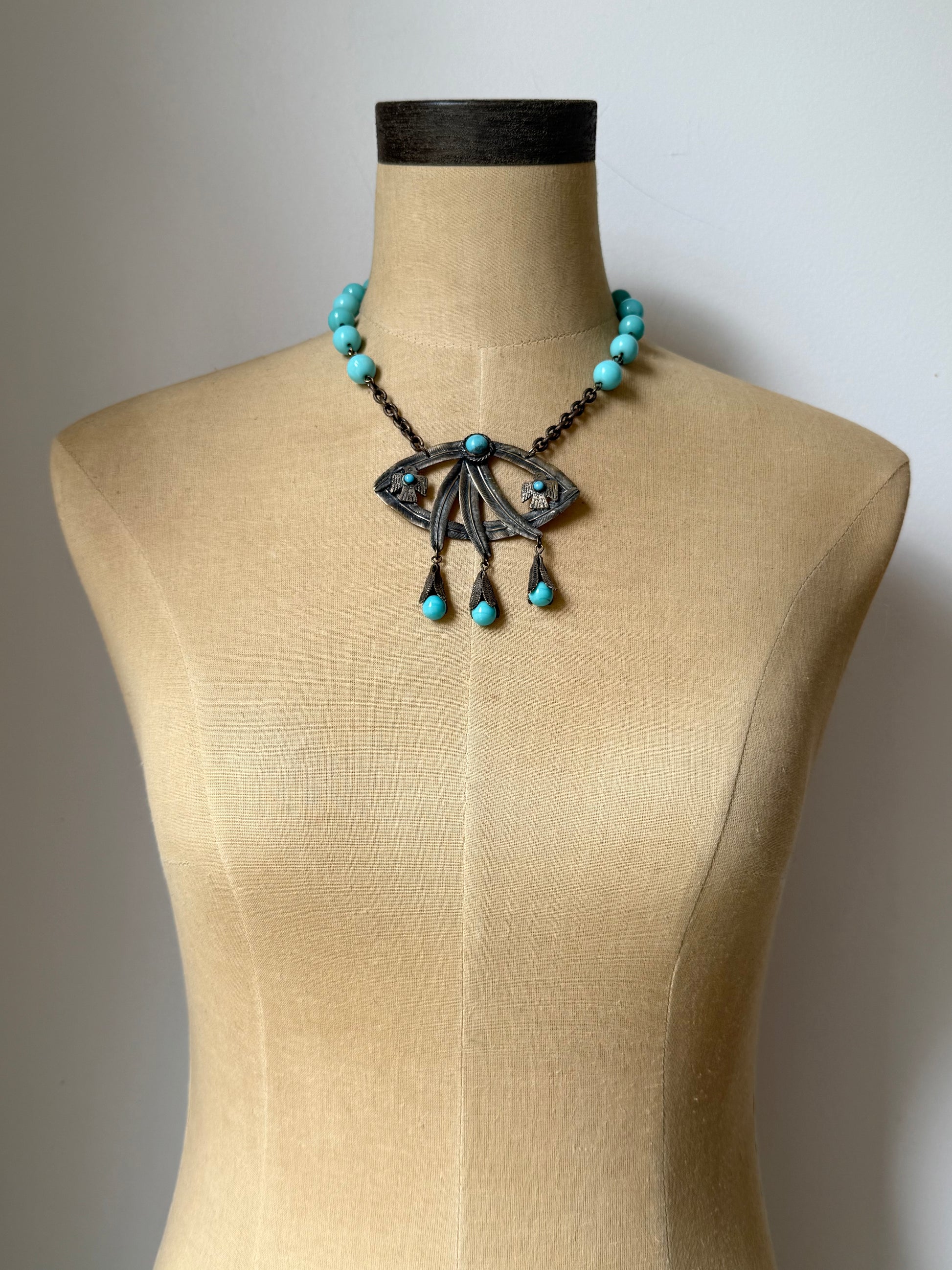 handmade chain from beautiful vintage turquoise blue Japanese glass beads and vintage bronze colored brass chain.