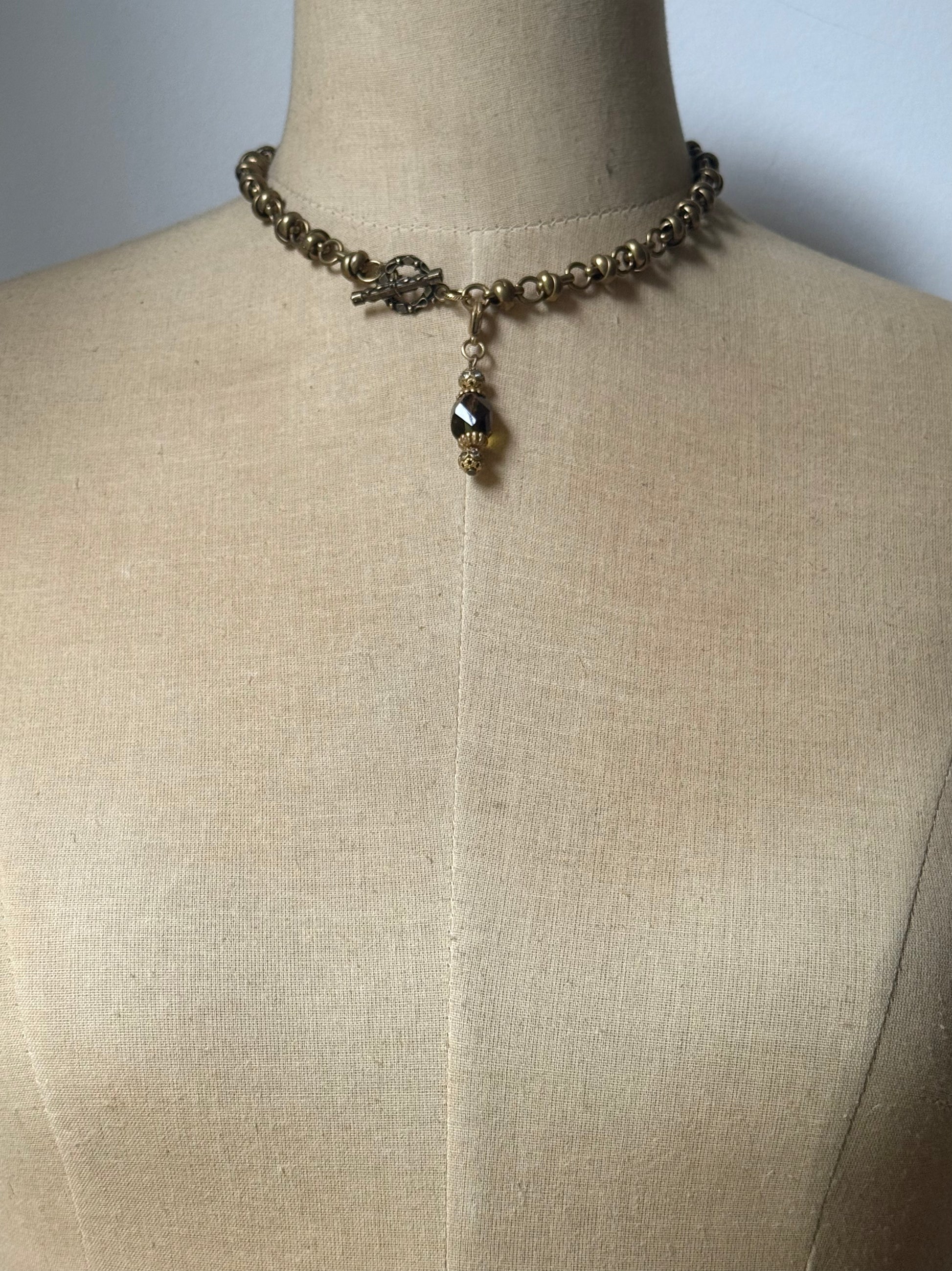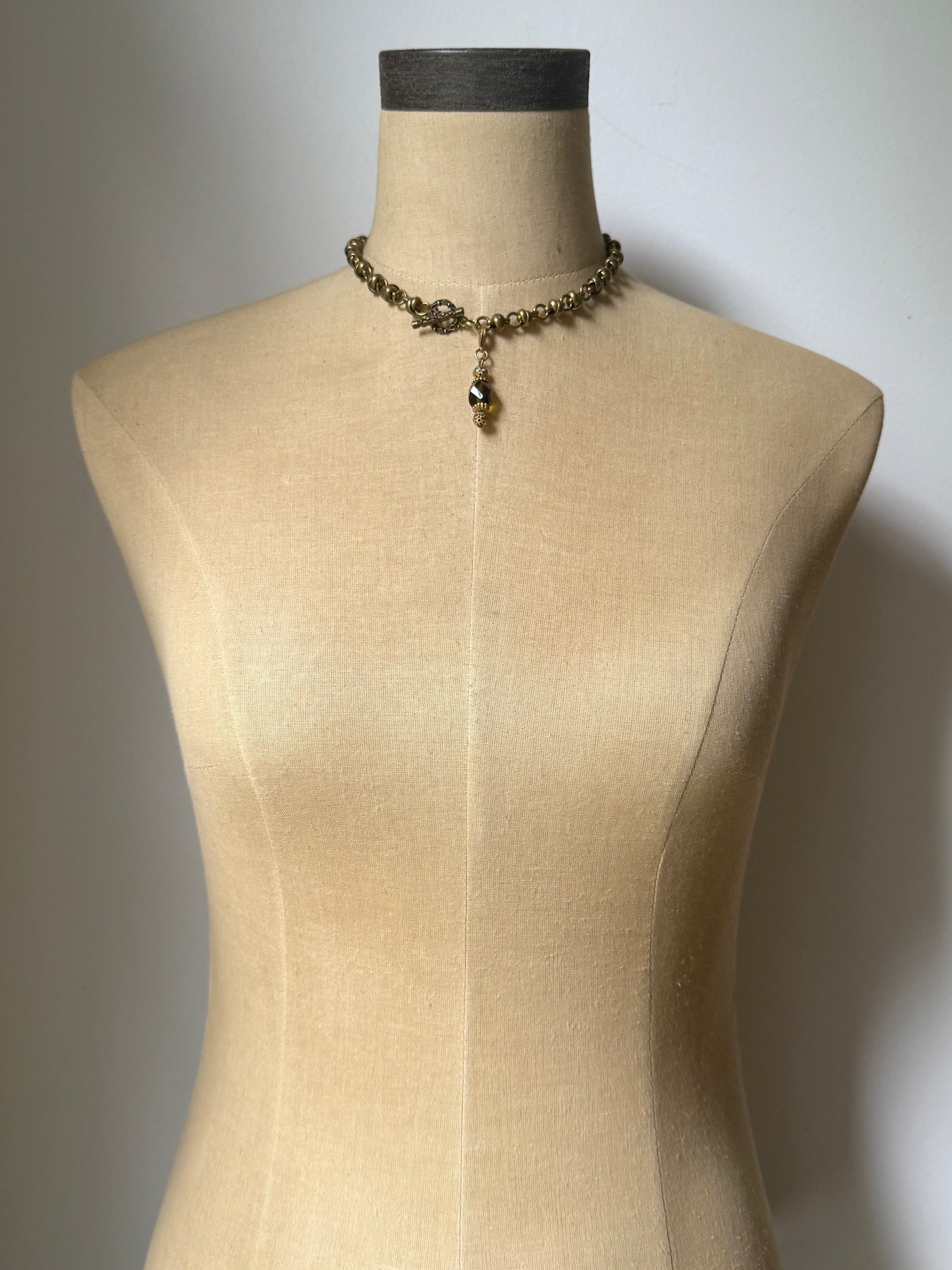 vintage two toned brown and olive green glass bead flanked by 1950’s brass bead caps and vintage style antique gold rhinestone beads. the warm unpolished solid brass collete chain adds a tactile richness to the piece.