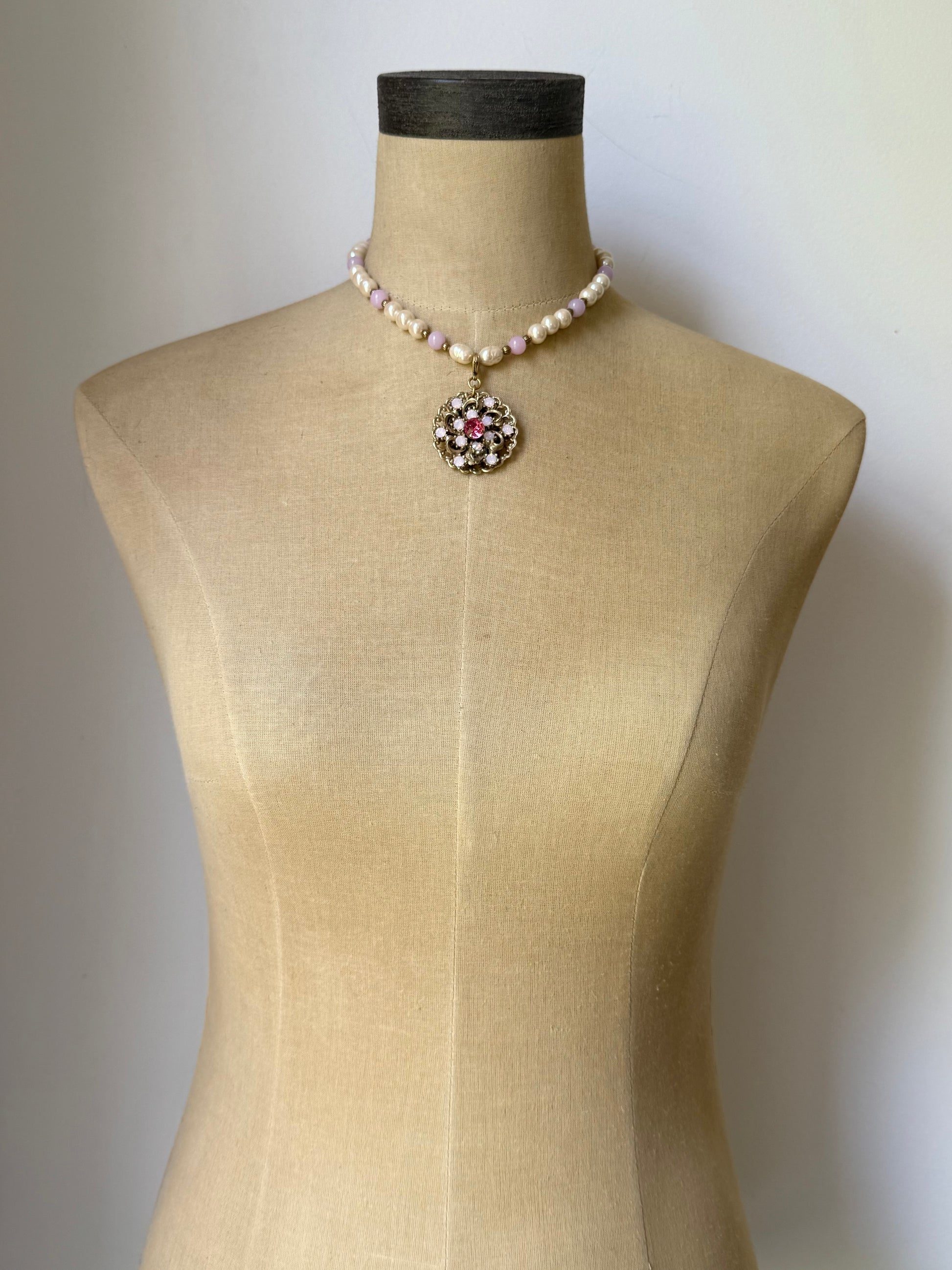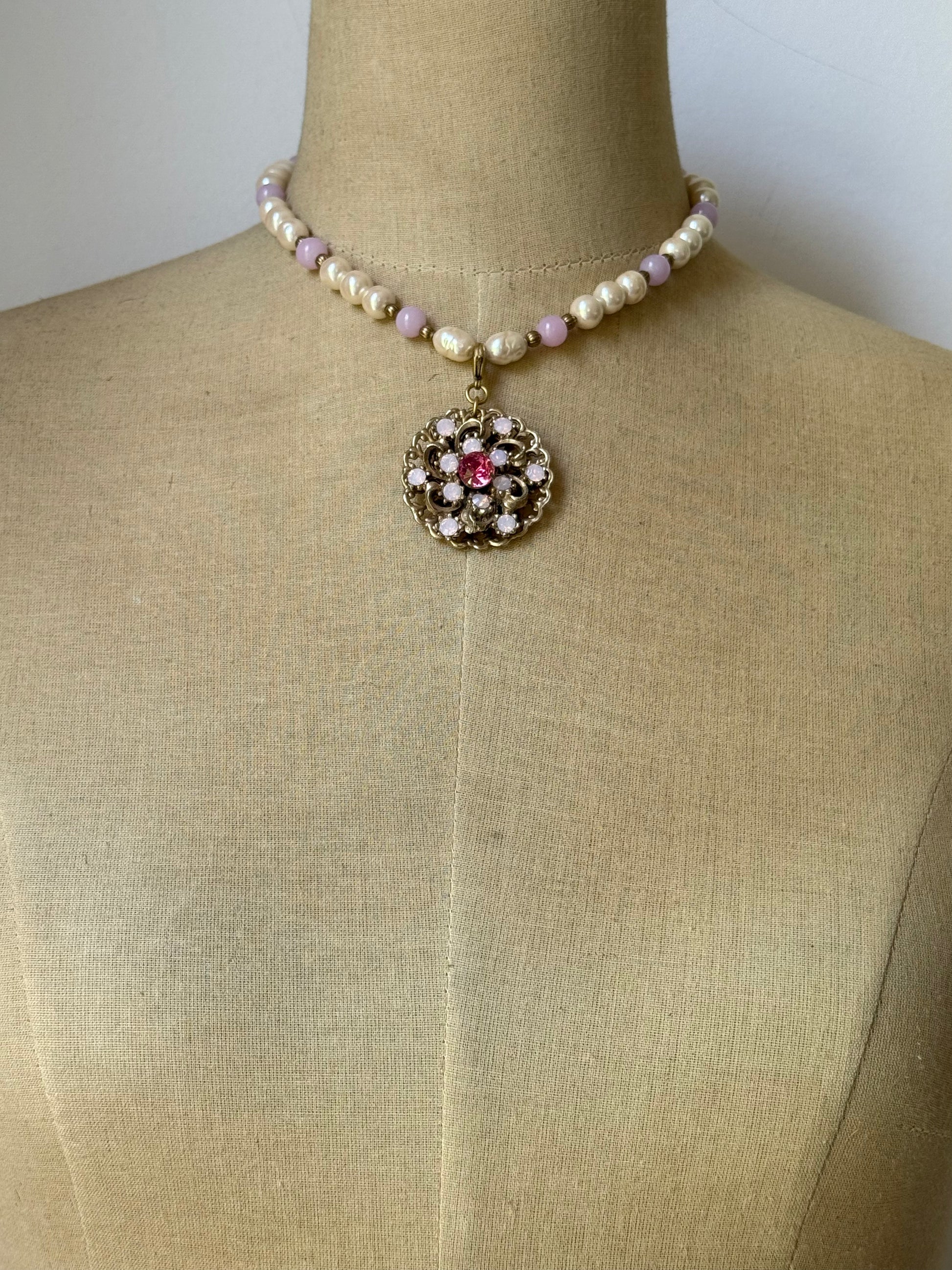 vintage brooch turned pendant with rose water opal and large pink swarovski rhinestones.