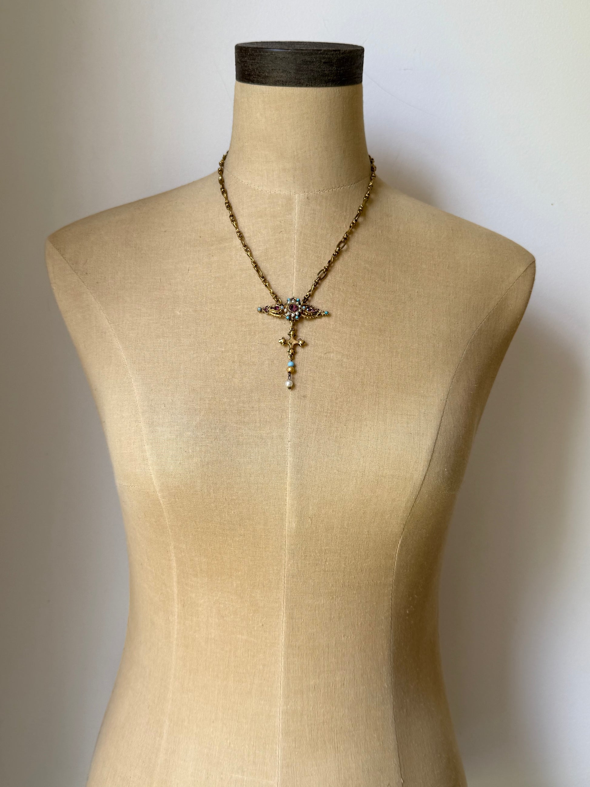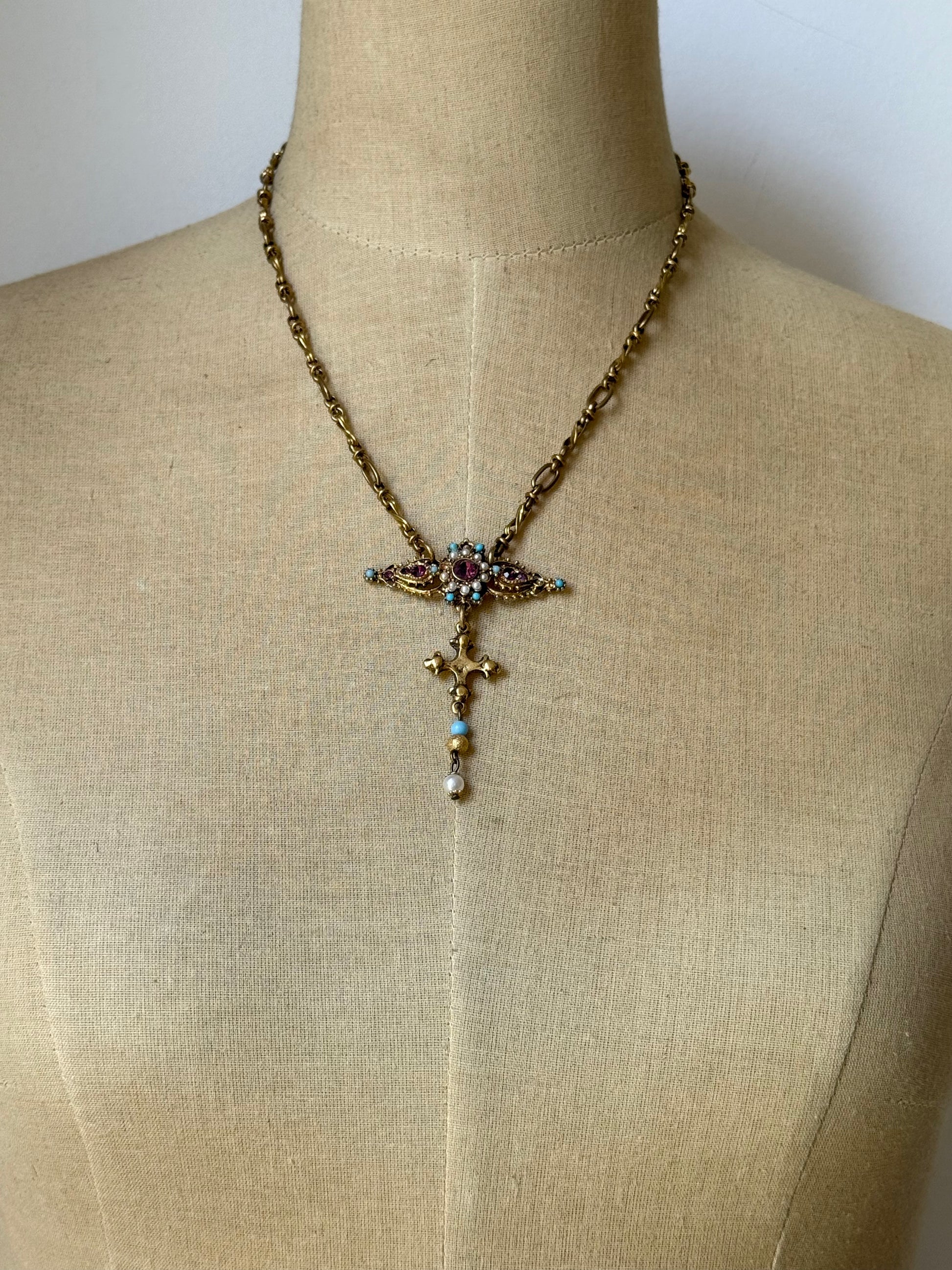 an antique vintage gold-patinated metal brooch, adorned with luminous faux pearls, faux turquoise beads, and deep purple glass rhinestones. paired with a 12k antique gold plated pewter cross connector, featuring all vintage elements: a textured gold bead, a classic faux pearl, and a soft blue accent bead. suspended from a vintage raw brass standish chain with a natural patina, enhancing its aged character. finished with a 12k antique gold plated pewter toggle clasp for a touch of timeless elegance.