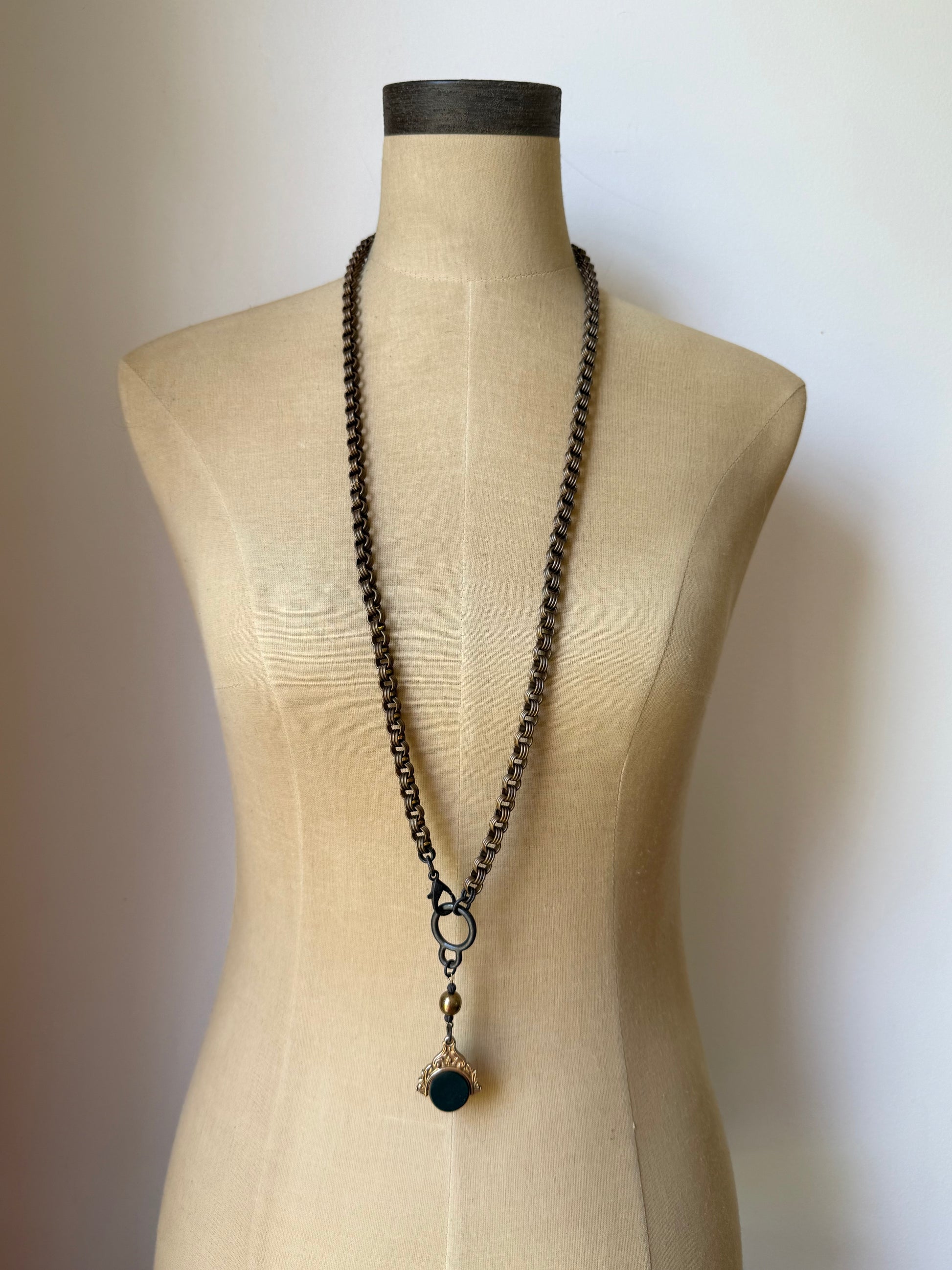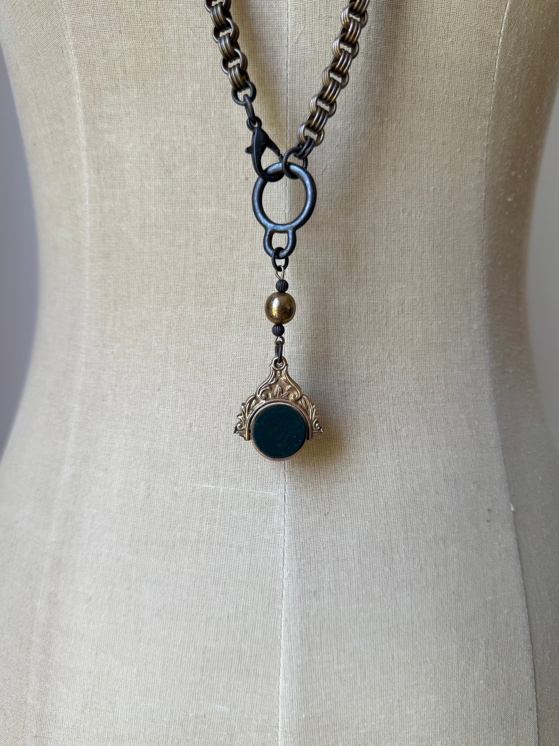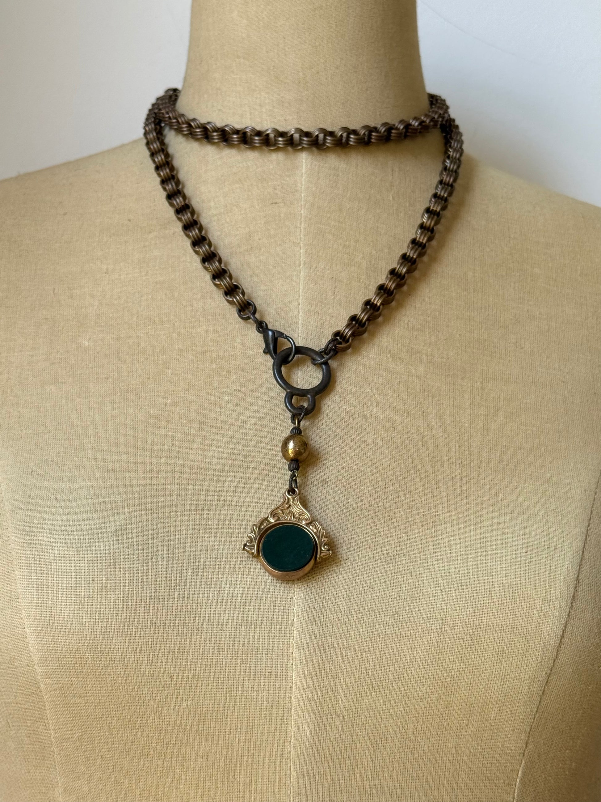 antique 9 carat gold spinning watch fob pendant, featuring rich bloodstone on one side and deep carnelian on the reverse. this elegant double-sided centerpiece is accented by a beautifully patinated bronze-covered vintage lucite bead, adding warmth and contrast to the design. the pendant hangs from a vintage solid brass grooved rolo chain that offers both texture and timeless charm. finished with a rustic brown lobster claw clasp and matching toggle ring, both lead and cadmium free.