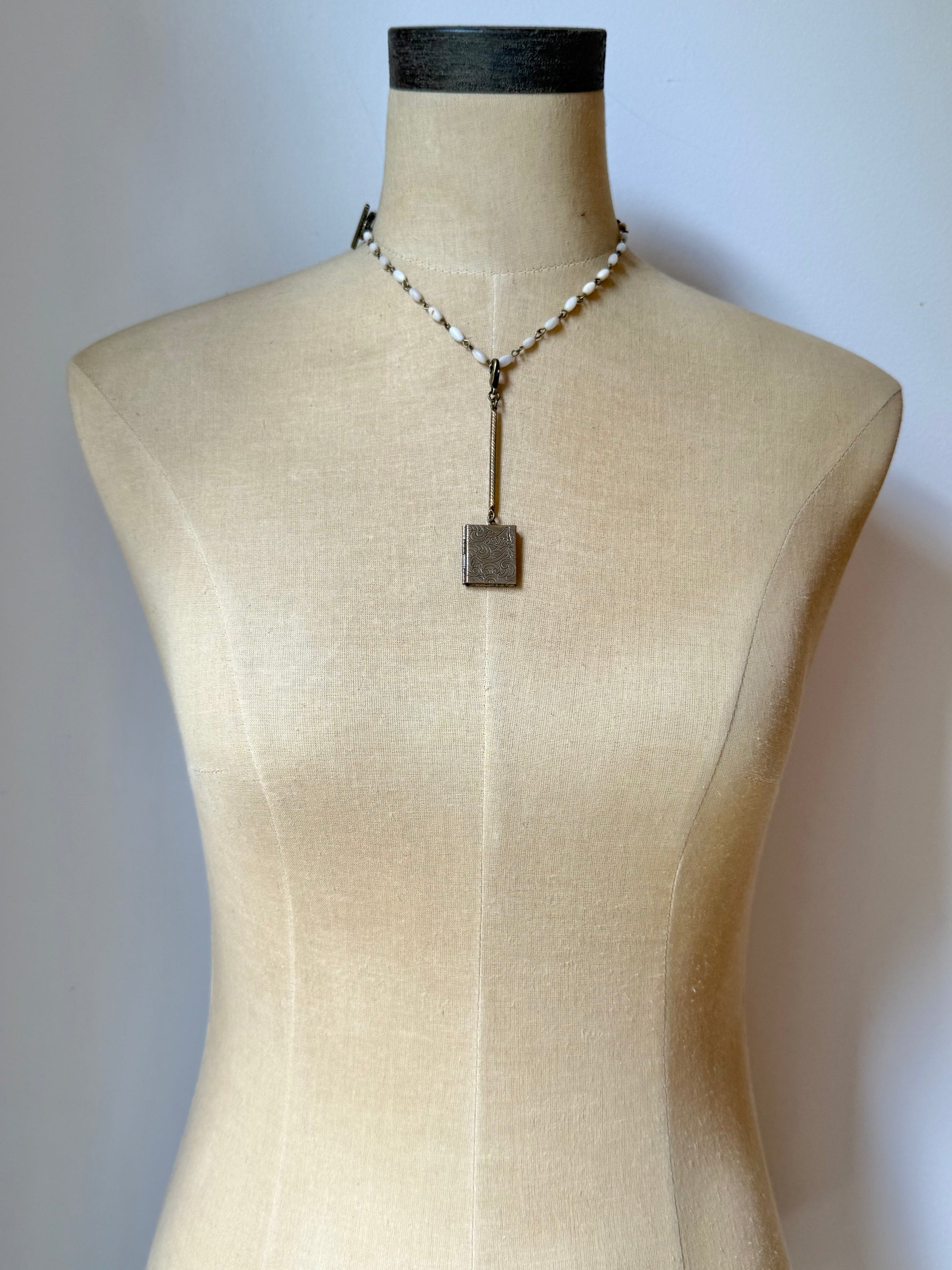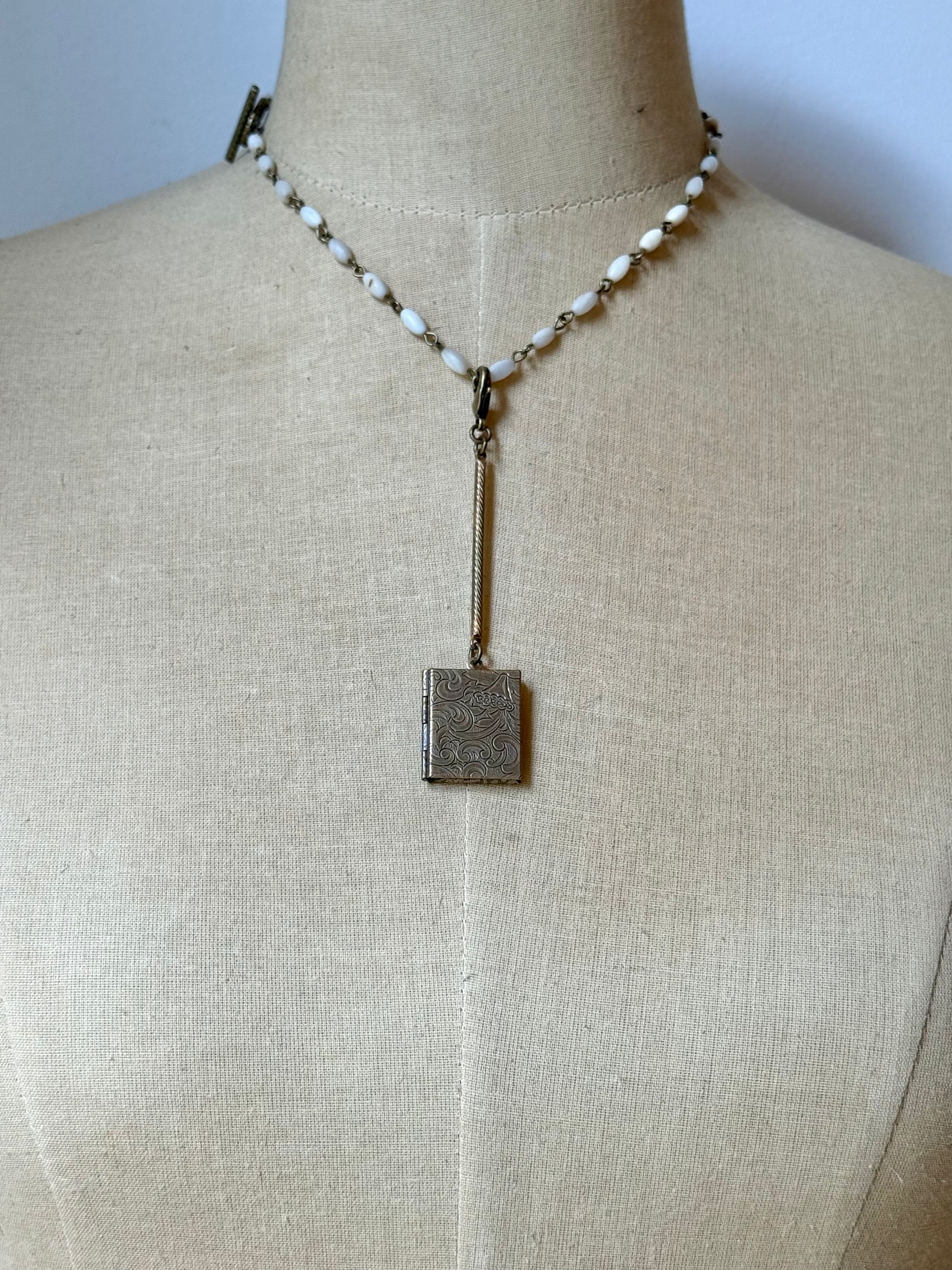 suspended from this graceful strand is a vintage-style hand-tooled book locket, a romantic keepsake piece with hinged covers that open to hold tiny memories or photos. the locket is attached to the chain by a vintage antique brass double connector with a beautiful aged patina, adding a touch of timeworn character and visual intrigue. the intricate tooling on the locket lends a sense of craftsmanship and artistry, enhancing its storybook charm and heirloom quality.