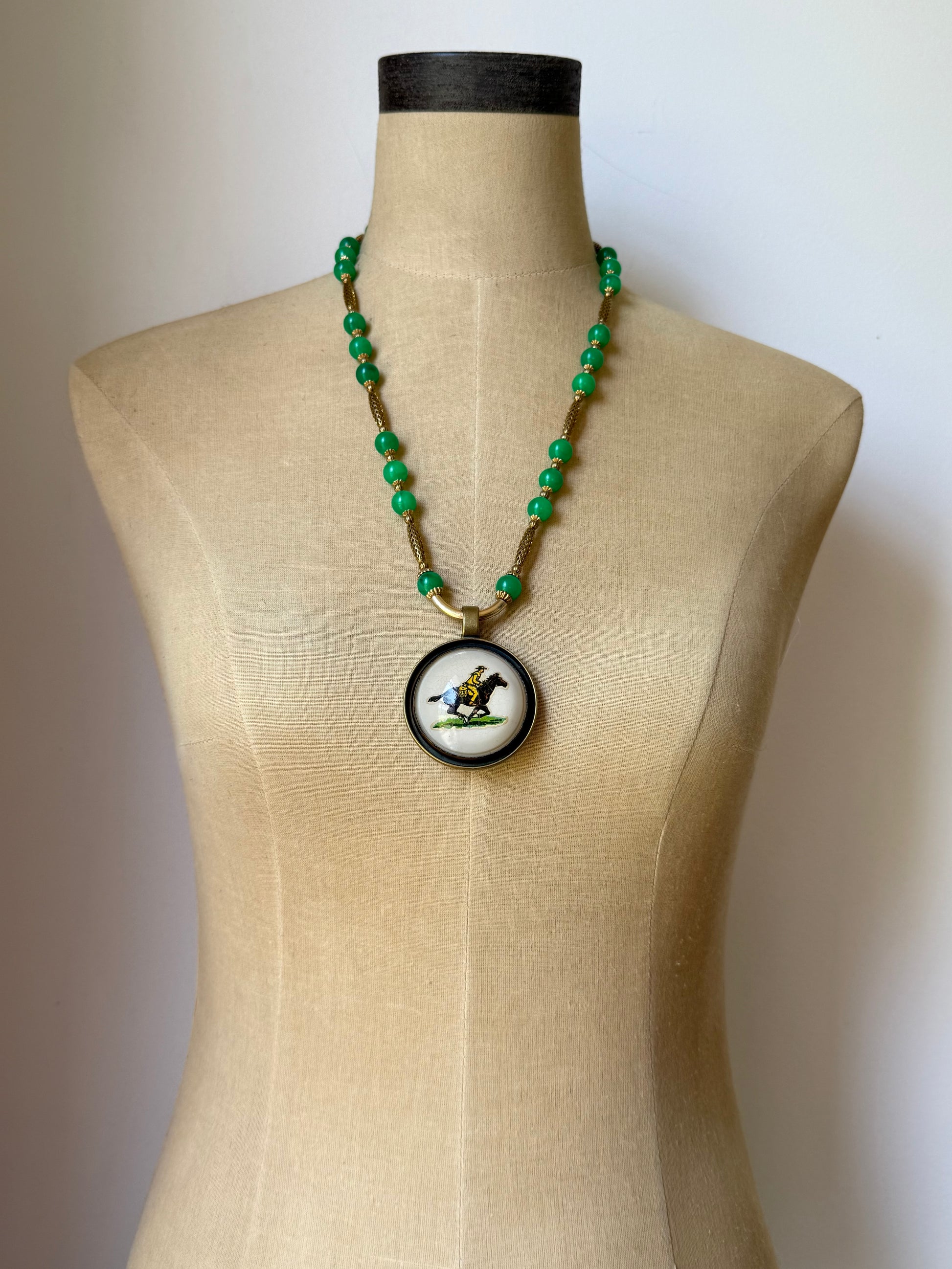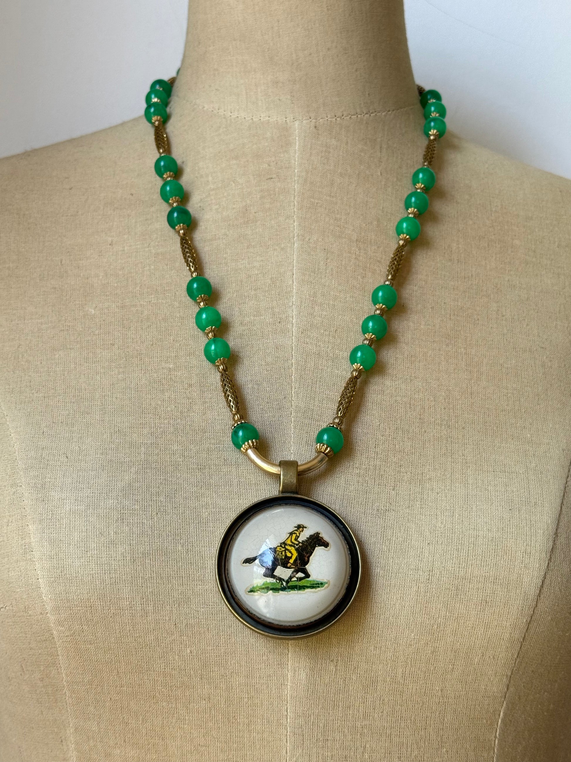 handmade vintage jade green marble lucite beaded chain with vintage gold plated brass tube beads, vintage 1950’s brass bead caps and small vintage brass ribbed beads.
