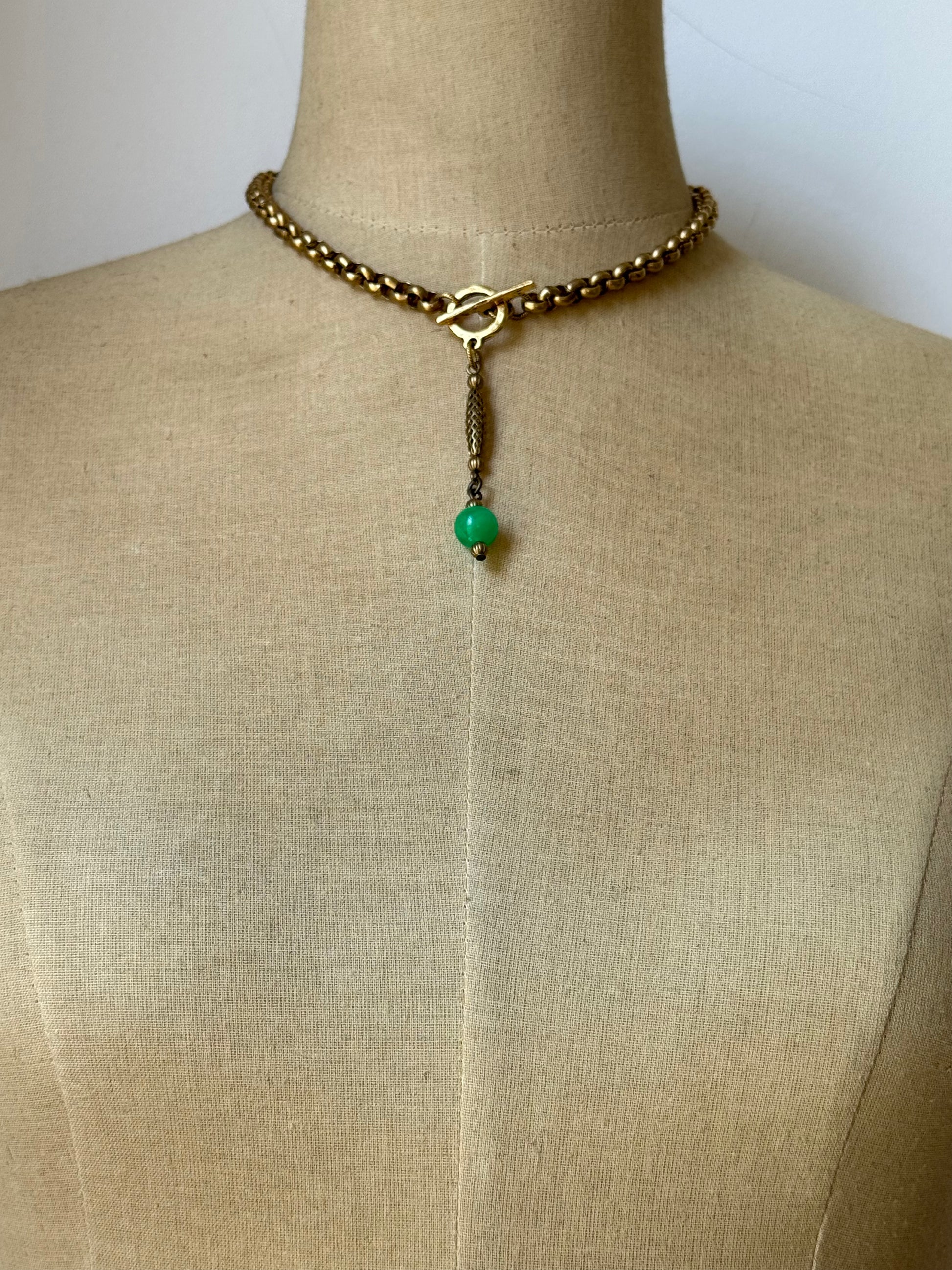 vintage green marble lucite bead adorned with rare vintage open weave pattern brass bead. both accented by small vintage ribbed brass beads.