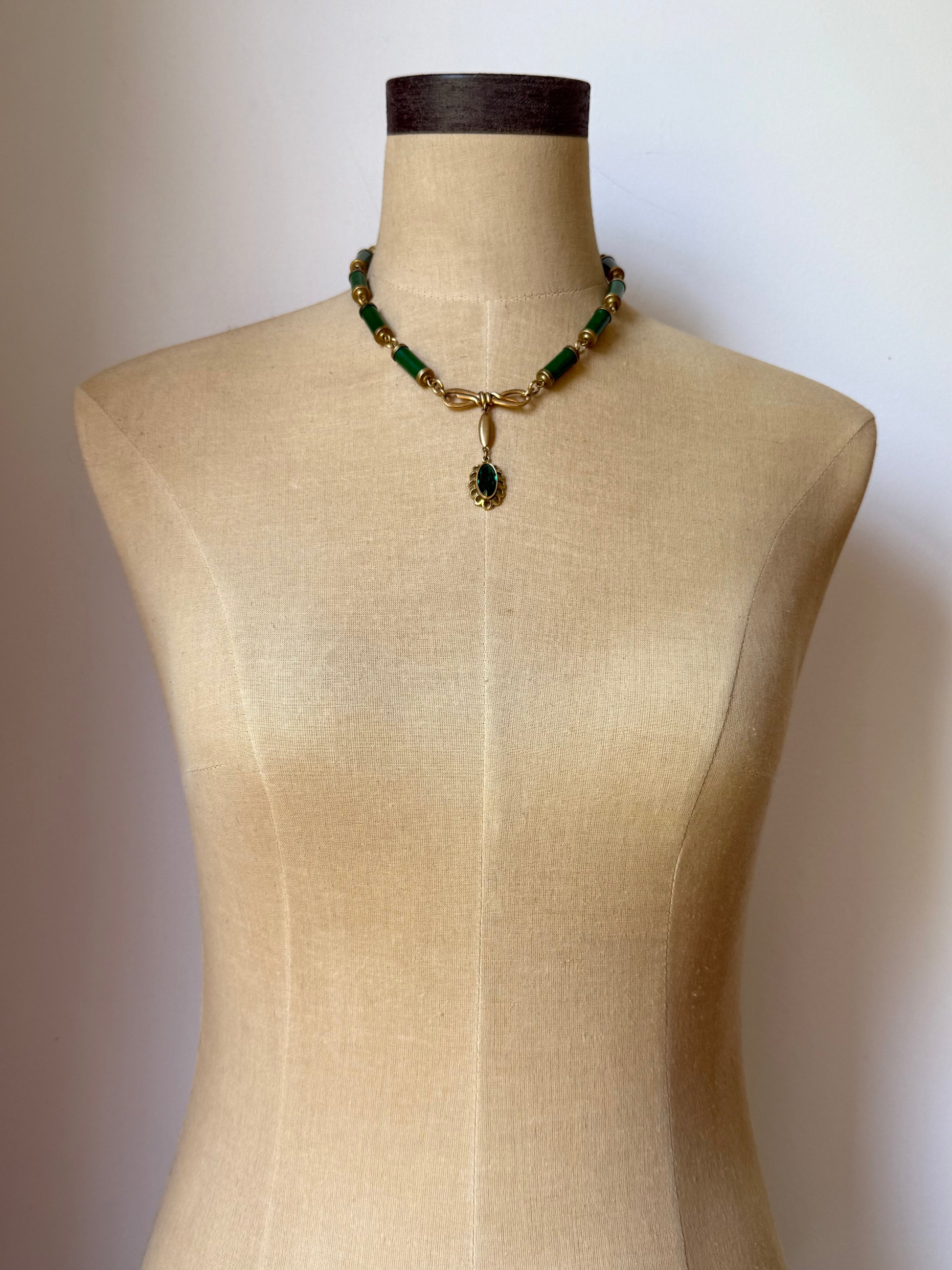 vintage 1940’s emerald green glass crystal stone on brass bow brooch.