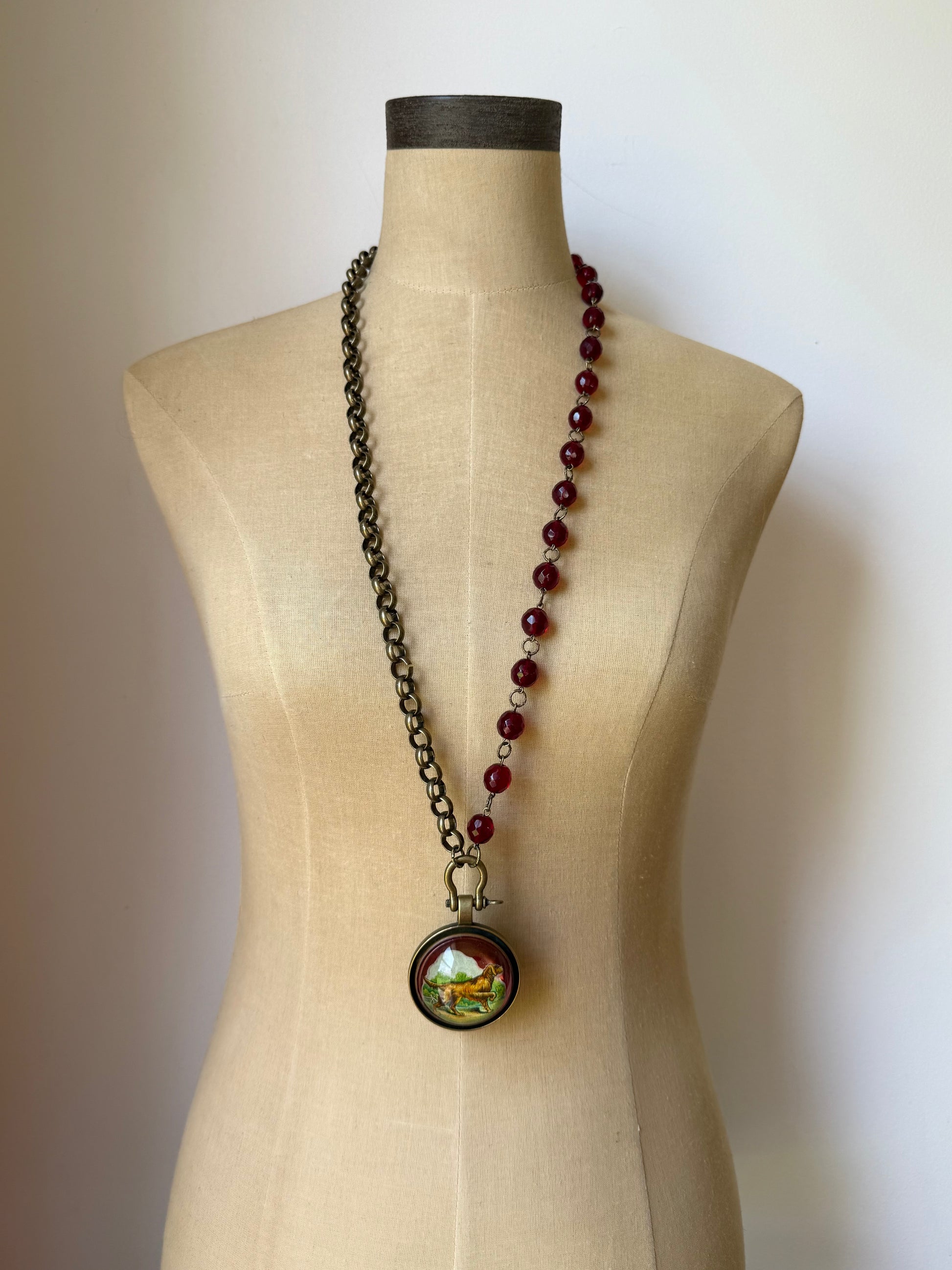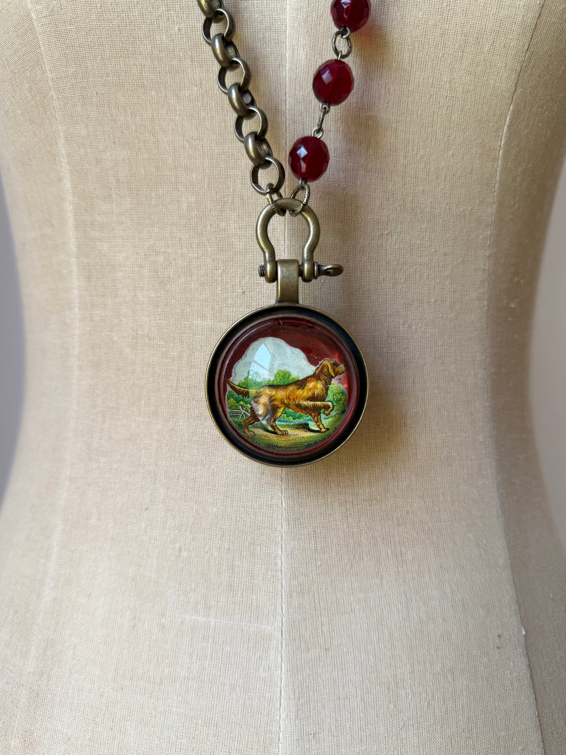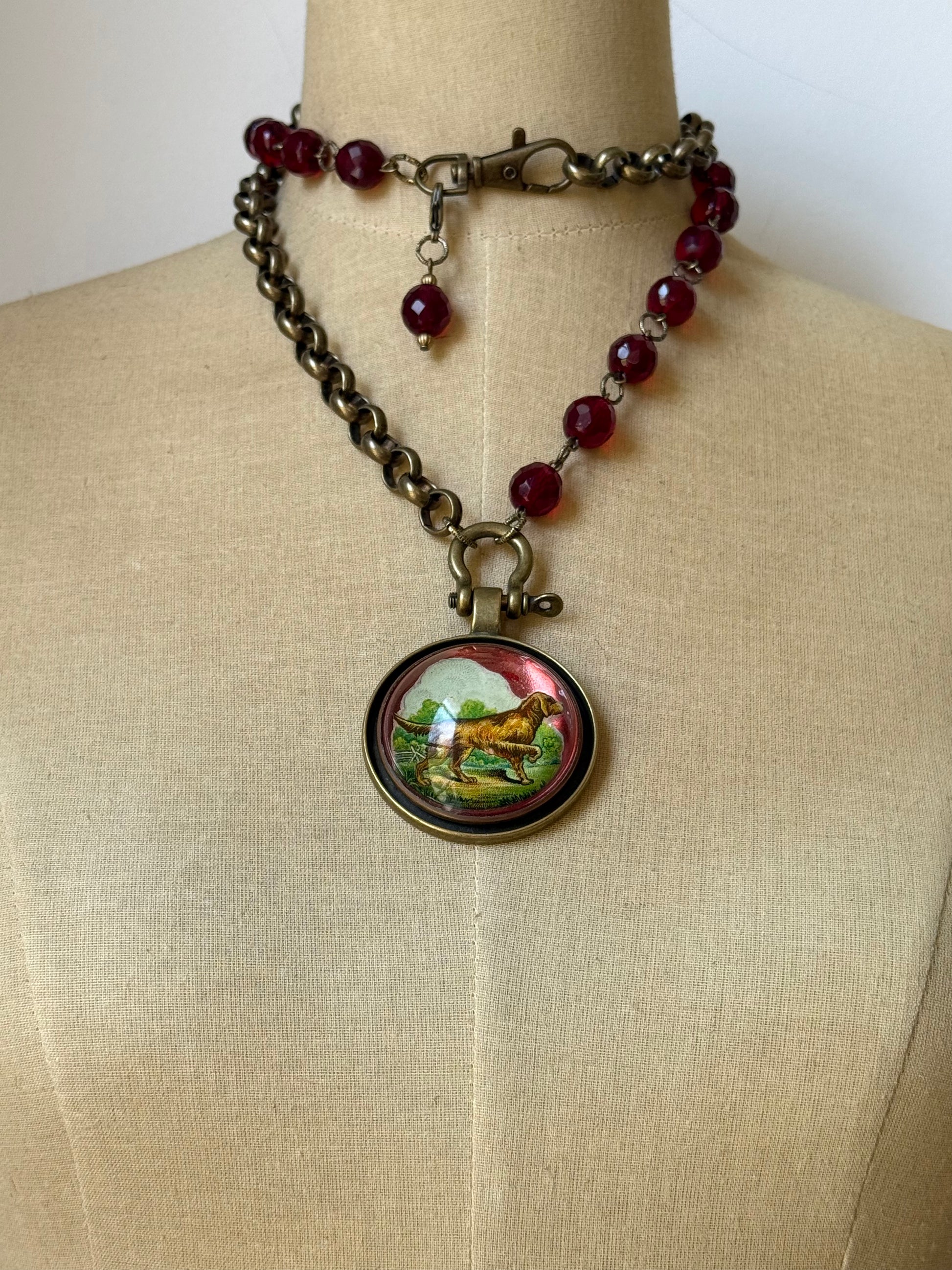 antique horse bridle rosette brooch with retriever hunting dog attached to handmade chain by a brass shackle clasp. Chain is made with large brass rolo chain and hand beaded vintage dark red vintage czech faceted glass beads.
