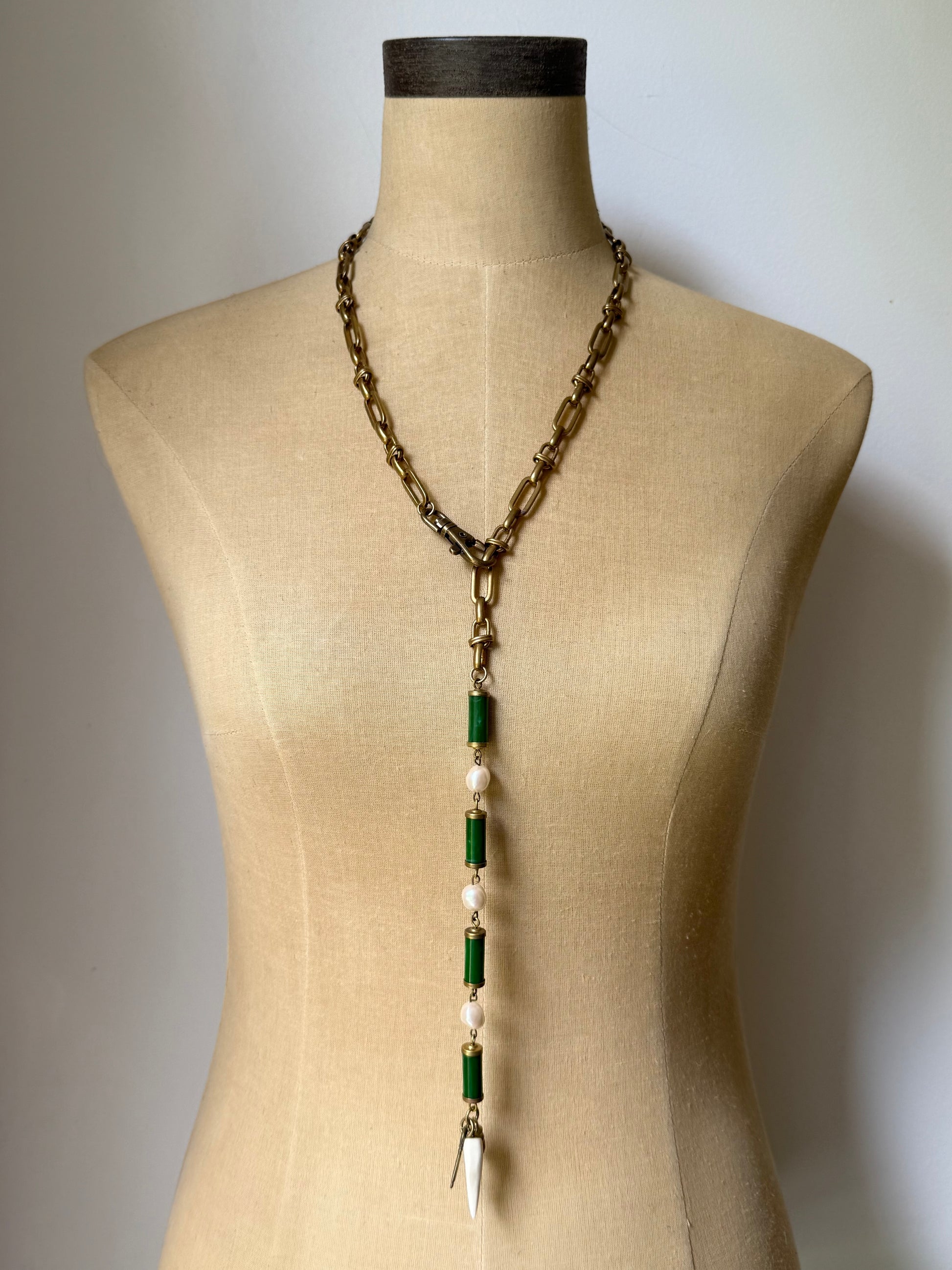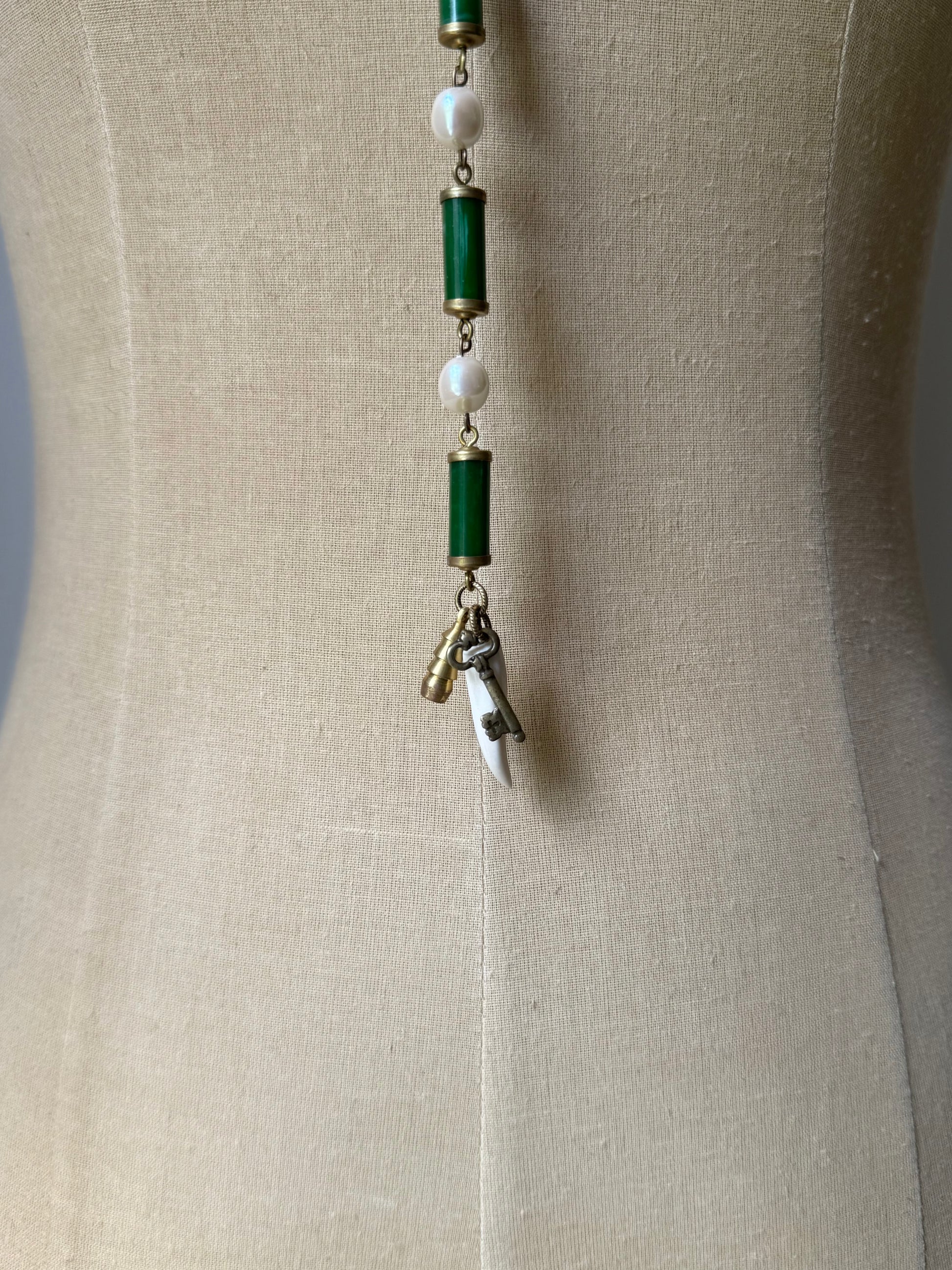vintage japanese faux baroque pearls attached to rare vintage green and brass connectors. three carefully selected vintage charms, each telling their own story finish the piece off.