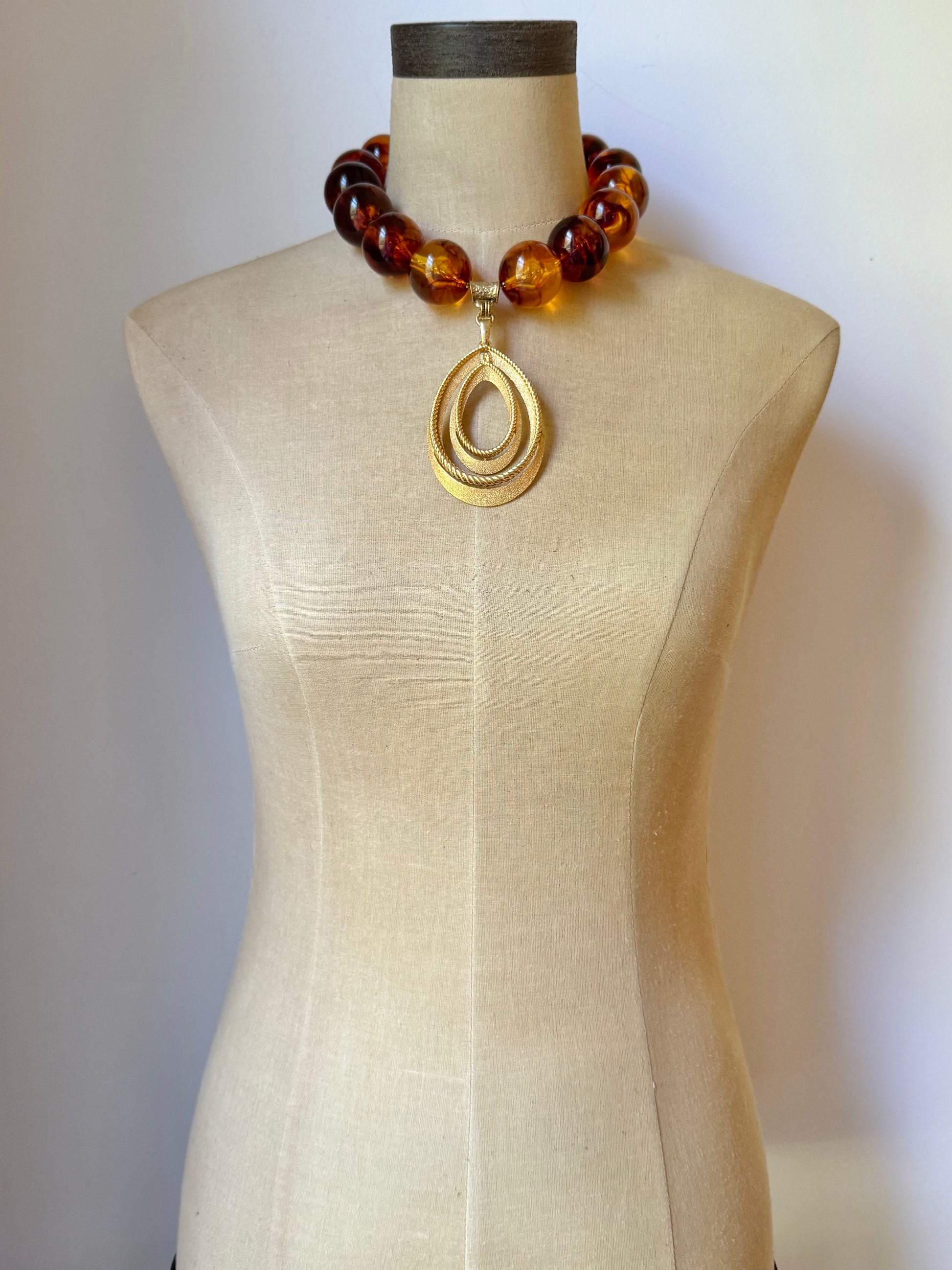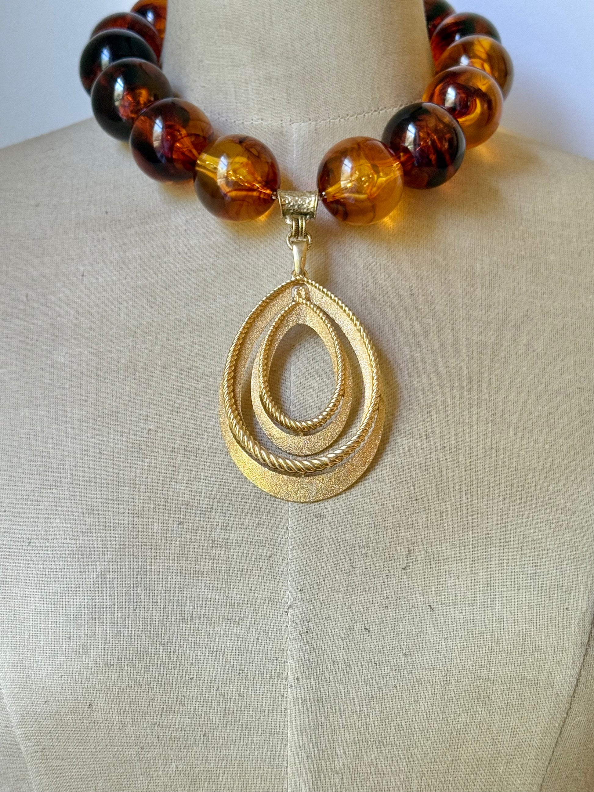 vintage 1970s gold-plated teardrop pendant gleams with timeless elegance, suspended from a handmade chain that pairs extra-large acrylic tortoiseshell beads with the delicacy of a fine gold-plated rolo link. each bead is rare and carefully chosen, lending the piece both boldness and refinement. the design is finished with an organic toggle clasp of antique gold-finished pewter, set with a rhinestone for a subtle sparkle. this clasp, us-made and crafted to be lead and cadmium free, echoes the old-world artistry of vintage closures while meeting modern standards of safety.