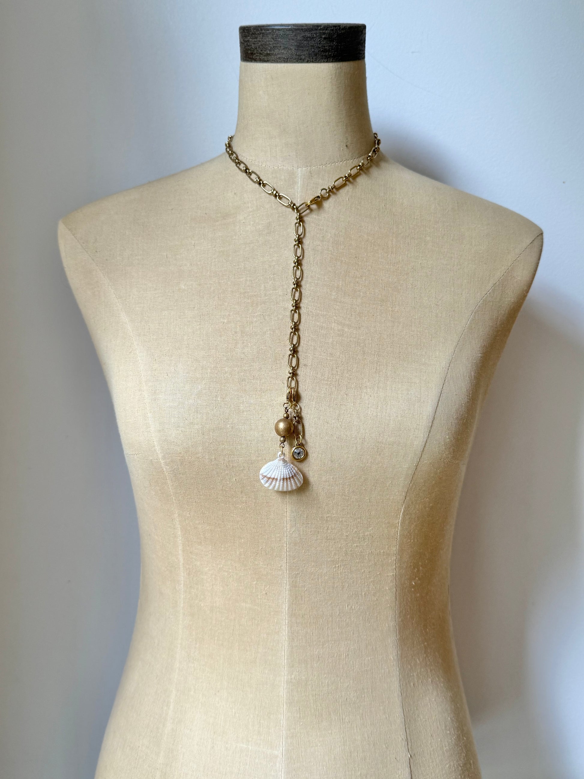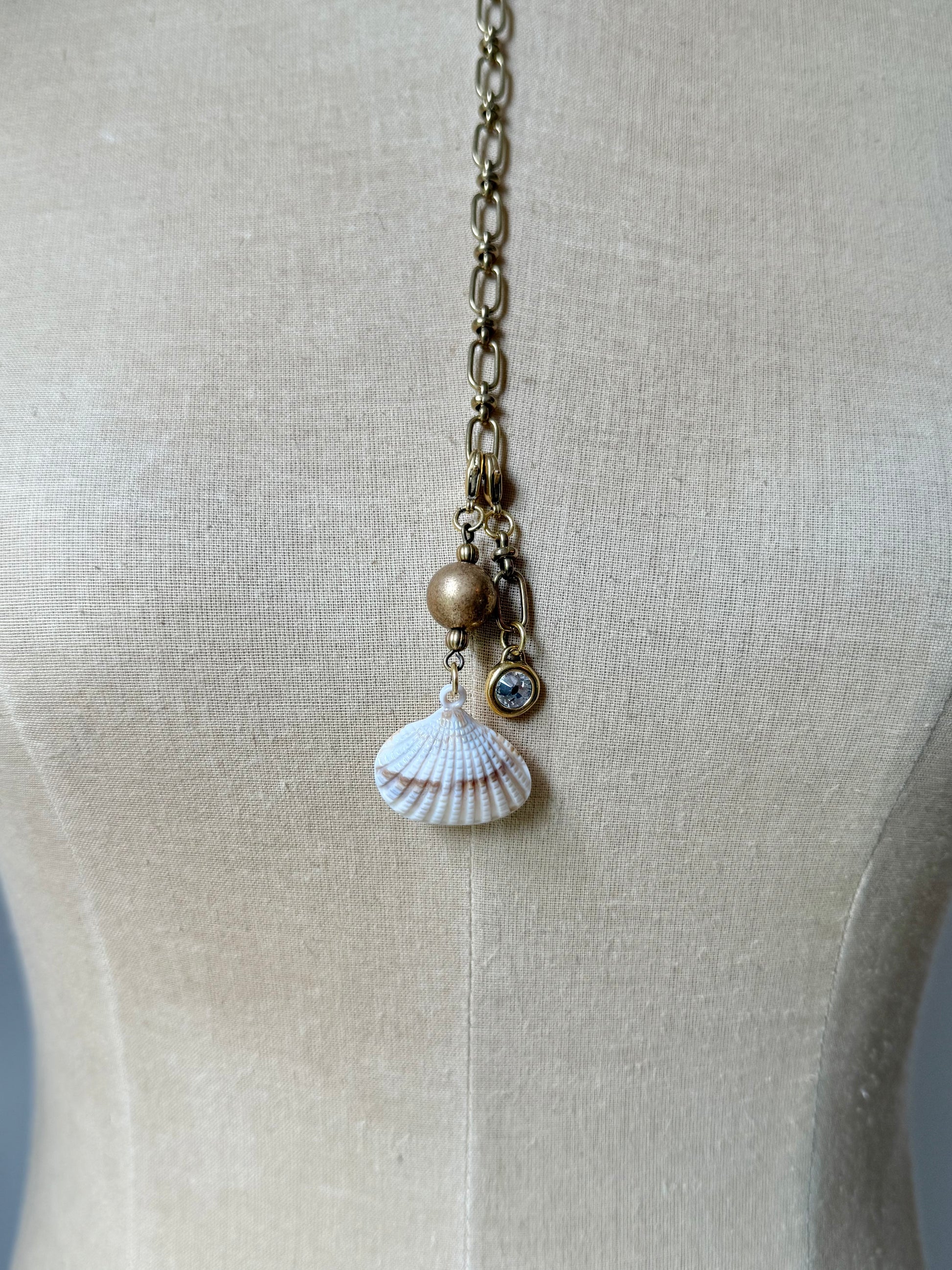 a striking necklace featuring a vintage lucite bead with an elegant brass overlay, flanked by two small vintage ribbed brass beads. from this trio, a warm-toned acrylic shell is gracefully suspended, creating a fluid drop that adds an organic, seaside-inspired touch. the entire pendant arrangement hangs from a richly patinaed vintage solid brass chain that lends depth and aged beauty to the piece. adding a delicate sparkle, a sweet antique gold plated charm with a single rhinestone also dangles from the chain, providing an extra layer of vintage charm and visual interest.