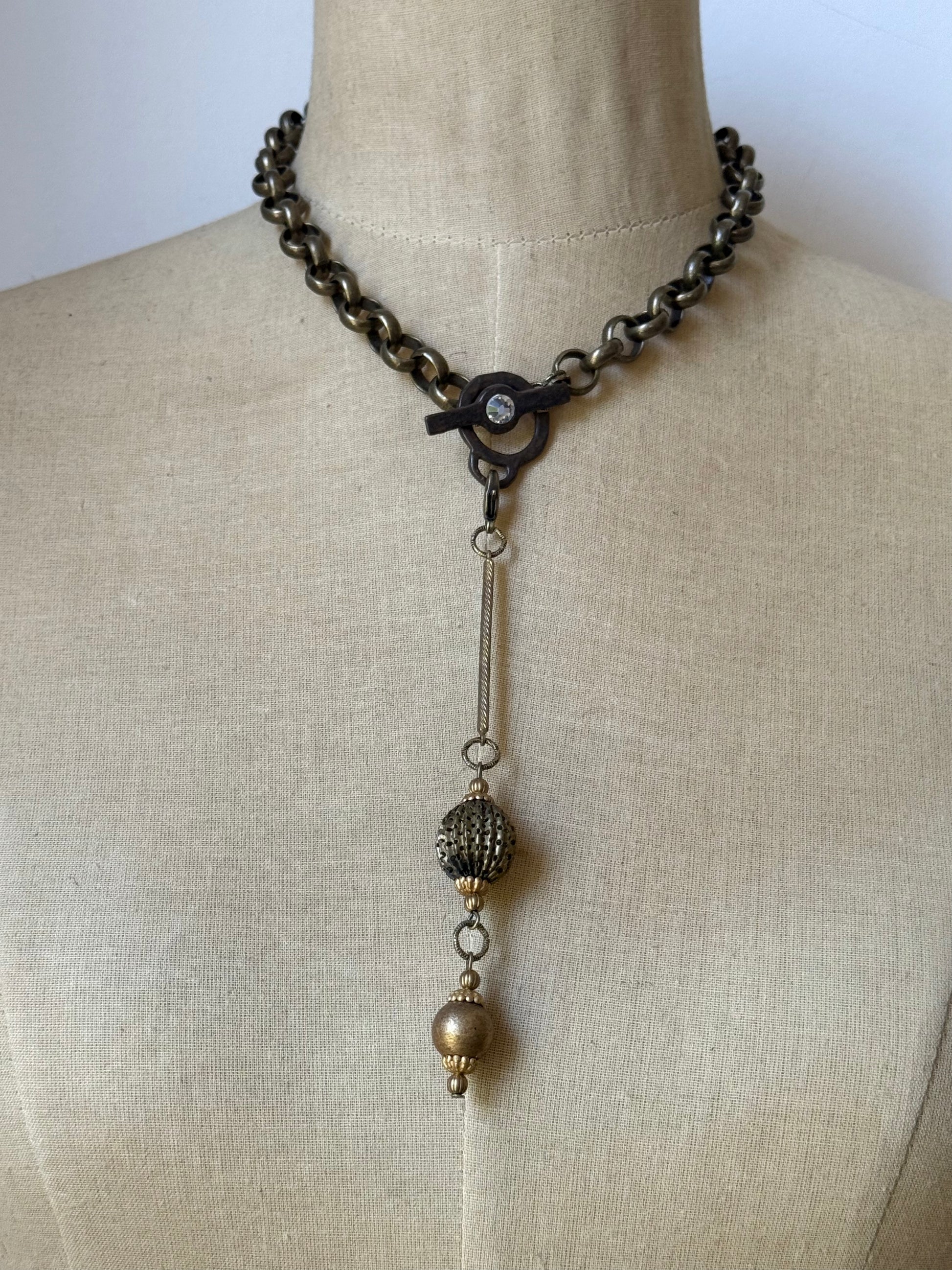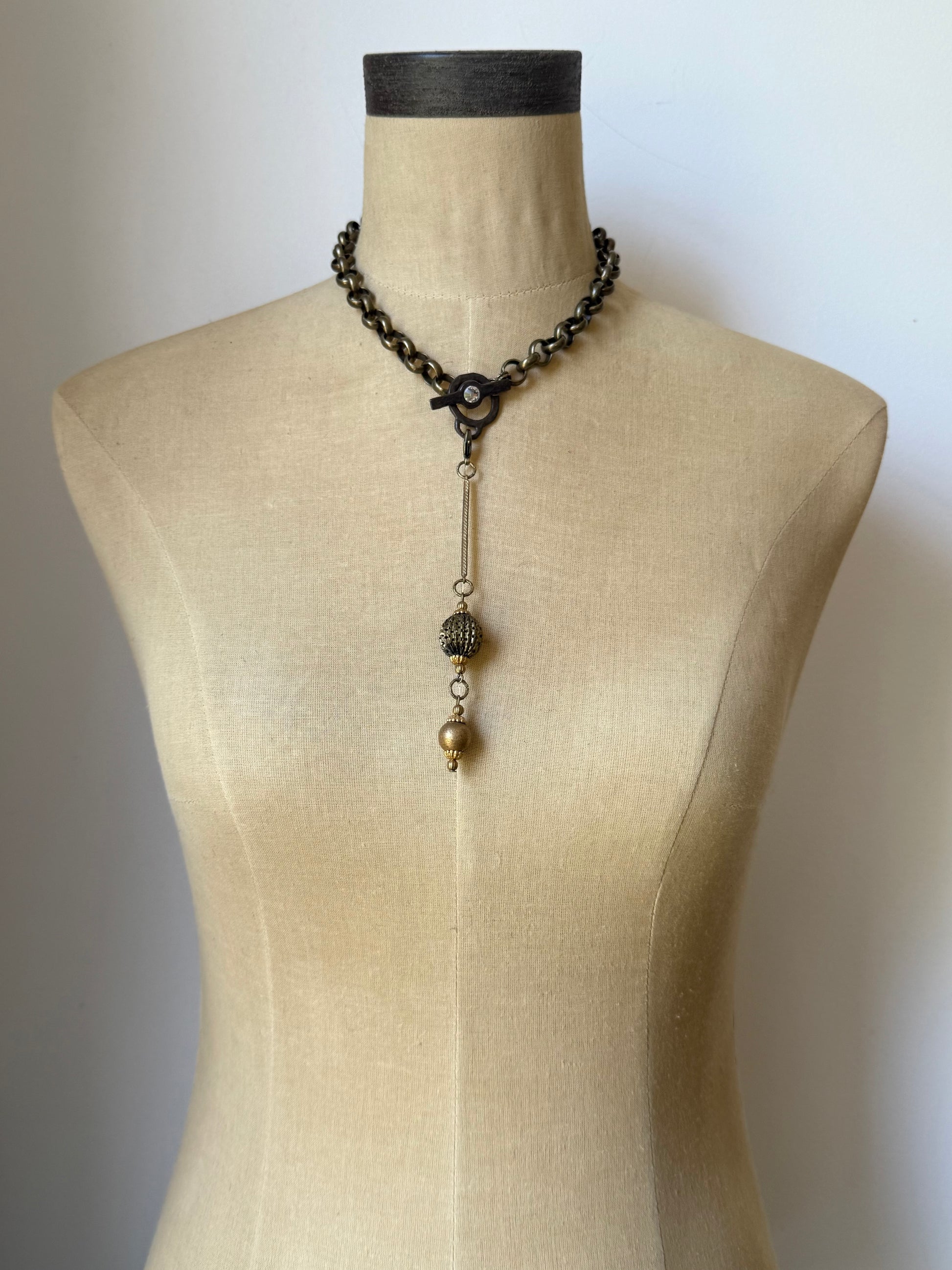 vintage-inspired handmade piece featuring a unique pendant crafted from a vintage corrugated metal bead and a vintage brass-covered lucite bead. both beads are accented with 1950s bead caps and small vintage ribbed brass beads, giving it a distinct aged charm. the pendant is suspended from a rustic brown rhinestone toggle via a long, antique gold brass connector. the chain itself is a bold, antique brass plated large rolo chain, adding a sturdy and timeless feel to the overall design.