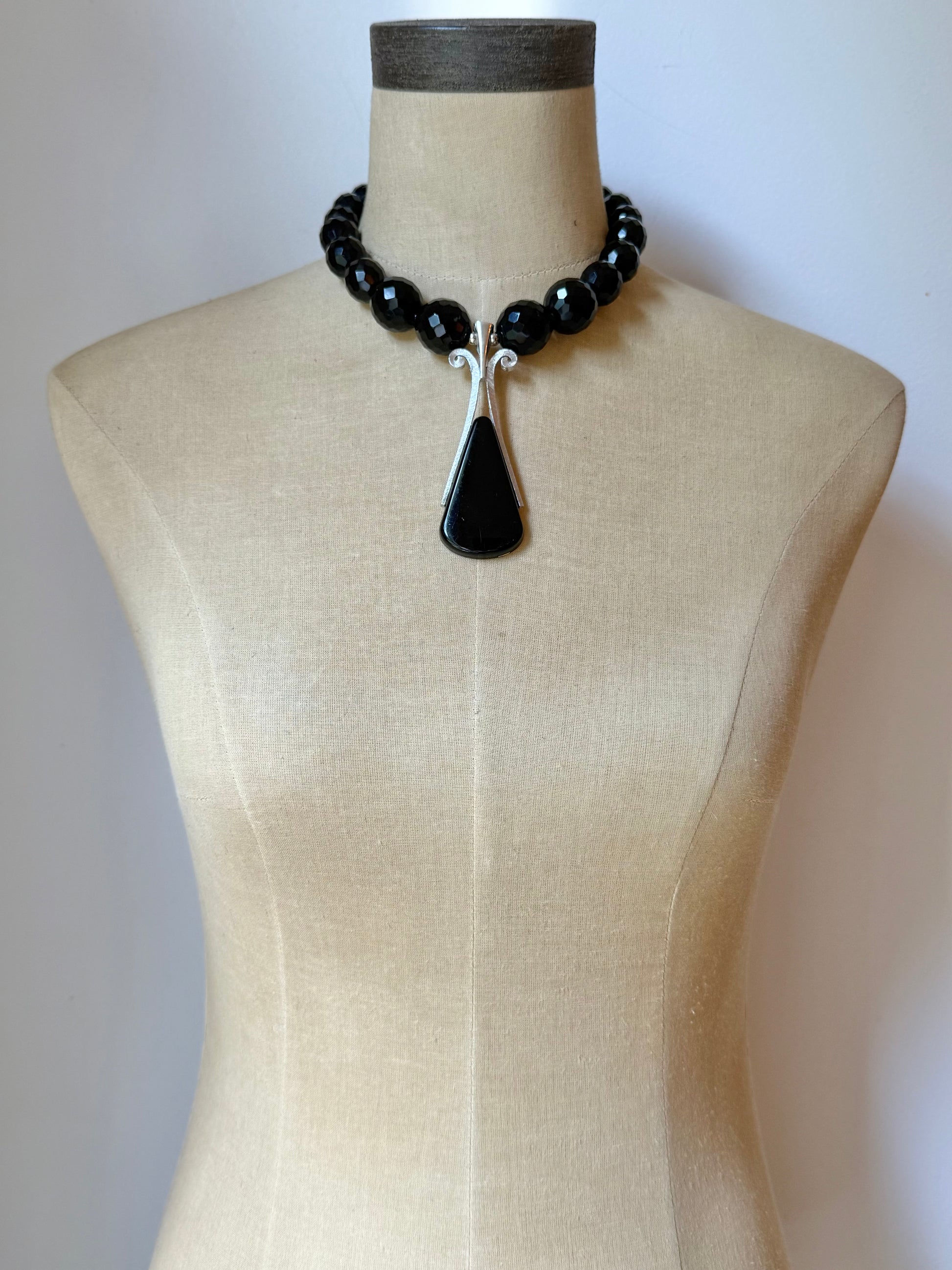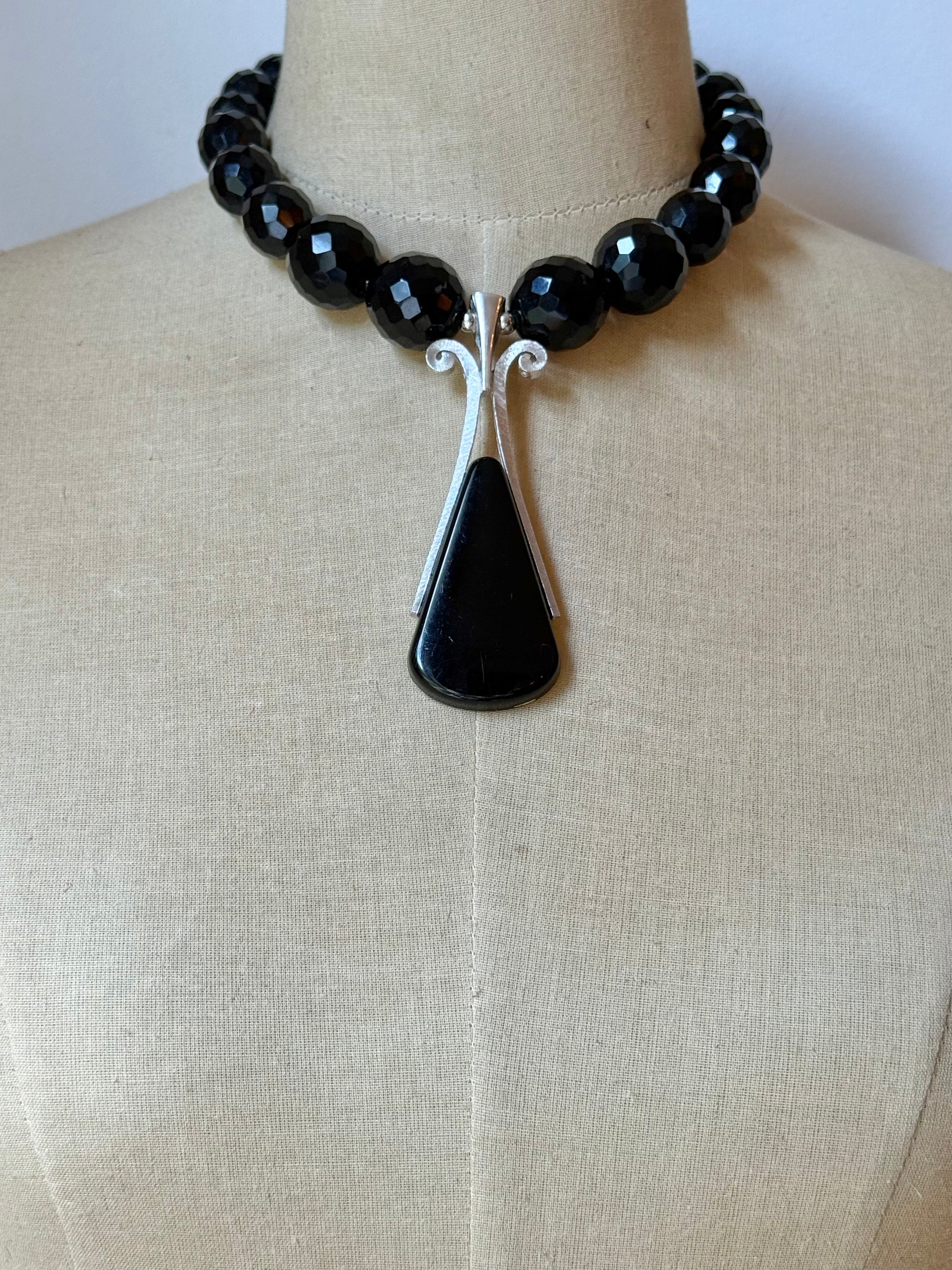 fabulous vintage french statement necklace featuring bold, chunky jet black crystal beads in a dramatic graduated silhouette, hand-strung to reimagine a new piece from classic elements. the centerpiece is a striking vintage avon mod pendant from the 1970s—an oversized teardrop of sleek black lucite adorned with a brushed silver-tone accent, channeling the bold spirit of retro design. the contrast between the luminous french jet crystals and the sculptural pendant creates a captivating balance of elegance and edge. finished with an antique pewter old-world style toggle clasp, this one-of-a-kind necklace merges timeless glamour with a fresh, reimagined perspective.