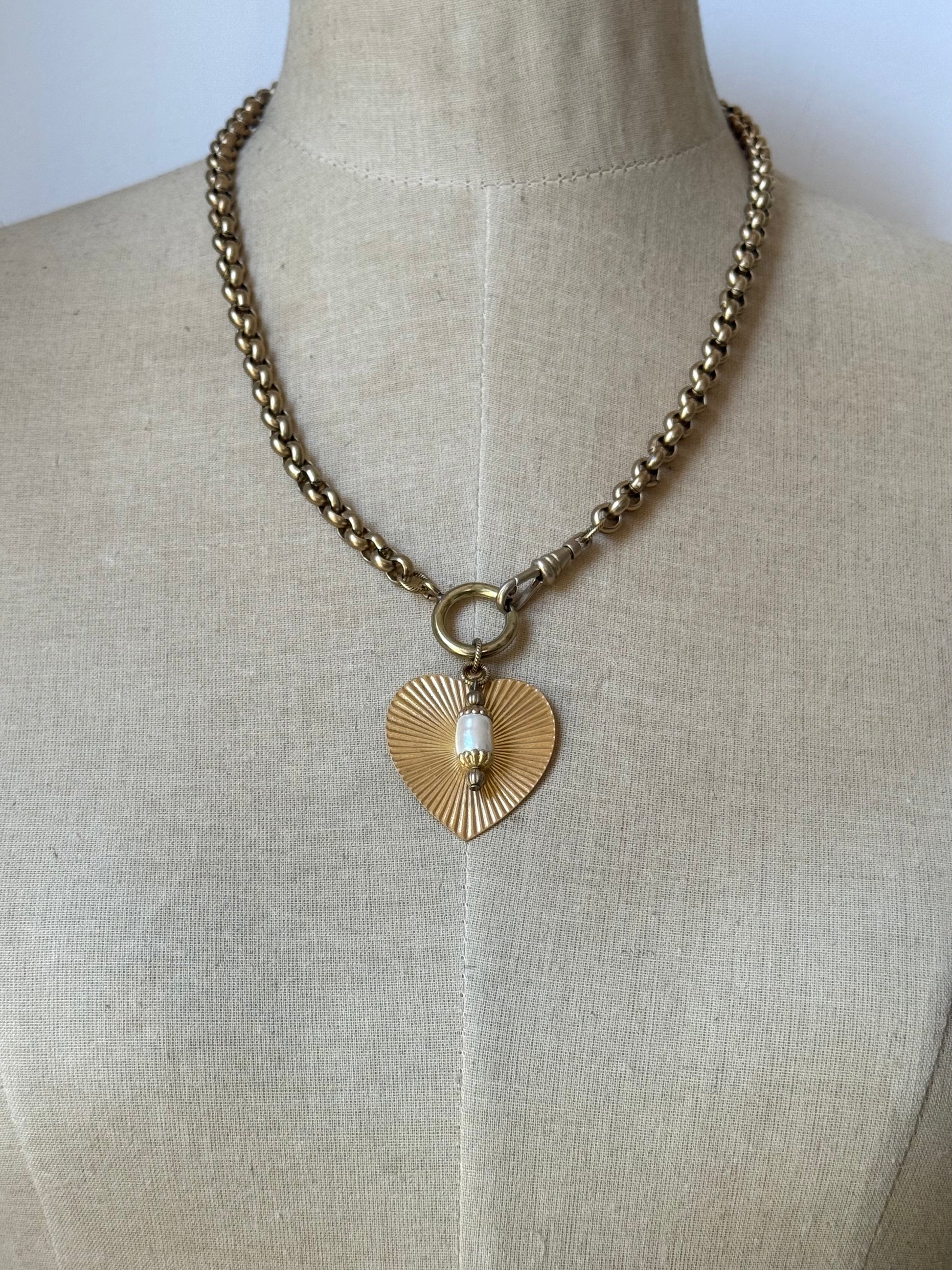 rare vintage miriam haskell brass heart pendant accented with vintage haskell glass baroque pearl adorned with 1950’s brass beads caps and small vintage brass ribbed beads. attached to chain with vintage brass spring clasp and vintage gold plated brass swivel clip.