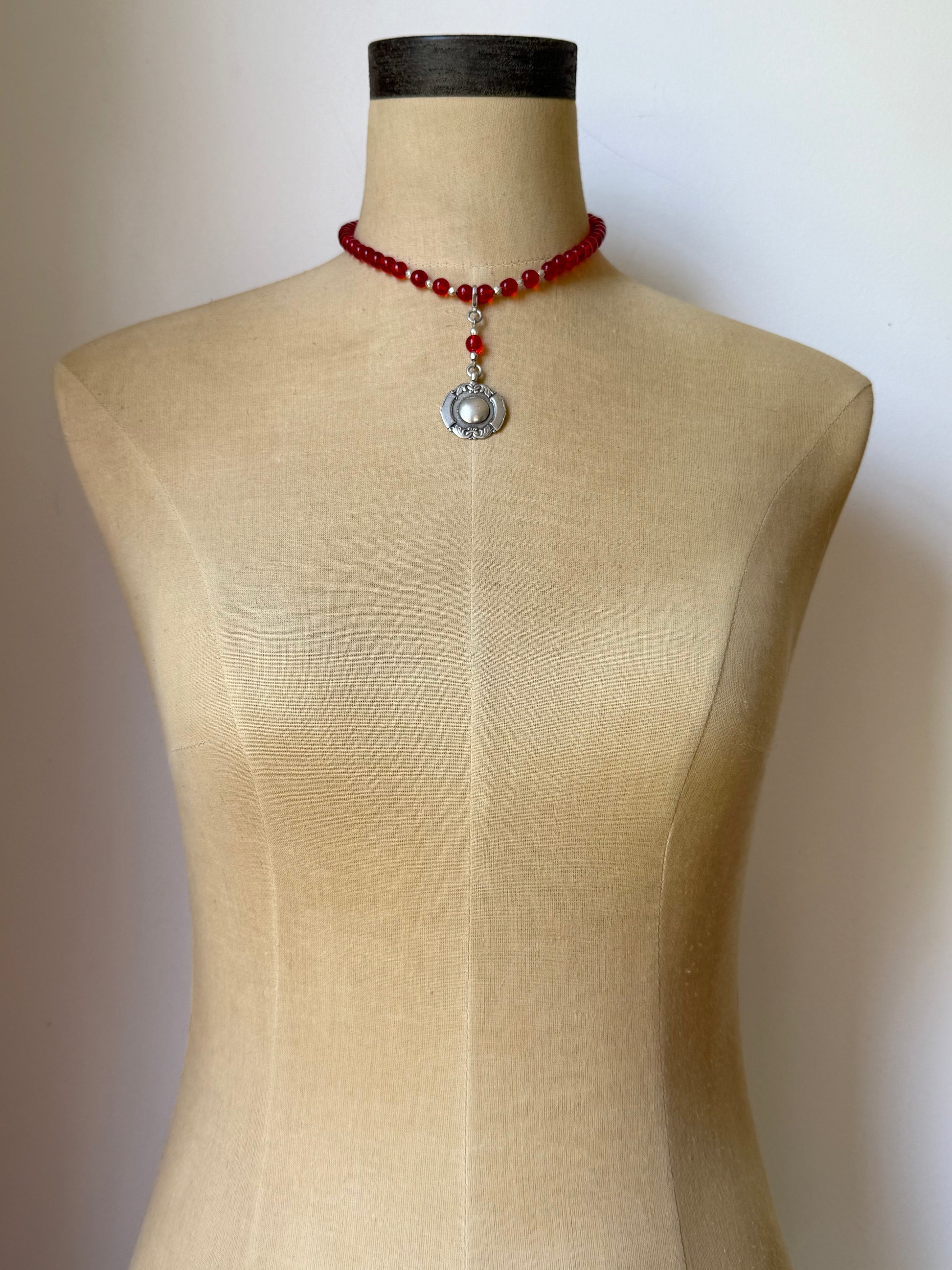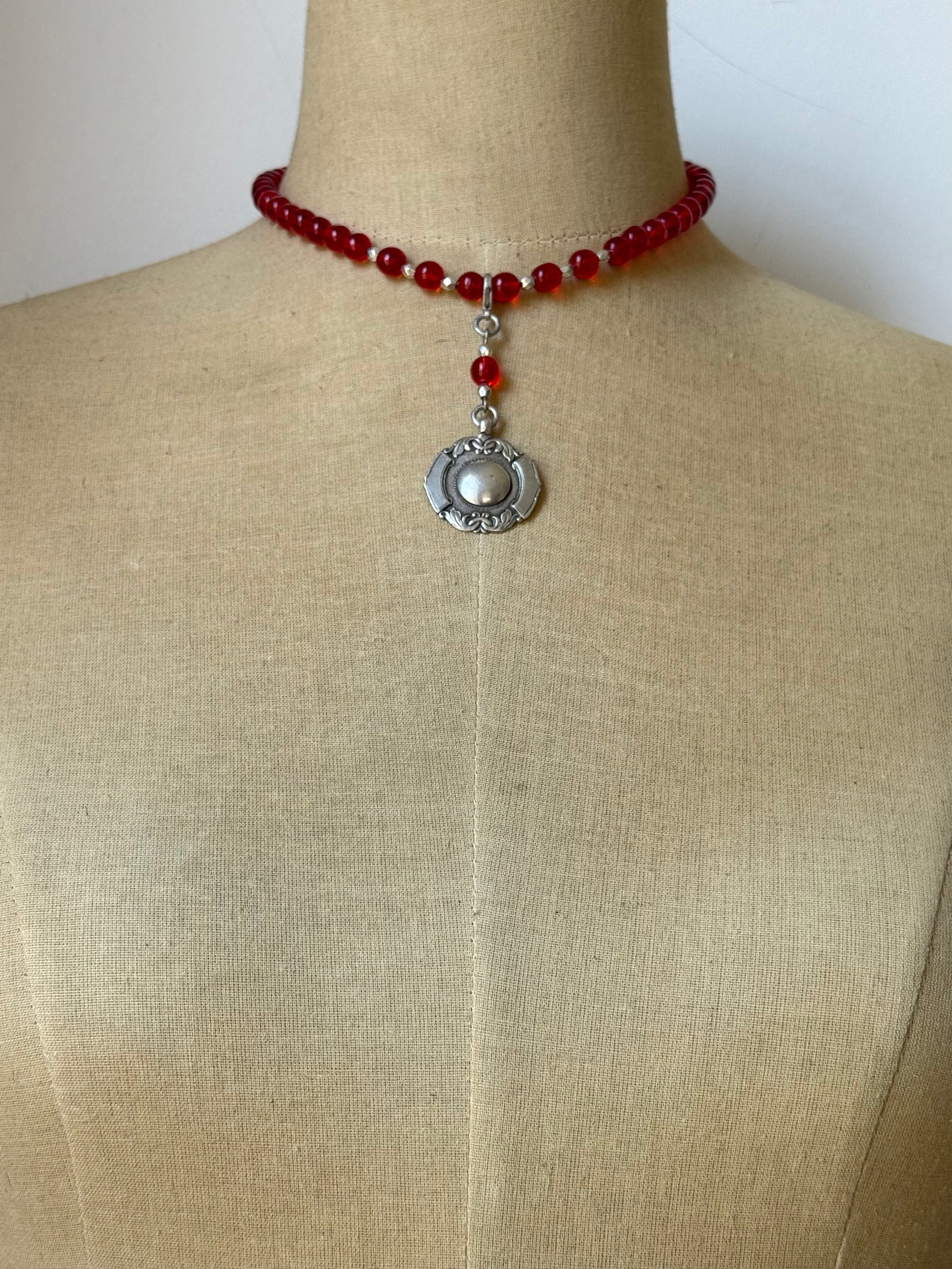 a sterling silver treasure from 1929, this ornate fob pendant carries a storied past, once awarded as a prize and lovingly engraved on the reverse to honor the winner of a junior cup. richly detailed with vintage craftsmanship, the pendant now finds new life as the focal point of a hand-beaded chain, meticulously reworked from a mid-century red glass necklace. the fiery glass beads echo the pride and spirit of its original accolade. finished with an antique silver plated toggle clasp, this piece bridges legacy and artistry in a timeless design.