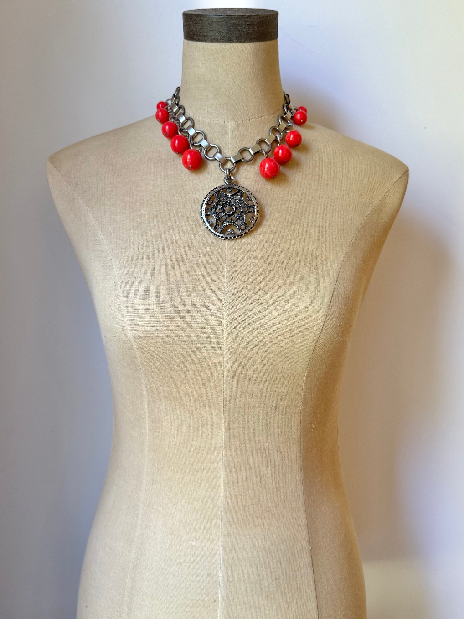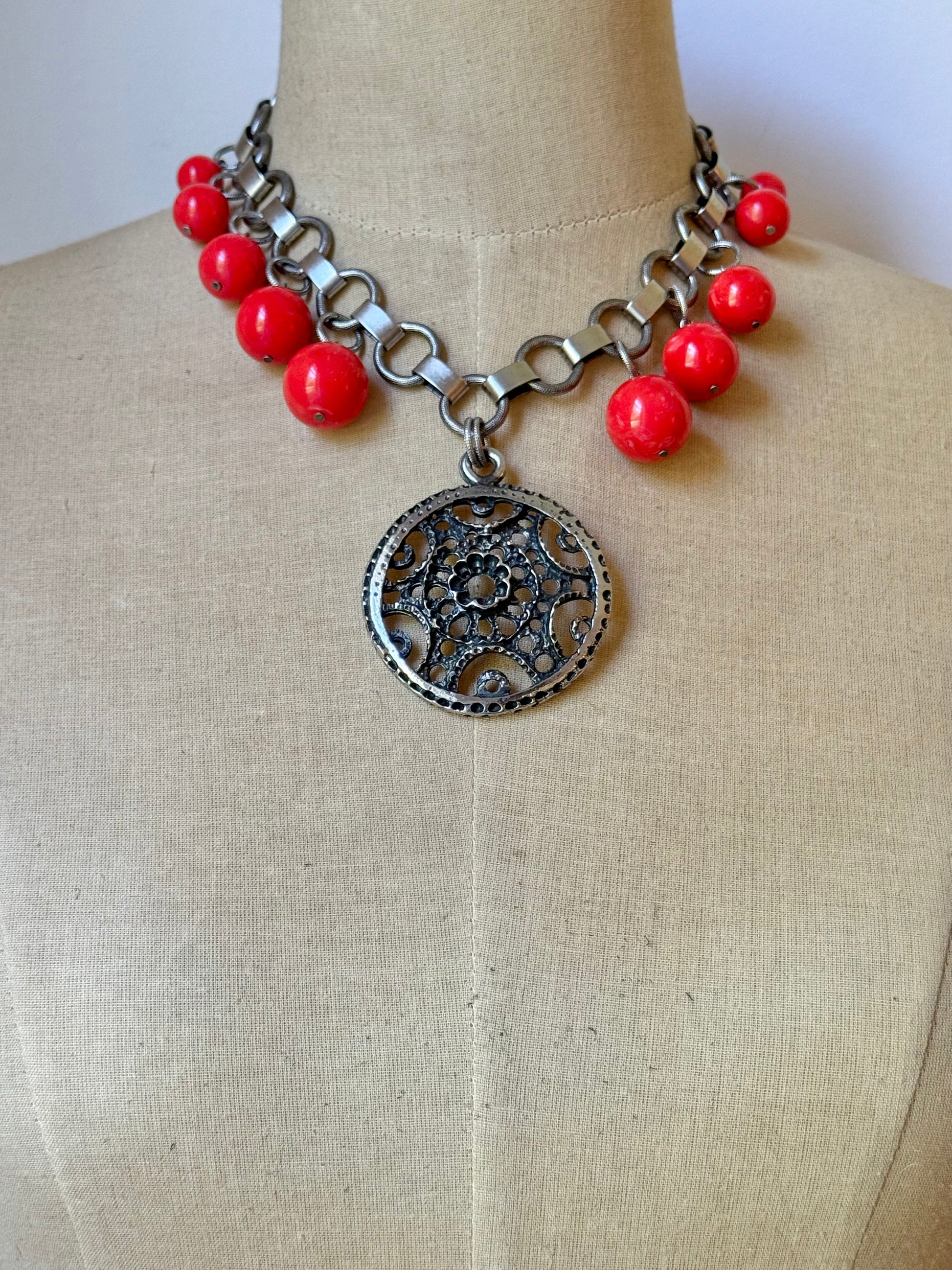 the pendant rests on a large antique silver-plated textured link chain, a substantial lead-free strand whose movement echoes classic mid-century scandinavian design. bold hits of color come from vintage japanese lucite beads in a true coral red—salvaged from an original 1970s necklace and repurposed here to bring a bright, warm vibrancy. the coral tone adds a radiant contrast against the cool oxidized pewter, creating a compelling interplay of warmth and shadow.