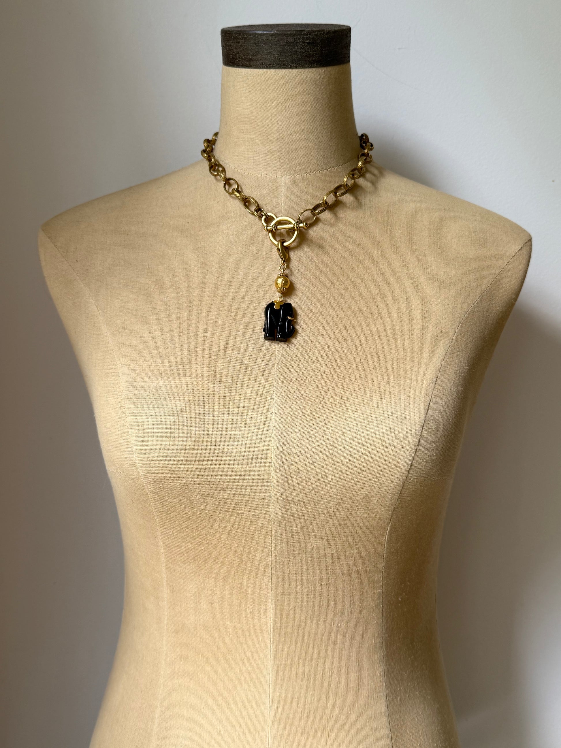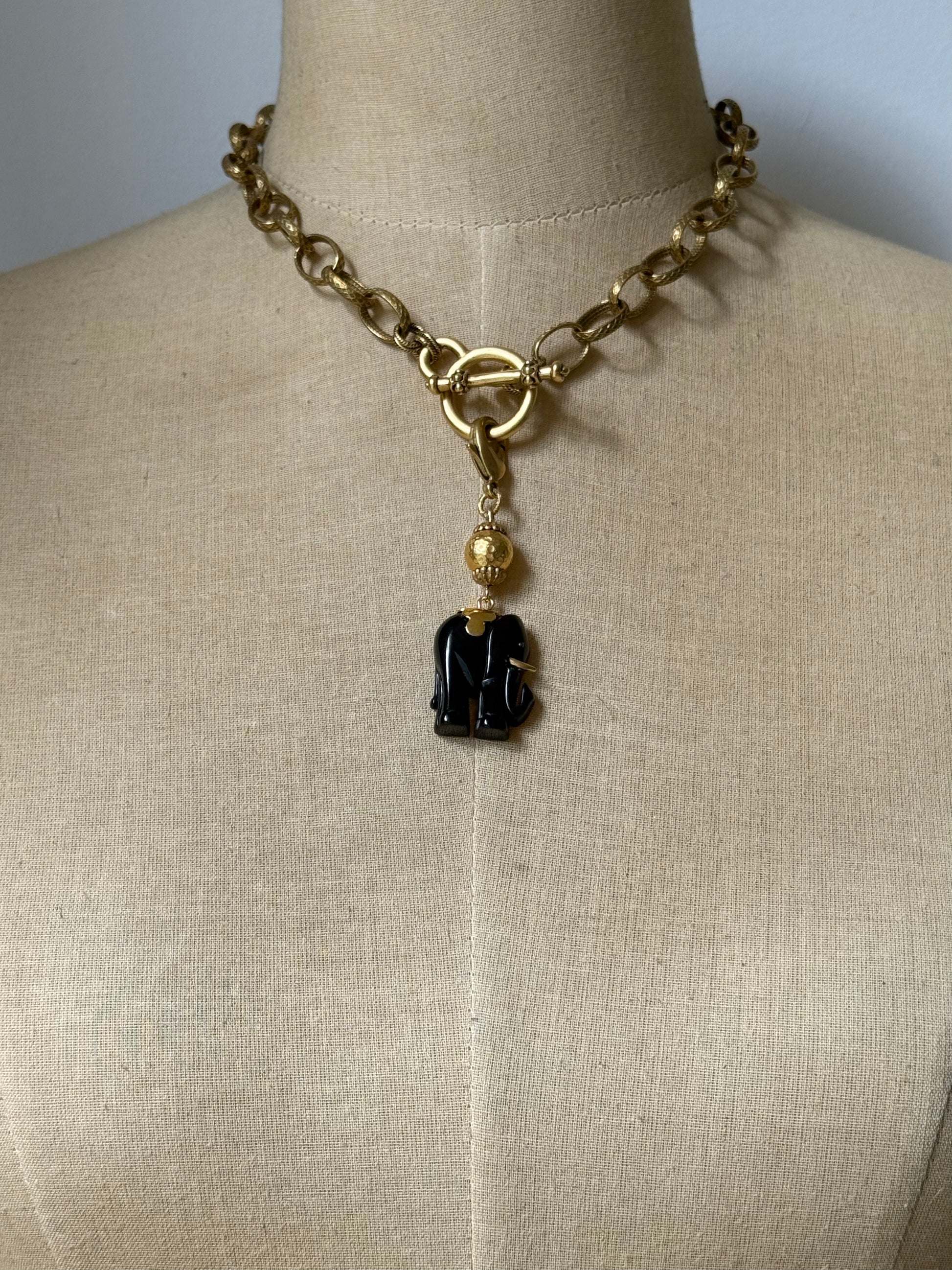 add a whimsical touch to your jewelry collection with this vintage lucite and brass elephant. it’s accented with 1950’s bead caps and hammered gold plated brass bead that adds a touch of texture. thoughtfully assembled, the pendant is attached to a toggle clasp via a brass lobster claw to a beautiful vintage brass detailed chain.