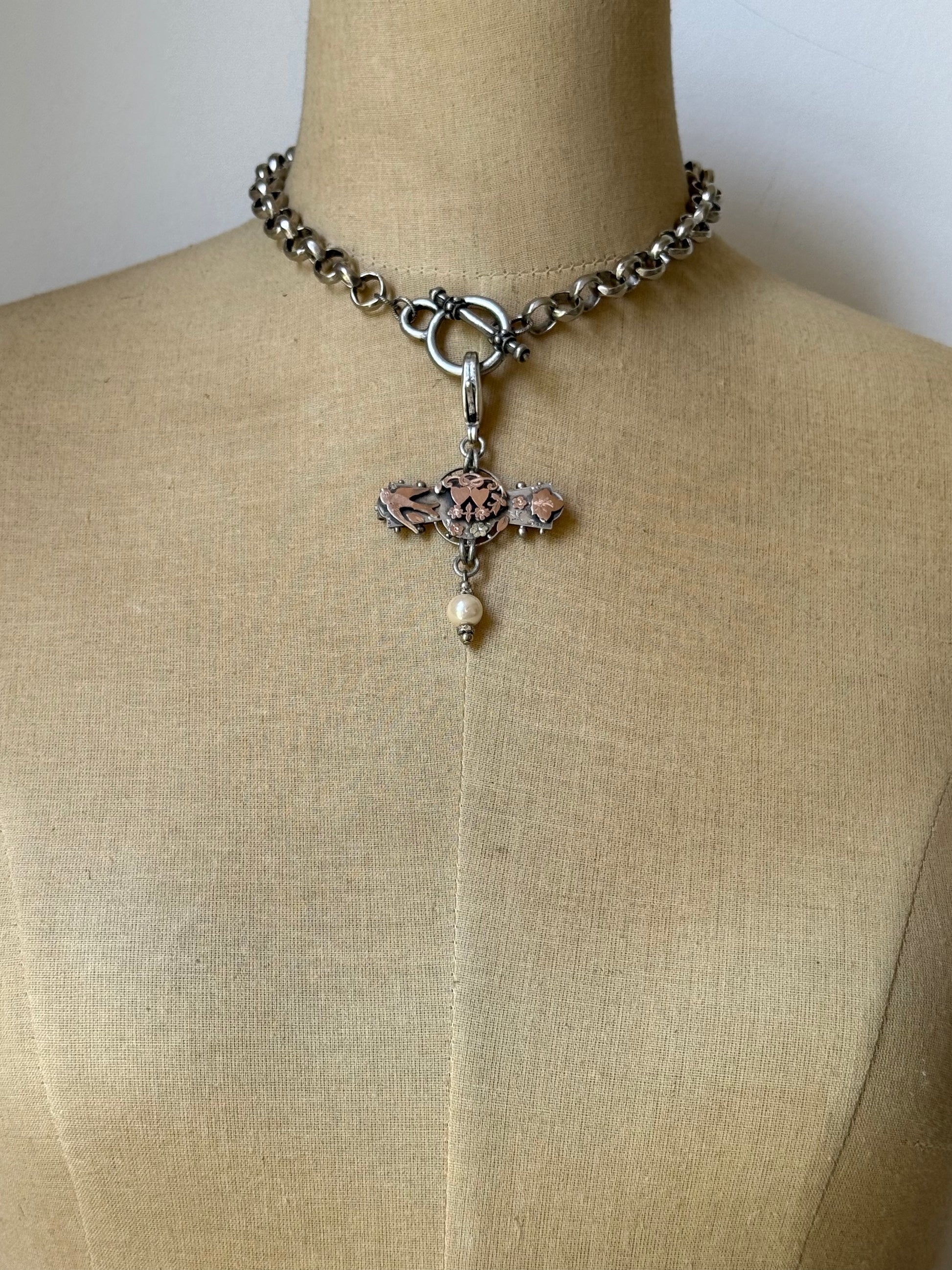 oversized antique silver plated brass lobster claw clasp hangs from large antique pewter finished pewter toggle clasp. lead and cadmium free.