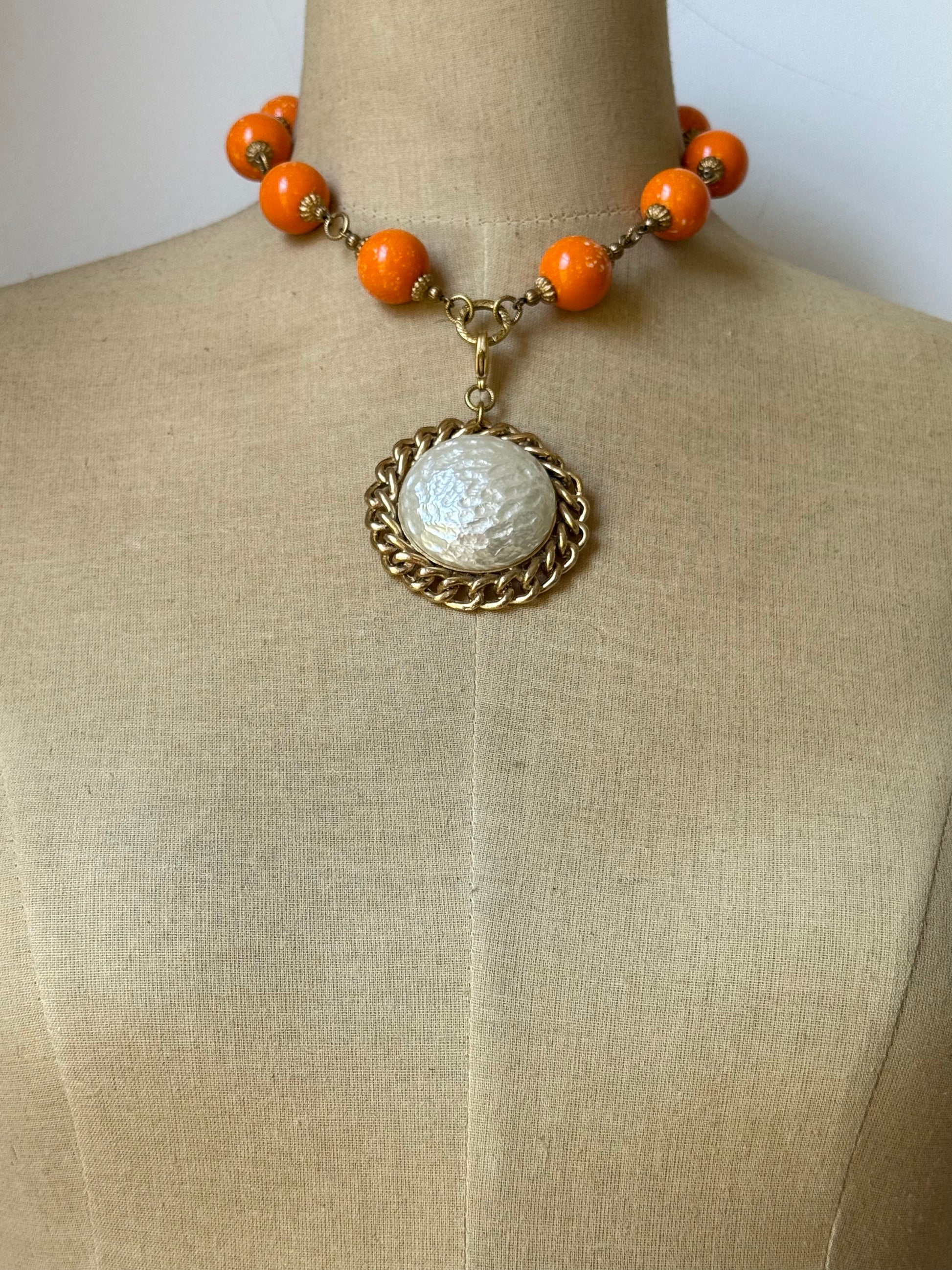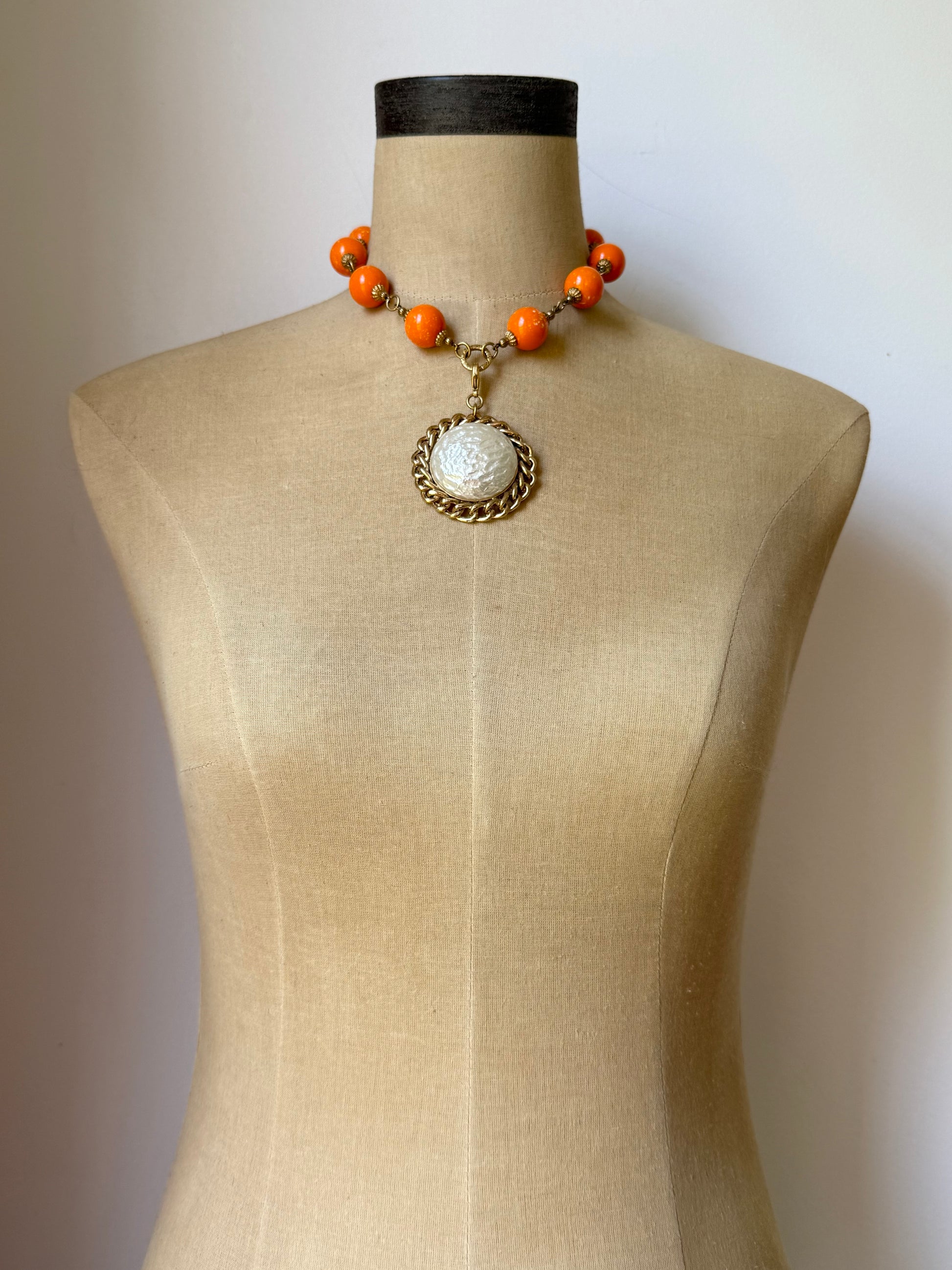 handmade chain with vintage italian orange lucite beads accented with 1950’s brass bead caps and small vintage brass ribbed beads.