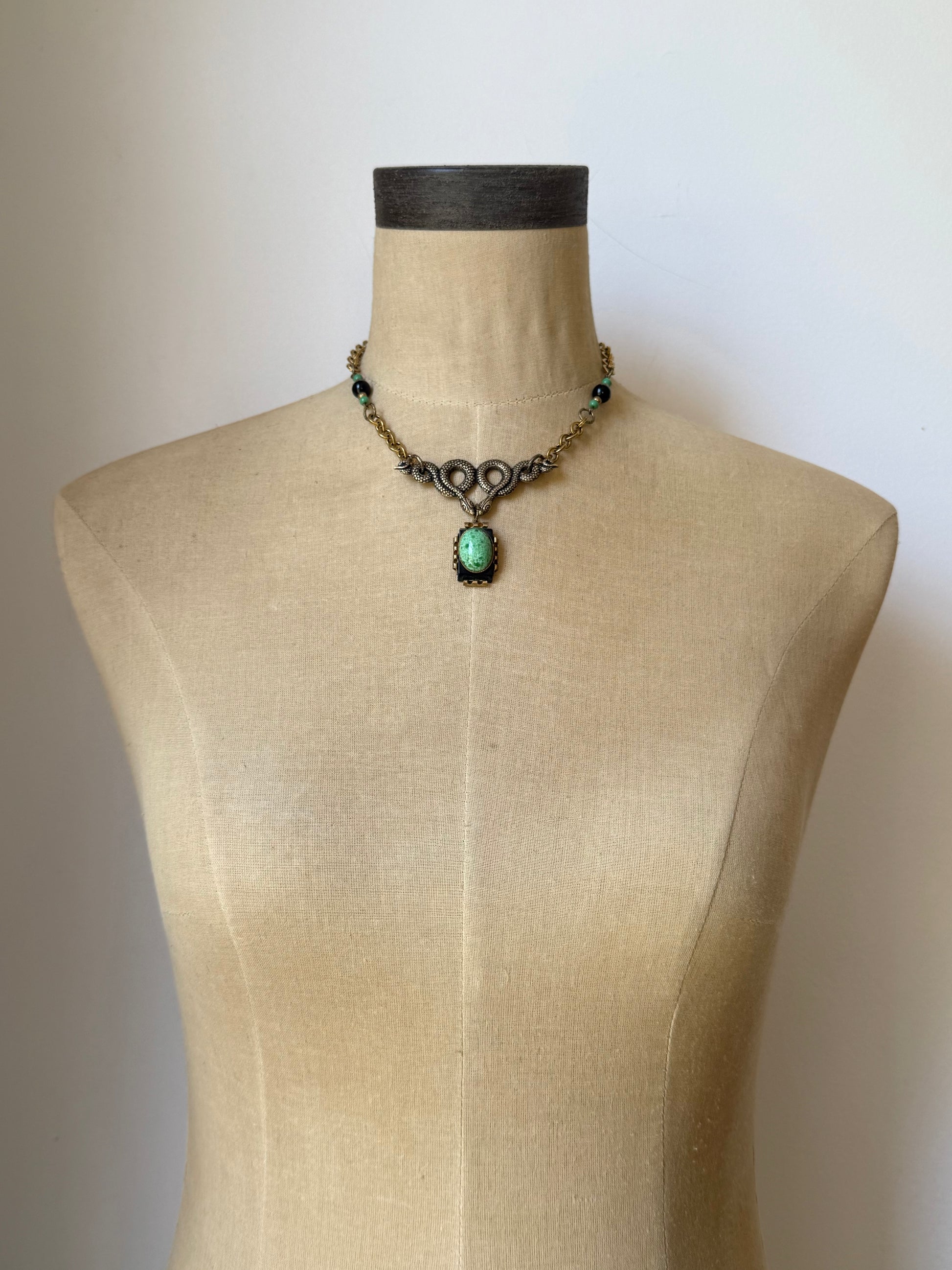 handmade chain with vintage jade green glass beads, small vintage ribbed brass beads and modern day 12k gold plated steel chain with hammered antique gold plated pewter clasp.